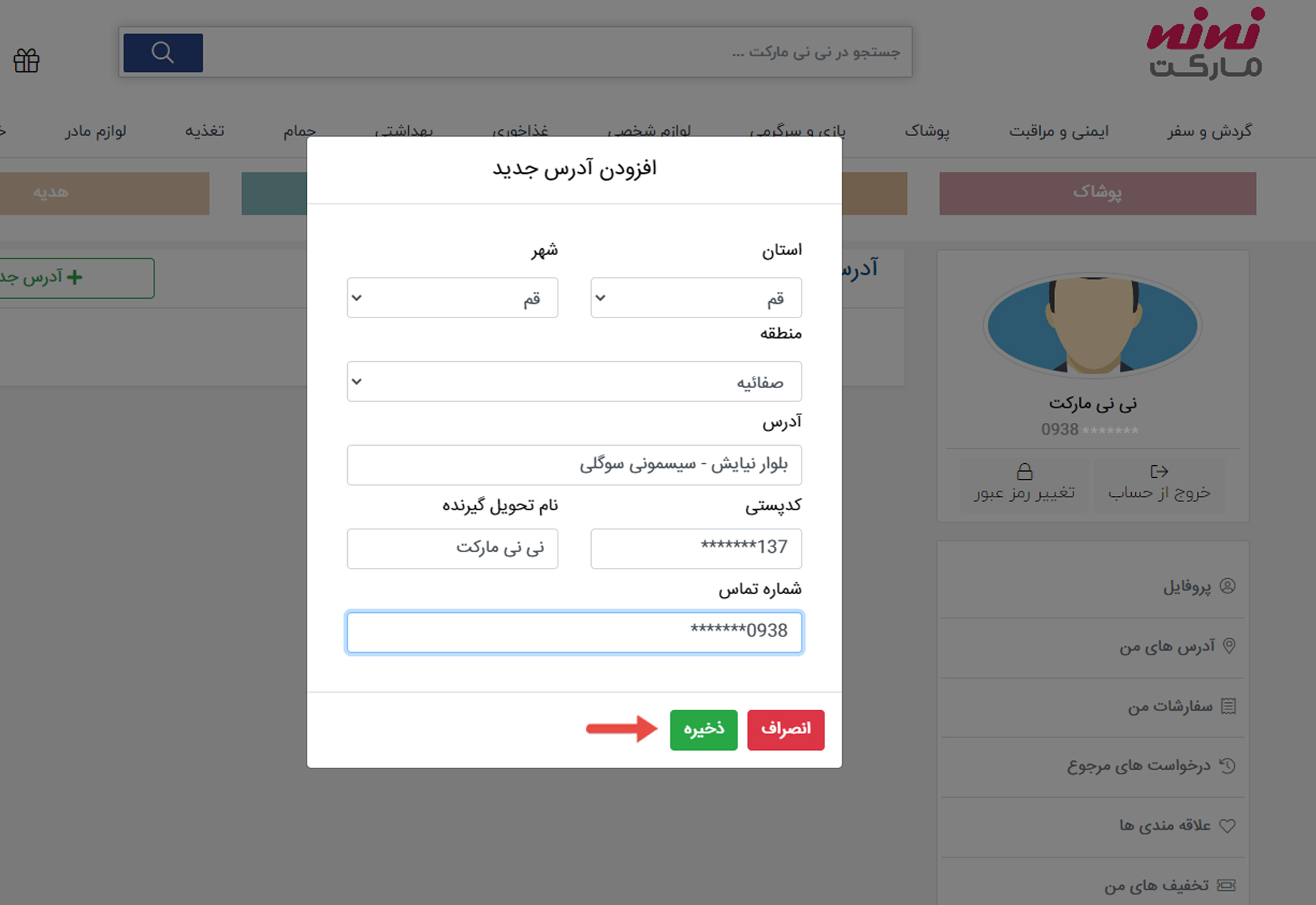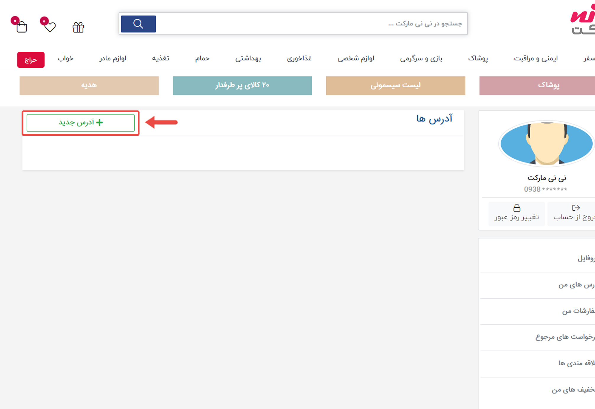 2. با کلیک روی آدرس جدید میتوانید چند آدرس به حساب کاربری خود اضافه کنید .