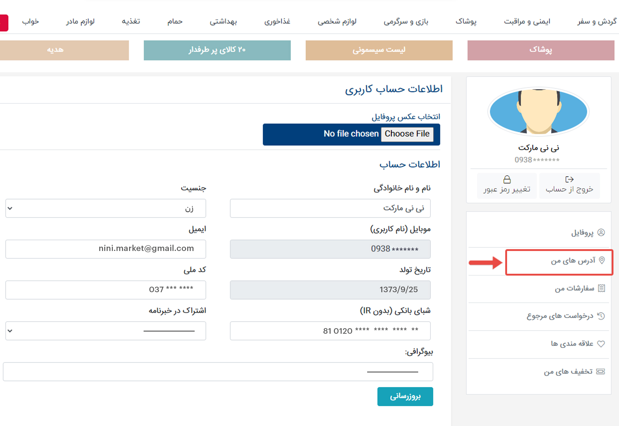1. پس از تکمیل اطلاعات کاربری خود به قسمت آدرس های من مراجعه نمایید.
