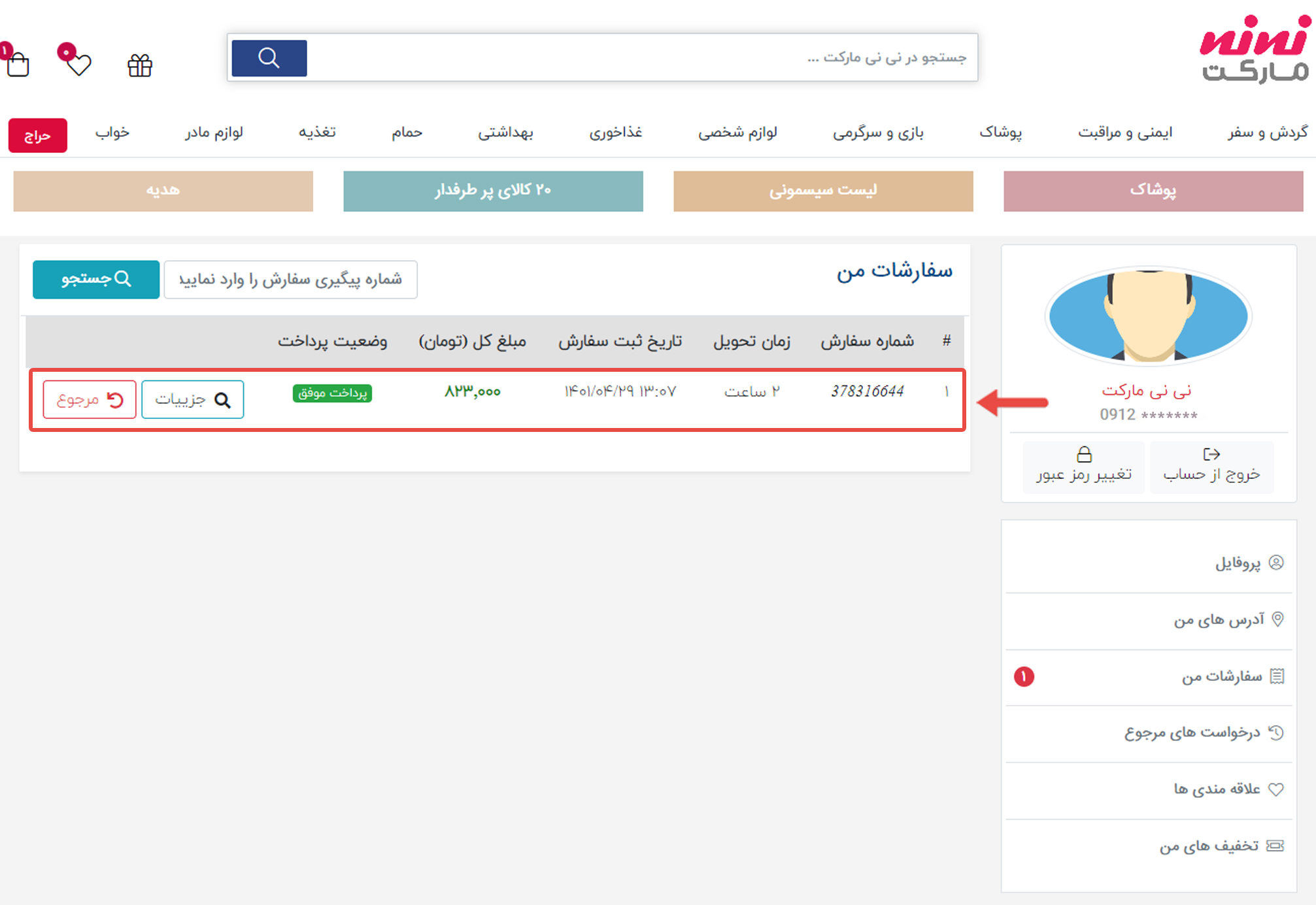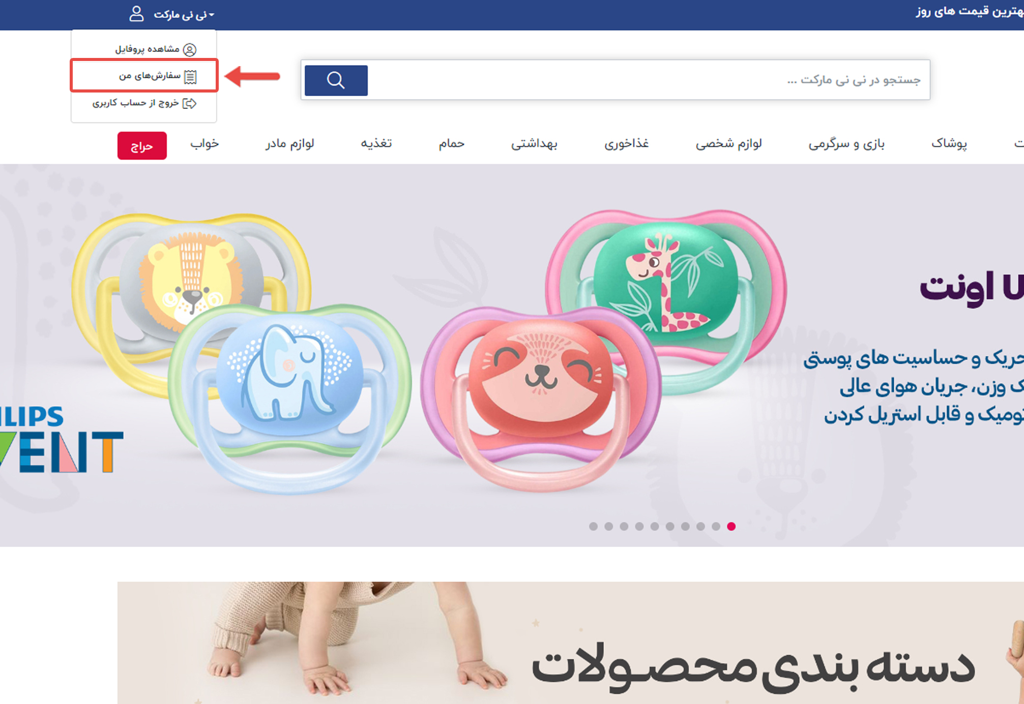 1.وارد سایت نی نی مارکت شوید. روی گزینه سفارش های من کلیک کنید.