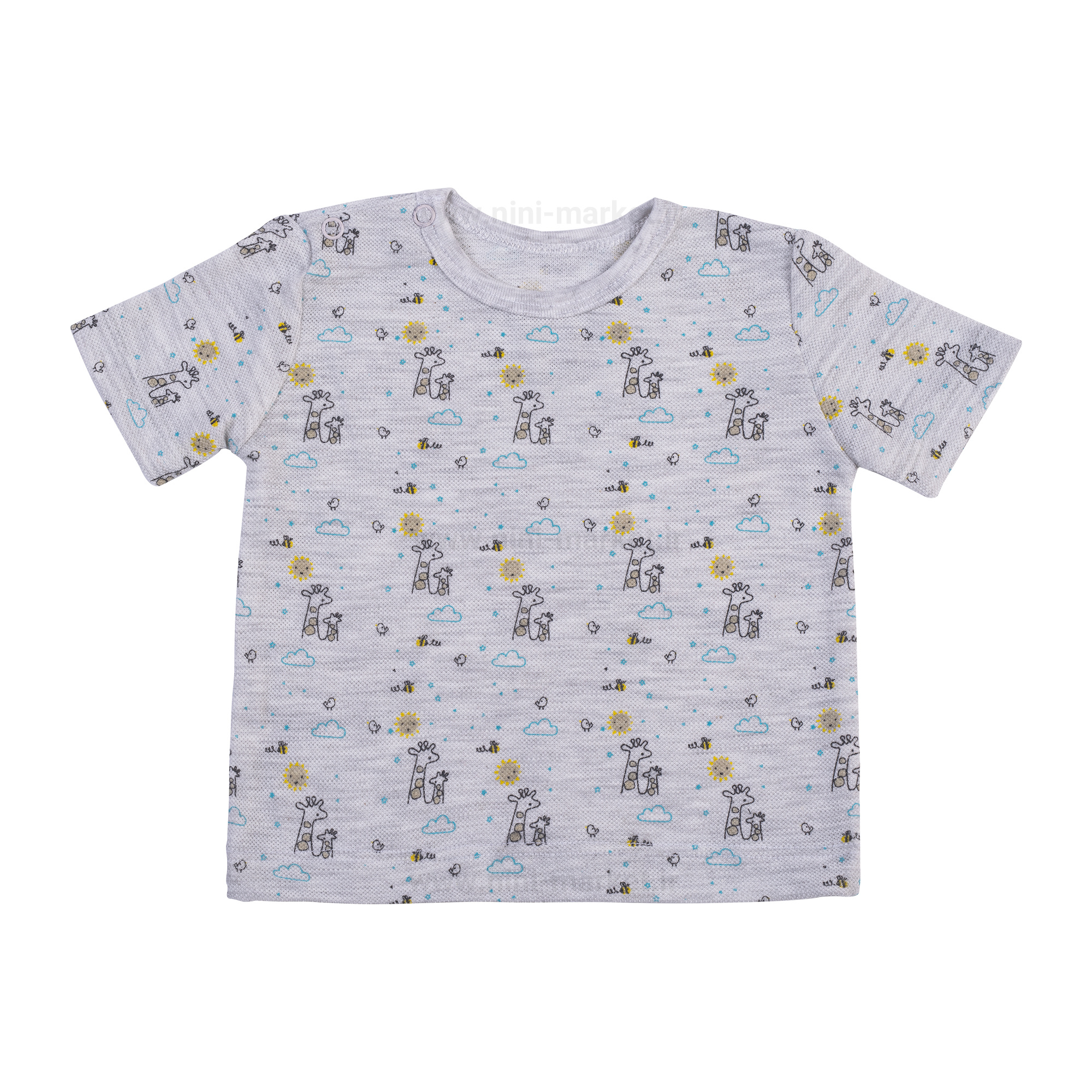 بلوز آستین کوتاه طرح سانی پولونیکس یک تیشرت نخی است که از تعریق و عرق سوز شدن کودک در فصل تابستان جلوگیری می کند. طرح روی آن شامل زرافه- خورشید- ابر چاپ شده است . در قسمت سر شانه آن دو دکمه وجود دارد که برای در آوردن و پوشاندن راحت بلوز بر تن نوزاد استفاده می شود.
