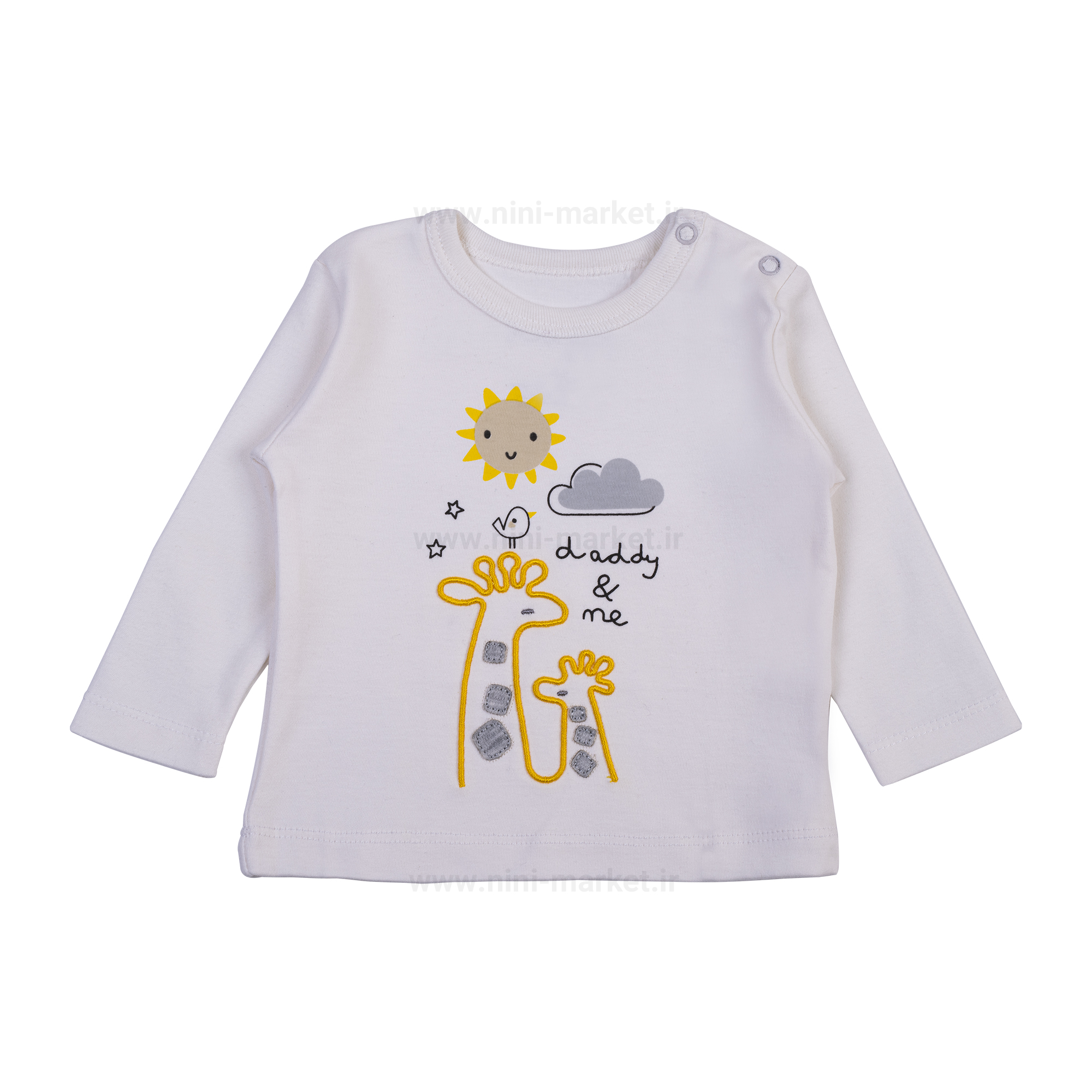 بلوز آستین بلندطرح سانی پولونیکس یک بلوز نخی است . طرح روی آن شامل زرافه- خورشید- ابر چاپ و گلدوزی شده است. بلوز آستین بلند پولونیکس در قسمت سرشانه دارای دو دکمه است که برای راحت در آوردن و پوشاندن لباس بر تن نوزاد می توانید دکمه ها را باز کنید تا بلوز به سر کودک گیر نکند و موجب کلافگی کودک نشود.