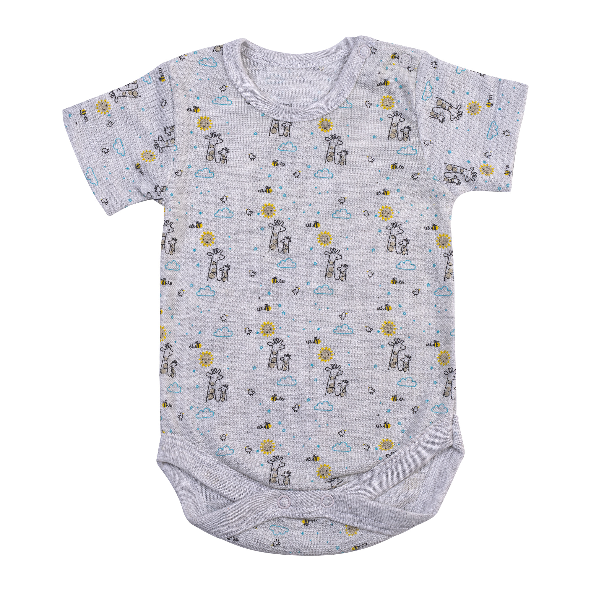 بادی آستین کوتاه پولونیکس رنگ زمینه طوسی دارد و طرح زرافه و خورشید و ابر روی آن به صورت پترن چاپ شده است. در قسمت سرشانه بادی آستین کوتاه دو دکمه و قسمت پایین آن نیز دو دکمه وجود دارد. برای راحت تر پوشاندن لباس بر تن کودک دلبندتان است.