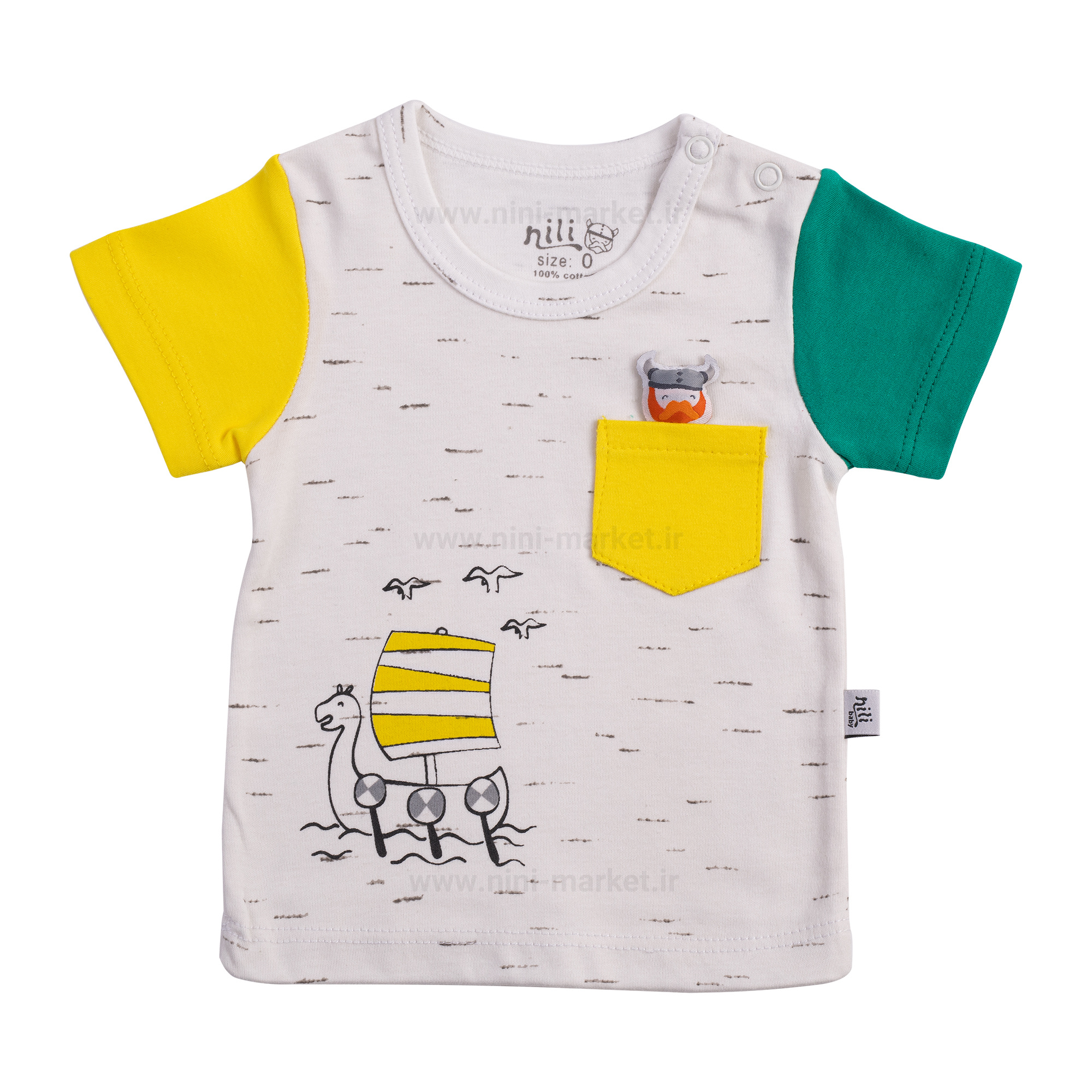 آستین کوتاه طرح وایکینگ برند نیلی Nili با رنگی زیبا برای ست کردن. پارچه کاملا ضد حساسیت است و به پوست نوزاد آسیبی وارد نمی کند. روی سینه لباس یک جیب کوچک که یک کاراکتر برجسته مرد وایکینگ دارد و در پایین بلوز یک کشتی چاپ شده است. بالای بلوز دو دکه وجود دارد تا در هنگام پوشاندن لباس به سر کودک گیر نکند و موجب اذیت آن نشود. این لباس به صورت تکی و به عنوان یک تاپ برای فصل گرم سال مورد استفاده است.