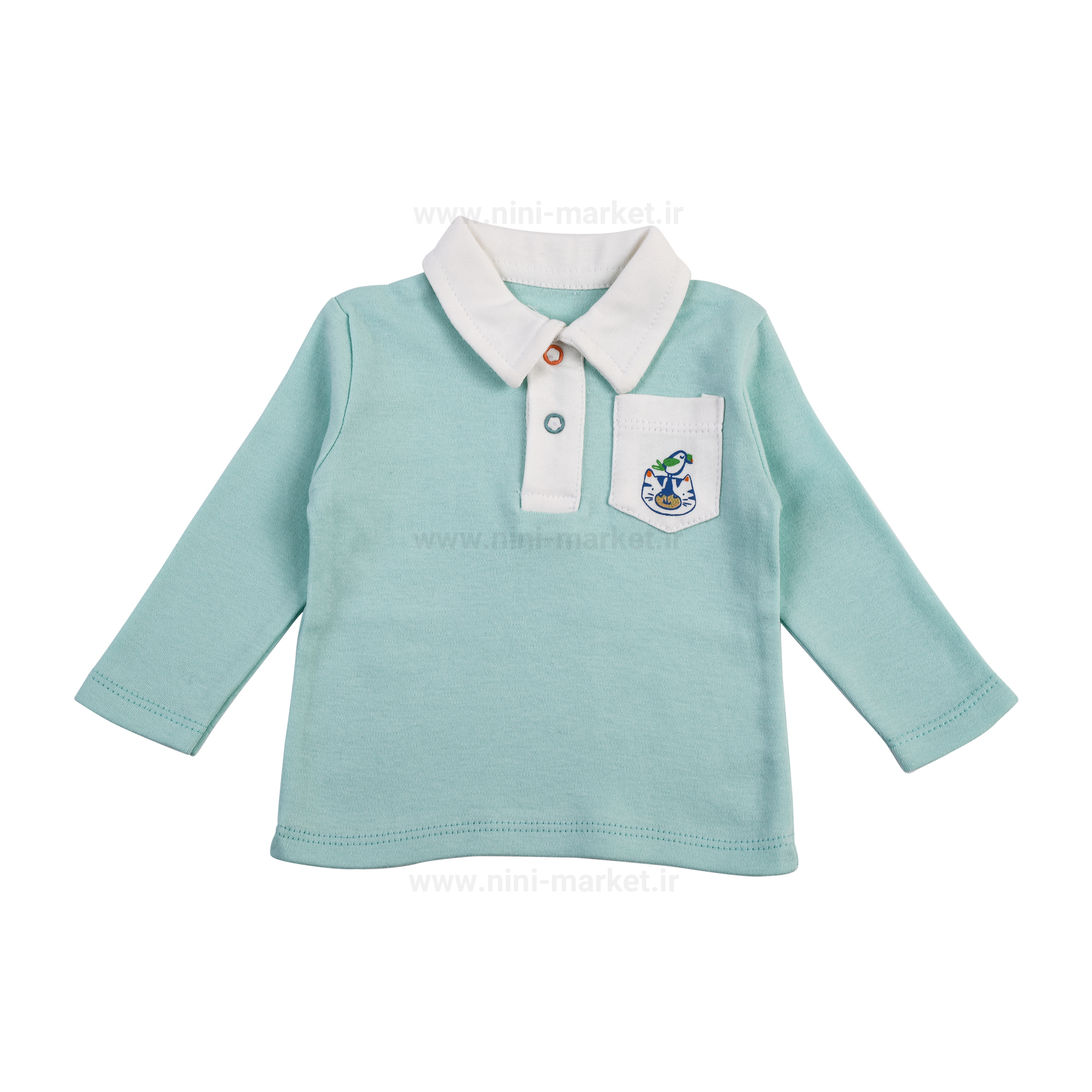 بلوز آستین بلند نوزادی طرح جنگل پولونیکس یک بلوز آستین بلند یقه دار است که در قسمت جلوی یقه ی آن دو دکمه وجود دارد- برای در آوردن و پوشاندن راحت بلوز بر تن نوزاد استفاده می شود. روی سینه لباس یک جیب کوچک با طرح شیر- پرنده وجود دارد. جنس آن نرم، لطیف، نخی و ضد حساسیت می باشد و به پوست کودک صدمه و آسیبی وارد نمی کند. در قسمت یقه لباس دو دکمه وجود دارد که برای در آوردن و پوشاندن راحت بلوز بر تن نوزاد استفاده می شود.