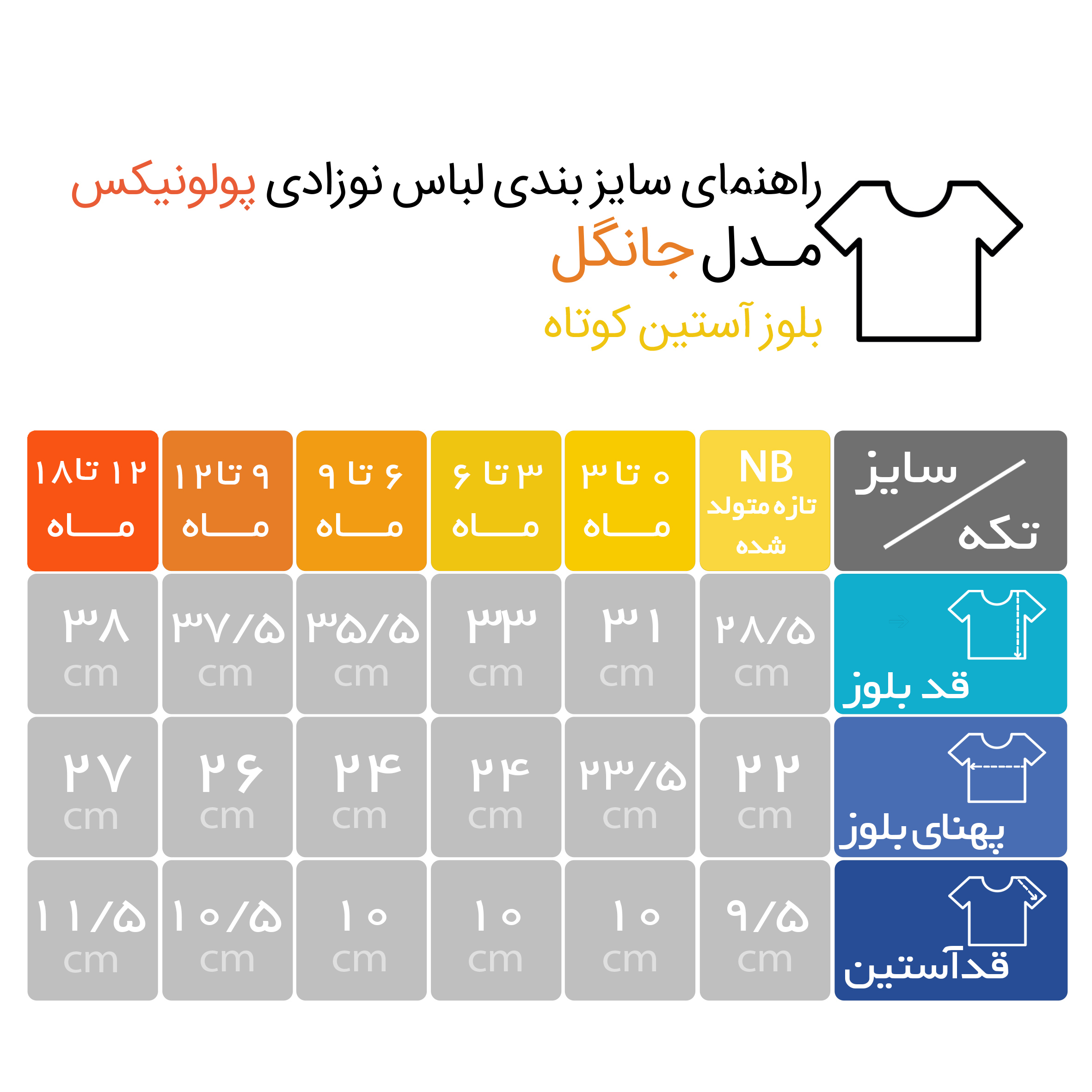 جنس آن نرم و لطیف است و هیچ گونه حساسیتی برای پوست فرزند شما ایجاد نمی کند. بلوز آستین کوتاه طرح جانگل پولونیکس یک تیشرت نخی است که از تعریق و عرق سوز شدن کودک در فصل تابستان جلوگیری می کند. طرح روی آن شیر- میمون –پلنگ و درخت نخل چاپ شده است. در قسمت یقه لباس دو دکمه وجود دارد که برای در آوردن و پوشاندن راحت بلوز بر تن نوزاد استفاده می شود.
