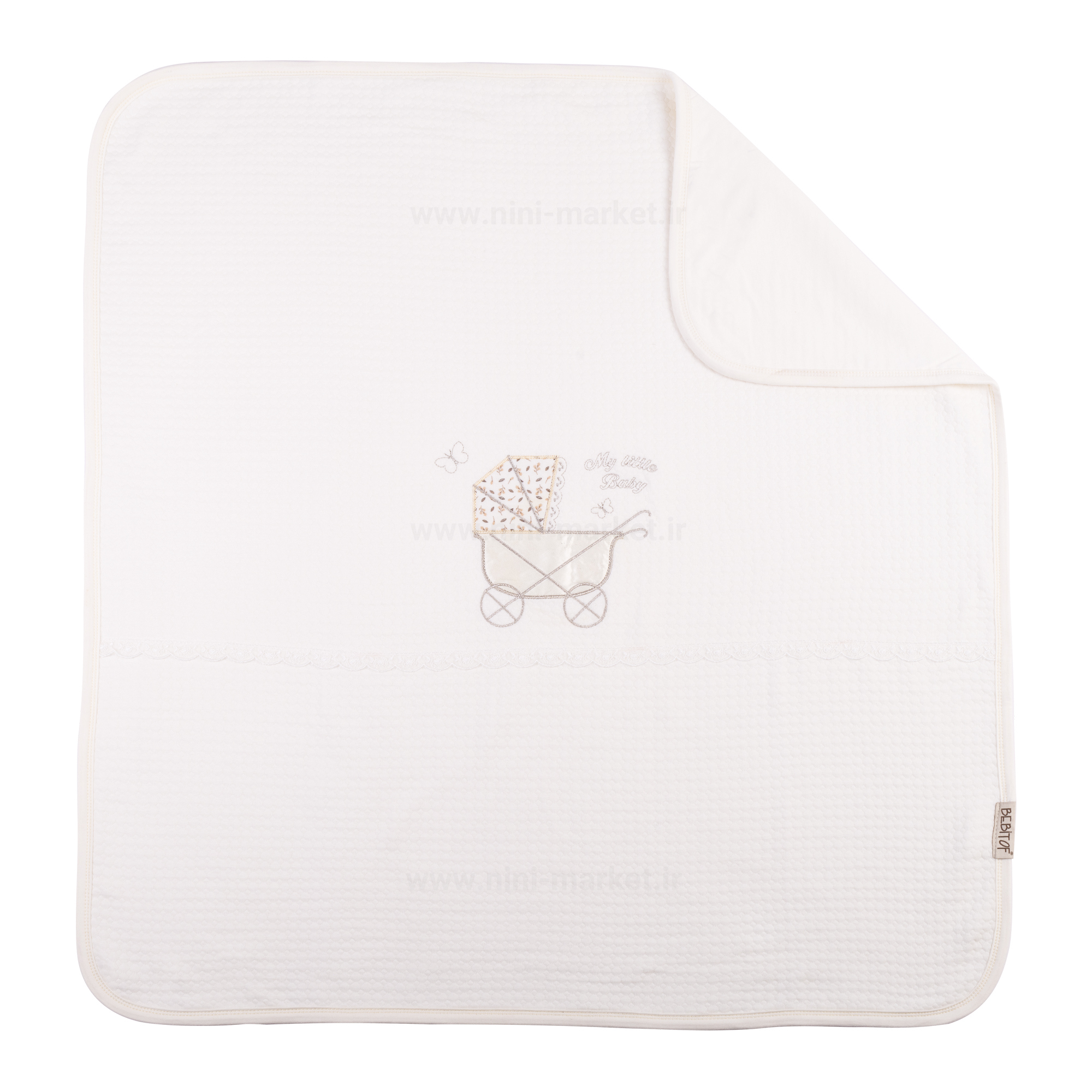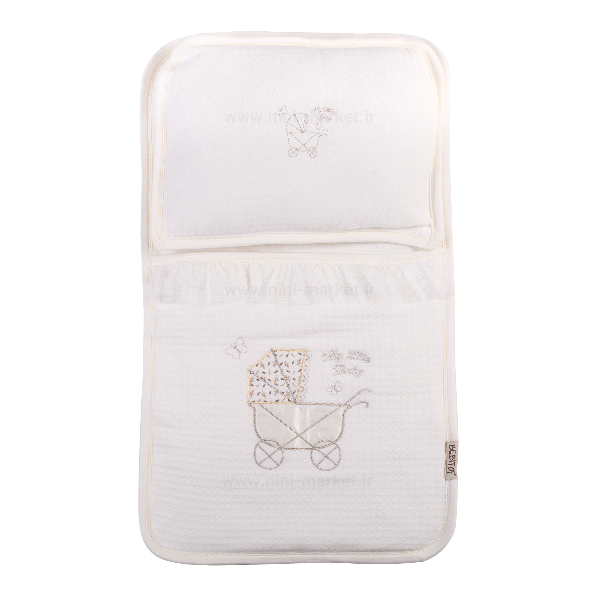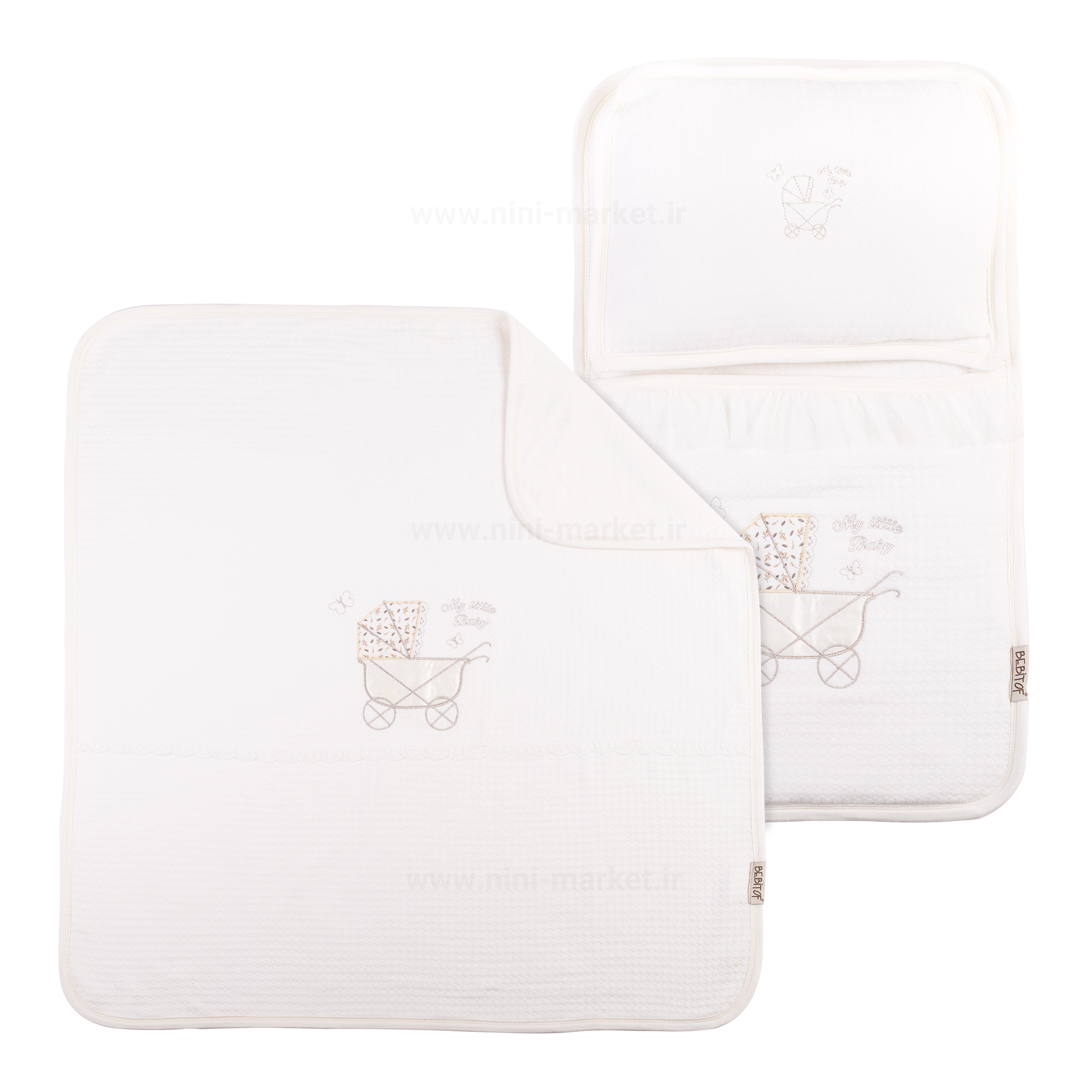 این ست سه تکه دارای یک تشک - بالشت و پتوی نوزادی است. جنس رویه از کتان ژاکارد نرم و بسیار با کیفیت می باشد . تشک این را می توان به عنوان قنداق و کیسه خواب مورد استفاده قرار داد. یکی از ویژگی های این محصول سه تکه این است که بالش و پتو را می توانید داخل تشک جا داد با این کار فضای کمتری برای حمل این سه تکه اشغال می شود. دارای یک کاور زیپ دار به منظور پیشگیری از آلودگی سه تکه در هنگام حمل و نقل است. این کاور به شما این امکان را می دهد تا به سادگی این رختخواب را همراه خود بیرون از منزل، به گردش یا مسافرت ببرید. رنگ زمینه کرم و طرح کلی این کالا کالسکه که به صورت تکه دوزی و گل دوزی در آمده است .