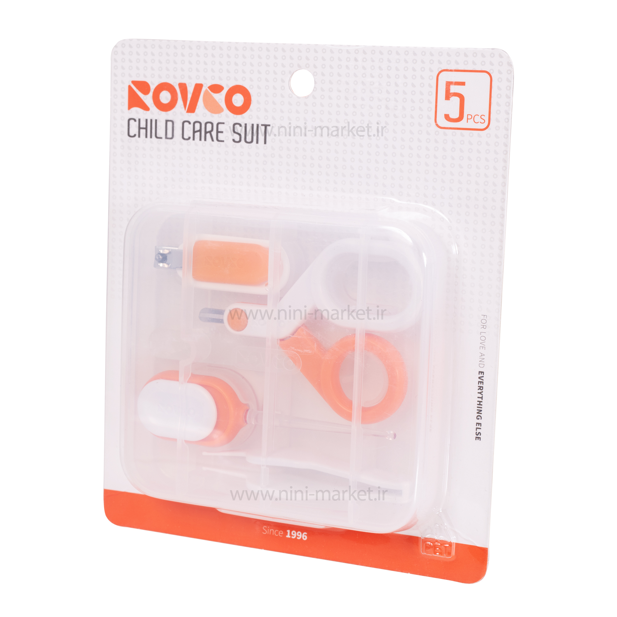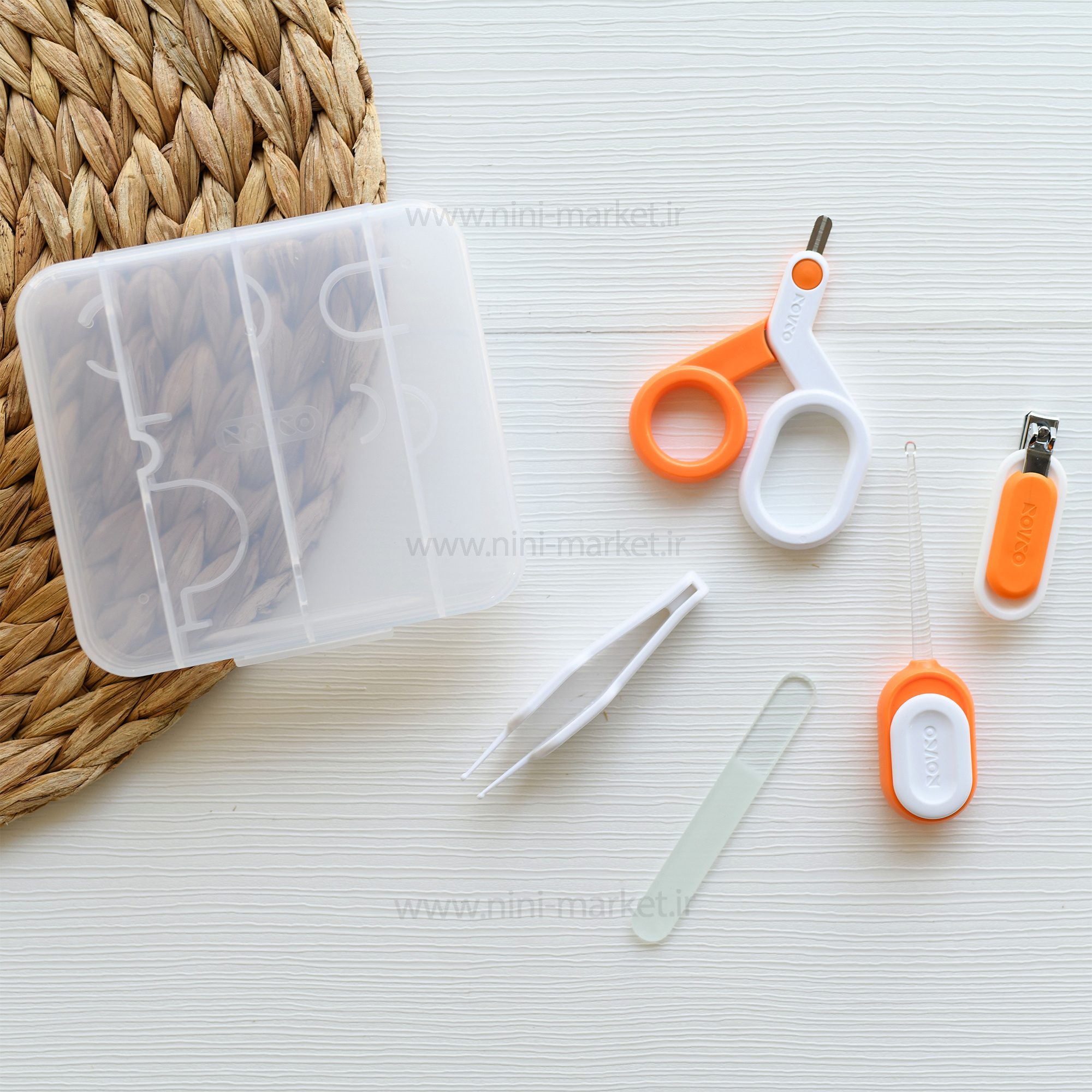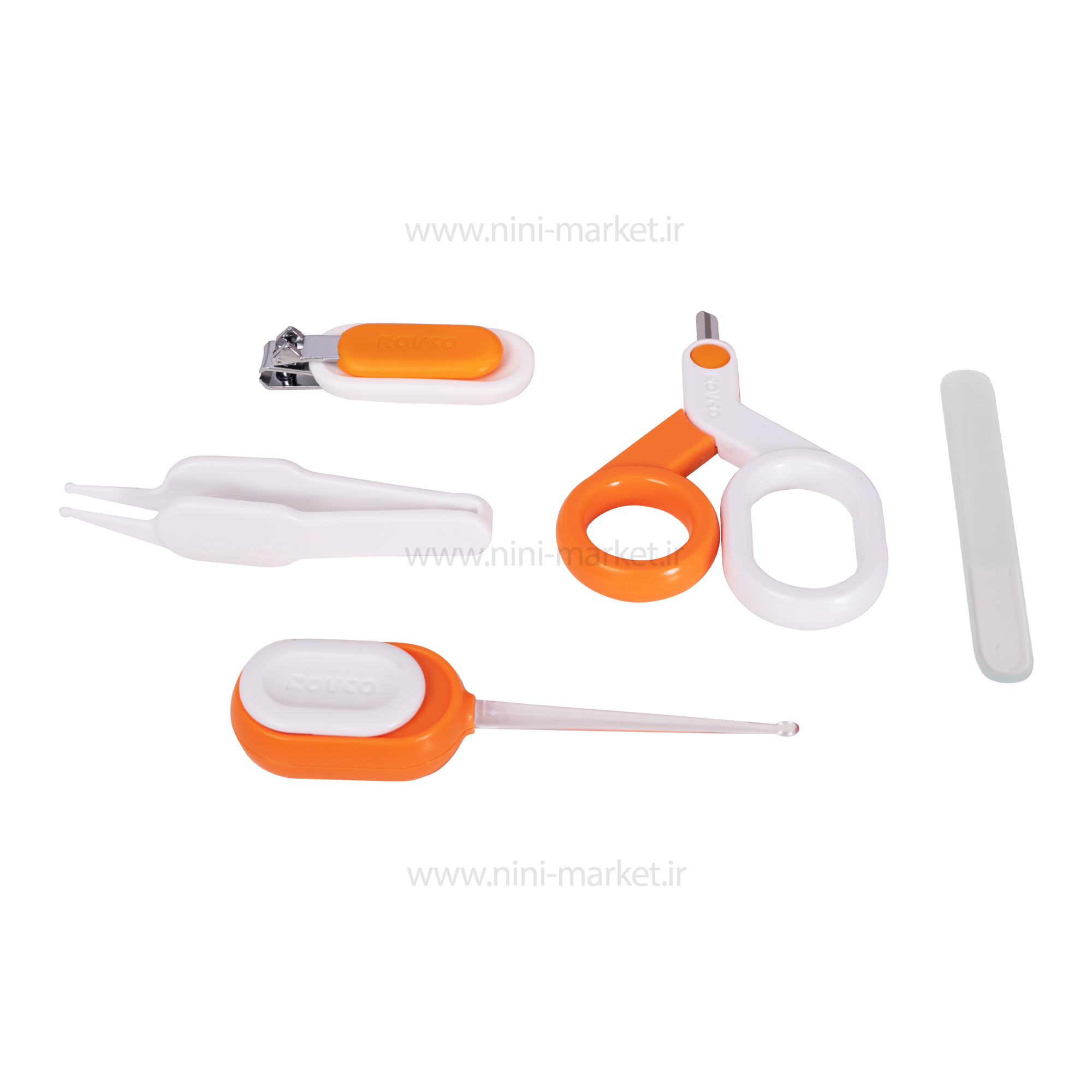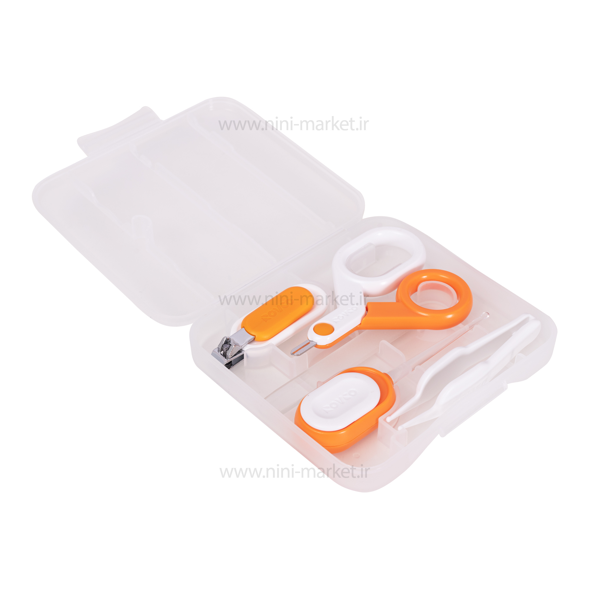 قیچی این ست با سری گرد و ایمن و دسته های بزرگ و مناسب است.انبر کوچک (موچین پلاستیکی) برای تمیز کردن پرز های بینی و گوش نوزاد مورد استفاده قرار میگیرد .سوهان آن برای صاف کردن بخش های تیز ناخن مورد استفاده است.سری ناخن گیر دارای انحنای مناسب برای سهولت ناخن گرفتن است.دسته نیز دارای فرم راحت برای استفاده ی بدون مشکل والدین است.بدنه و دسته ی ناخن گیر از جنس پلی پروپلین و تیغه از جنس استیل است.گوش پیک دارای سری با نور LED است که سبب می شود بتوانید کانال گوش نوزاد را به راحتی مشاهده کنید.با فشار دادن دسته ی گوش پیک، نور آن روشن می شود.این ست دارای یک جعبه ی زیبا و شکیل است که حمل و نگهداری آن را ساده می کند.