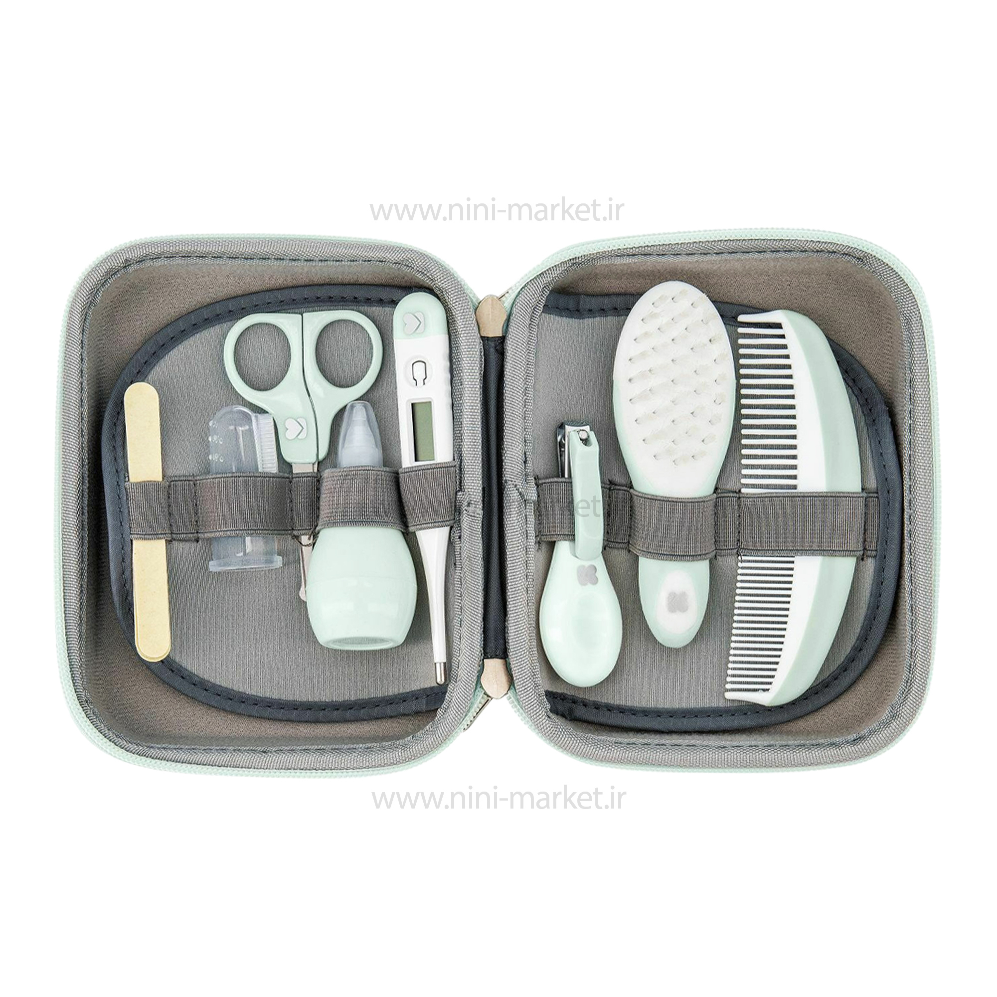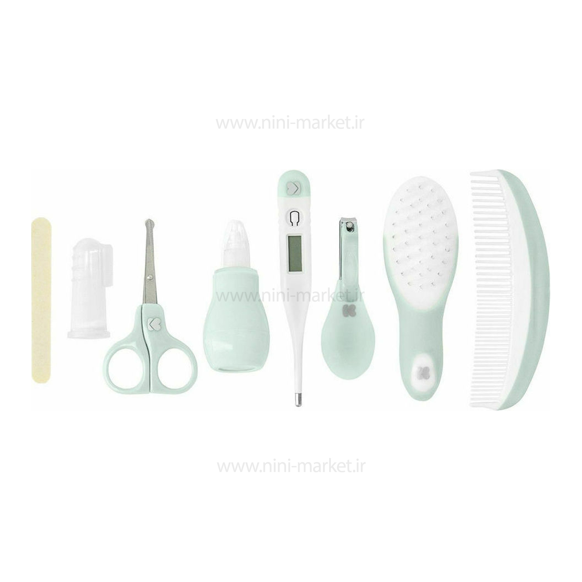 زمانی که نوزاد شما دچار سرماخوردگی می شود، نیاز به یک پوار بینی بیشتر احساس می شود. با کمک این فین گیر می توان ترشحات و مخاط بینی نوزاد را تخلیه کنید تا راحت تر نفس بکشد.دارای سری سیلیکونی نرم و منعطف و قدرت مکش مناسب است. قیچی تهیه شده از استیل ضد زنگ با لبه ی گرد کاملا ایمن برای گرفتن ناخن نوزاد است. دسته ی آن طوری طراحی شده که به سادگی در دستان مادر قرار می گیرد.ناخنگیر این ست با ابعادی مناسب و لبه ی استیل برای گرفتن ناخن های ظریف نوزاد است، همچنین 3 عدد سوهان ناخن برای از بین بردن تیزی های ناخن نوزاد دارد.موهای برس تهیه شده از الیاف نرم و دندانه های شانه به طور یکی در میان سری گرد دارد که محافظ سر نوزاد است.تب سنج با صفحه ی نمایشگر دیجیتالی مناسب برای استفاده زیر زبان، زیر بغل و مقعد است.با کمک داروخوری این ست می توانید بدون مشکل، شربت و دارو را به نوزاد بدهید.مسواک انگشتی دارای پرز های نرم و سیلیکونی؛ برای مسواک زدن دندان های ریز و تازه درآمده نوزاد بسیار مناسب است.کمک به رشد درست دندان ها، استحکام آنها، ماساژ دهنده ایمن و مناسب لثه از دیگر ویژگی های مسواک انگشتی است.فاقد بو و از هیچ ماده ی مضر و سمی مانند بیسفنول آ BPA در ساخت آن استفاده نشده است.این مسواک انگشتی به راحتی روی انگشت سبابه مادر قرار می گیرد.یک کیف همراه این ست است که همه ی تکه ها به طور مرتب داخل آن قرار می گیرد.