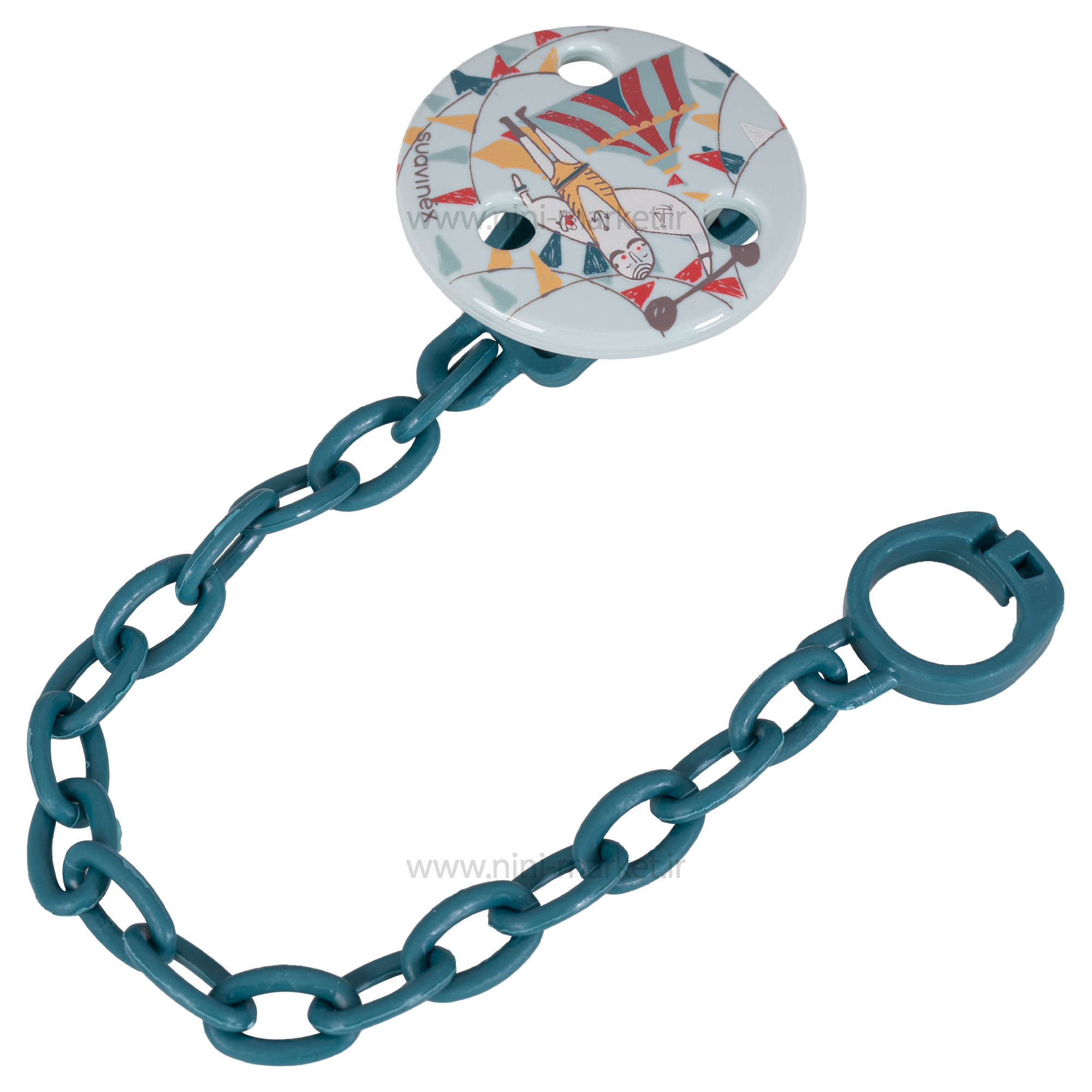 بند پستانک زنجیره ای طرح سیرک برند Suavinex مناسب برای اتصال به انواع پستانک نوزاد دلبندتان است.این بند از یک سمت به لباس نوزاد و از سمت دیگر به پستانک متصل می شود.با استفاده از این بند پستانک دیگر نگران افتادن و آلودگی پستانک نوزاد خود نباشید.این بند قابل اتصال به پستانک های دسته دار است. جنس این محصول تهیه از پلاستیک مرغوب و فاقد مواد شیمیایی و مضر برای نوزاد است .