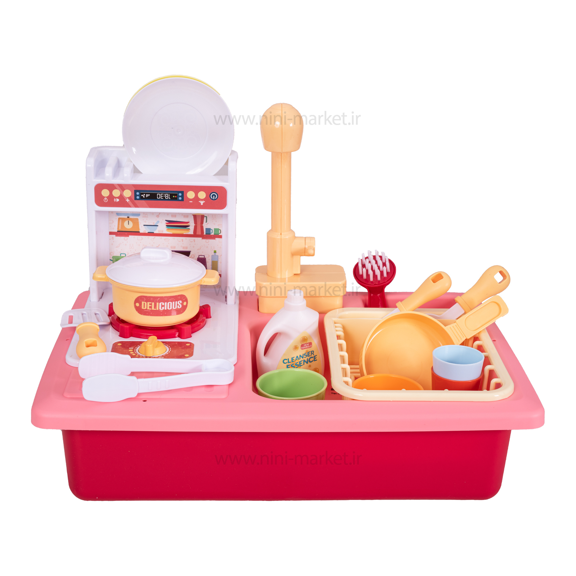 سرویس اسباب بازی مدل سینک ظرفشویی باتری خور یک اسباب بازی مهیج و سرگرم کننده است که کودک با شستشوی ظروف حس خوبی را تجربه می کند. با ریختن آب داخل سینک و چرخاندن شیر آب، پمپ آب که توسط دو عدد باطری 1.5 ولت تغذیه می شود روشن شده و آب را از دهانه شیر آب سرازیر می کند و کودک می تواند با قرار دادن ظروف که داخل بسته بندی قرار دارد ، شروع به شستن آنها کند. این محصول یک هدیه جذاب و جدید برای کودکان شماست خرید این محصول را به شما پیشنهاد می کنیم . این ظرفشویی یک سرویس ظرفشویی اسباب بازی برقی می باشد که با محفظه نگهداری آبی که در آن قرار داده شده است می تواند مثل یک ظرفشویی واقعی از شیر آب آن آب خارج شده داخل سینک ریخته شود و از داخل سینک مجدد به داخل محفظه آب برای استفاده مجدد ریخته می شود و این چرخه ادامه دارد. با این اسباب بازی کودک خود را عاشق کار خانه کنید. سینک ظرفشویی با سیستم چرخش آب اتوماتیک(شیر آب) یک اسباب بازی در حیطه مهارت زندگی است. این اسباب بازی برای بازیهای فردی ، گروهی و یا همان خاله بازیها کاربرد دارد. بچه ها عاشق تقلید کردن از بزرگترها و انجام کارهایی هستند که آنها انجام می دهند این سینک ظرفشویی بخاطر ظاهر واقعیش آن را به یک اسباب بازی پرطرفدار در میان کودکان تبدیل کرده است.