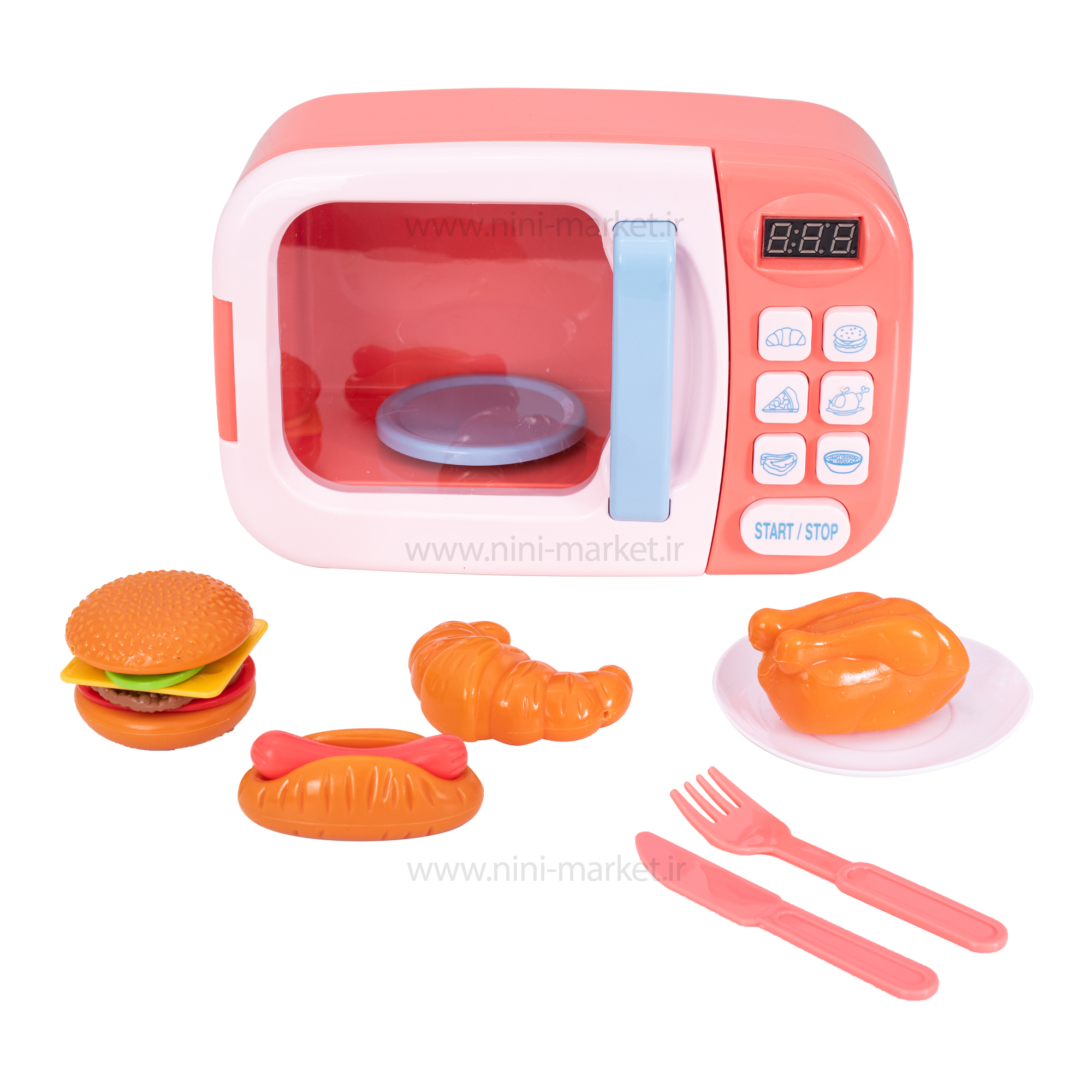 اسباب بازی آشپزخانه مایکروویو شامل: - مرغ – پیراشکی – همبرگر – هاداگ -بشقاب – چنگال- چاقو است. این اجاق مایکروویو تقریبا شبیه یک اجاق گاز واقعی است! غذا به داخل می چرخد، فر روشن می شود و با فشار دادن دکمه ها متوقف می شود. این مجموعه شامل غذاهای اسباب بازی و ظروف است. بازی با چنین لوازم خانگی برای کودک بی خطر است و به او این فرصت را می دهد که احساس کند یک فرد بالغ و مستقل است. 360 درجه می چرخد و دو باتری رای روشن کردن آن لازم دارد.