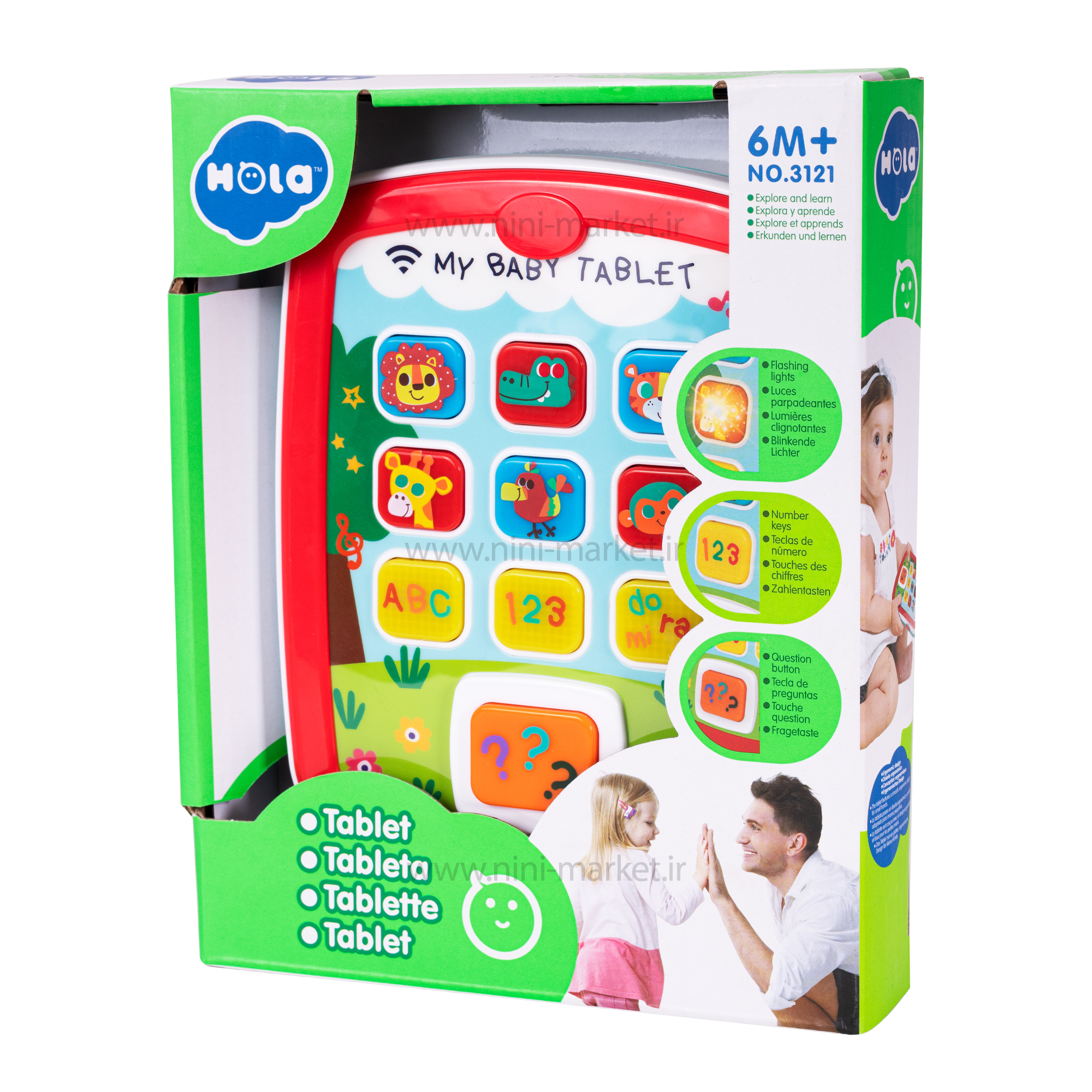 تبلت آموزشی هولا که از برند معتبر هالی تویز است یک اسباب بازی موزیکال با نور و صدا هست که میتواند بسیار برای کودک جذاب باشد. دکمه علامت سوال را که کودک میزند دستگاه از کودک سوال های مختلفی میپرسد که با راهنمایی و نور و صدا به کودک کمک میکند تا گزینه صحیح را پیدا کند. دکمه با تصویر اعداد را که بزنید اعداد 1 تا 3 را صدا میکند برای آموزش کودک. دکمه حروف ABC هم حروف A و B و C را با صدا پخش میکند. دکمه های رنگی با شکل حیوانات نیز اسم رنگ آن و اسم حیوان و صدای آن حیوان را پخش میکند. این تبلت آموزشی بسیار کودک را سرگرم میکند. این وسیله نیاز به 3 عدد باتری نیم قلمی AAA برای راه اندازی دارد. مصرف باتری بسیار بهینه است. رنگ این اسباب بازی بدون سرب و مواد مضر هست.