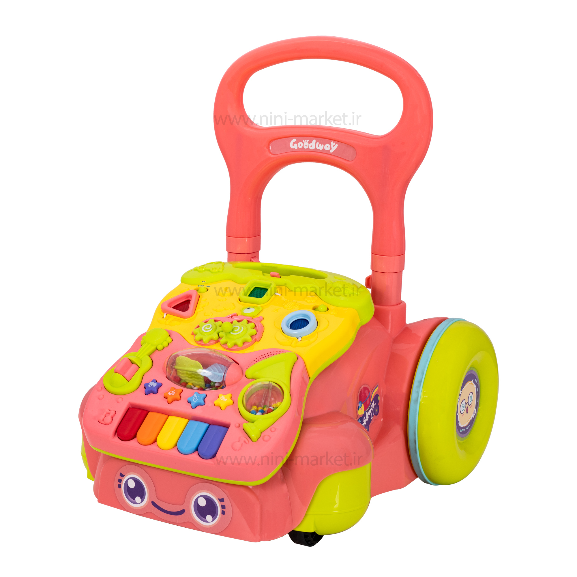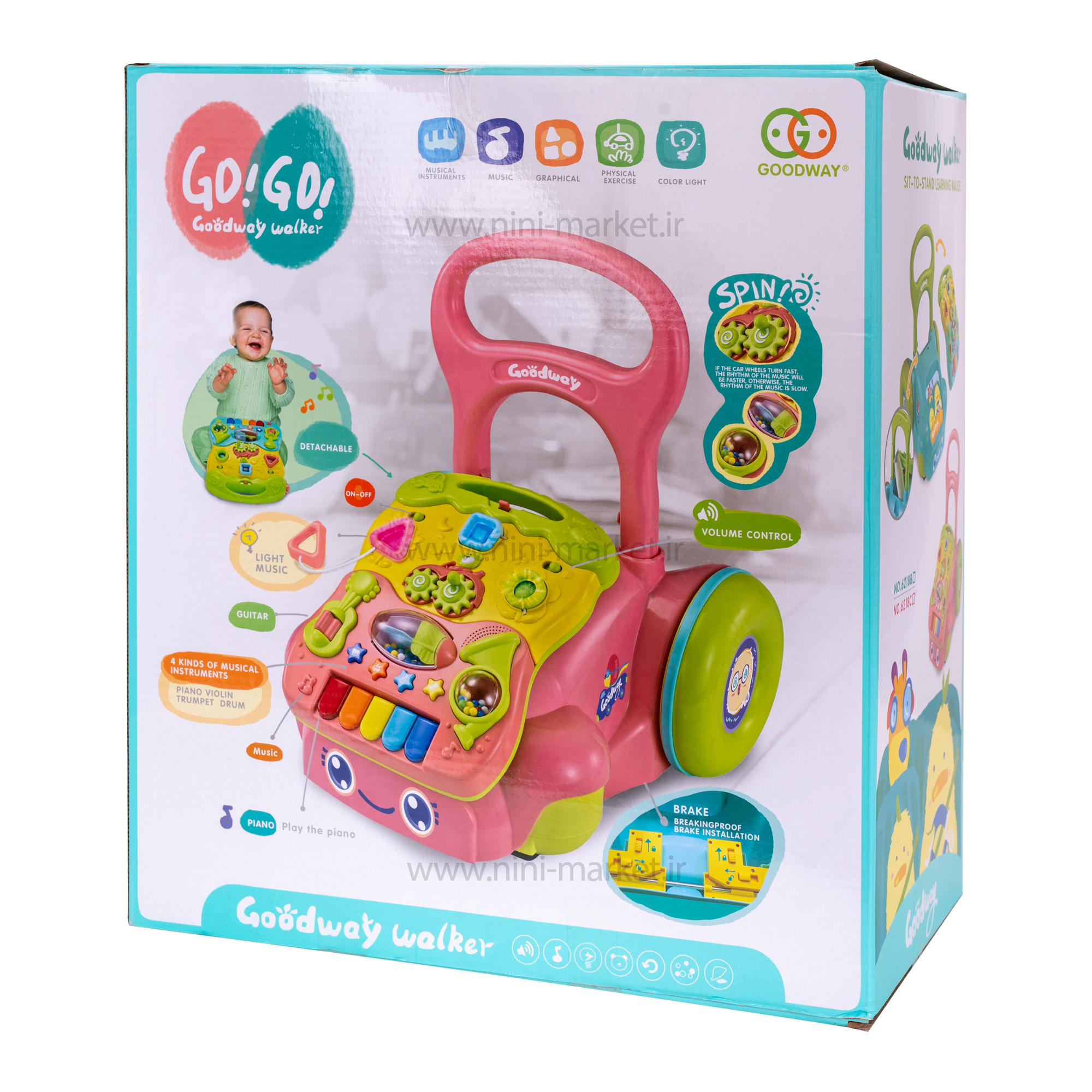 واکر موزیکال صورتی برند goodway یک وسیله بازی جالب با ترکیب رنگی شاد برای کودک دلبندتان است. روی بدنه این واکر طرح های و اشکال مختلف برای سرگرمی کودک تعبیه شده است. نوزاد بالای شش ماه در حالت نشسته می تواند با این وسیله های کوچک بازی کند و سرگرم شود. برای نوزادان بالای 9 ماه، این محصول یک واکر برای کمک به راه رفتن نوزاد است. این کار به تقویت ماهیچه های او و تعادل بهترش کمک می کند. پس از آنکه کودک وارد 12 ماهگی شد، این واکر مثل یک اسباب بازی هم همراه او برای راه رفتن است و هم سرگرم کننده. کمک به ایستادن و قدم زدن بهتر از ویژگی های استفاده از این واکر است.دسته ی این محصول مناسب برای به دست گرفتن کودک است.کودک نوپا با تکیه بر واکر و کاهش فشار به پاهای خود میتواند قدم بزند و مجذوب راه رفتن خود شود. به این ترتیب راه رفتن آسانتر شده و خطر ناشی از افتادن کاهش می یابد.دارای اسباب بازیهای متنوع برای سرگرمی کودک مانند گیتار ، گردونه ، مکعب های پازلی ( قابل جداشدن) .چرخ های این واکر دارای ترمز میباشددر ساخت این محصول از انواع رنگ های مهیج استفاده شده که به شناخت رنگ ها توسط کودک کمک می کند. چرخ های این واکر به راحتی حرکت می کند و مقاومت بالایی دارد.