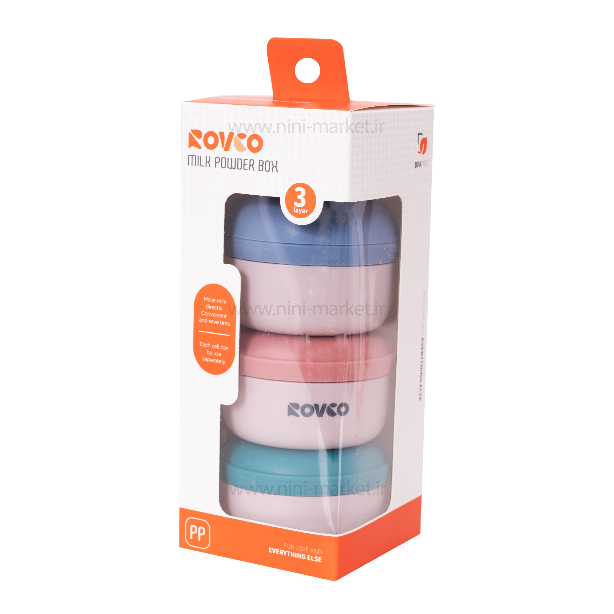 انباری غذا 3 عددی برند Rovco ظرف غذایی پر کاربرد است که از بدو تولد کودک برای قرار دادن شیر خشک مورد استفاده قرار می گیرد.وقتی کودک به 6 ماهگی می رسد، مادر می تواند علاوه بر شیرخشک سایر خوراکی و غذاهای کمکی کودک را در طبقات مختلف این انباری غذا نگهداری کند.وزن آن سبک است و حمل آن در خارج از منزل راحت می باشد، برای نگهداری غذاهای کودک در بیرون از منزل و مهدکودک و مهمانی قابل استفاده می باشد.دارای سه طبقه جداگانه می باشد که این سه ظرف کوچک بر روی یکدیگر قرار گرفته اند. دارای یک درب می باشد که بر روی طبقه بالا بسته شده است. درب طبقه بالا قابلیت باز شدن دارد و بر روی همه ی طبقات نصب می شود. هر کدام از ظروف بصورت جداگانه و مجزا قابل استفاده هستند. می توانید در هر کدام از ظرف ها غذاهای کودک را بریزید و در یخچال قرار دهید. برای نگهداری پودر شیر خشک، غذاهای کمکی کودک، میوه ها و سبزیجات خرد شده، پوره و سوپ و سایر خوراکی های کودک قابل استفاده است.