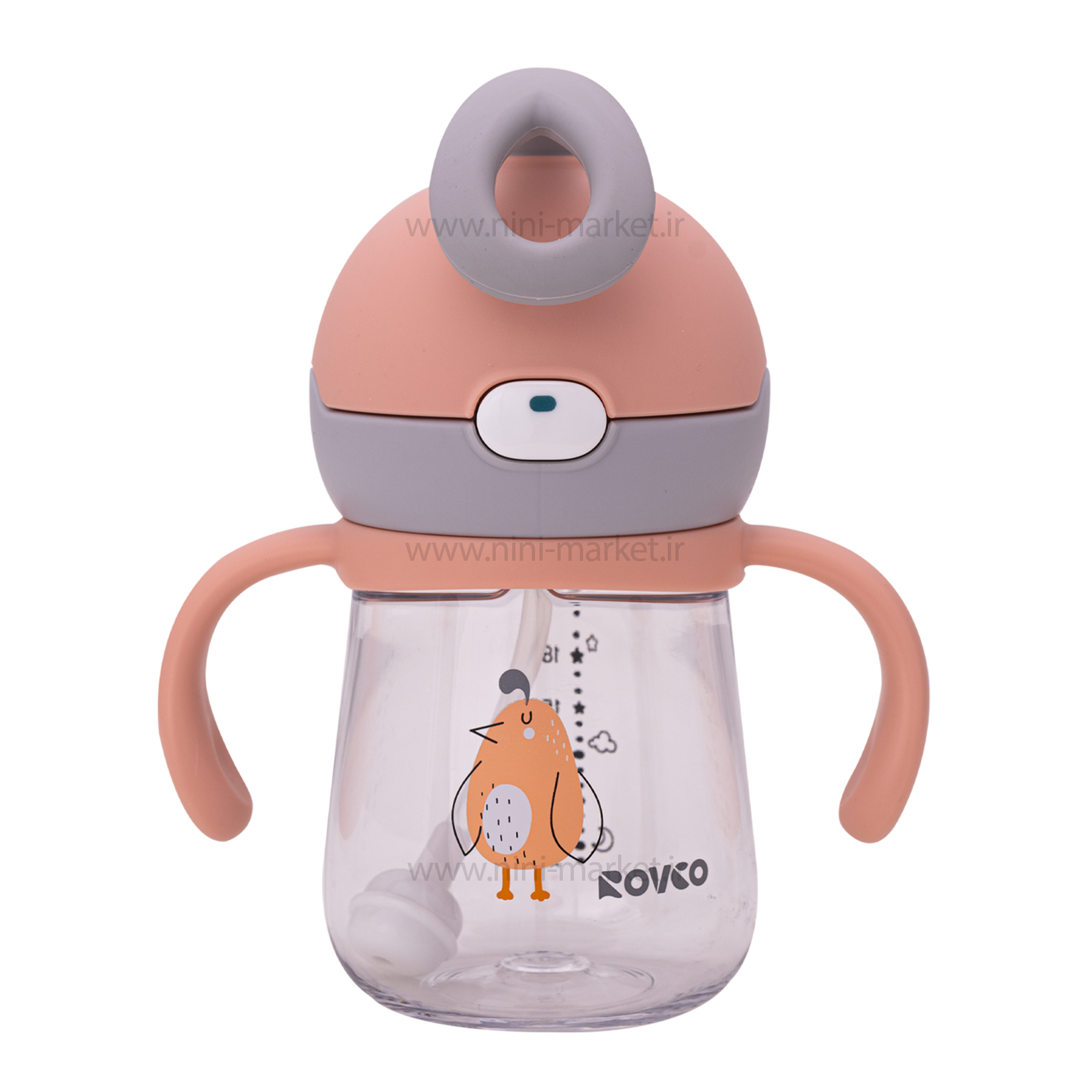 لیوان نی دار برند Rovco دارای ظرفیت 220 میلی لیتر می باشد و به کودک آموزش می دهد که چگونه از لیوان استفاده کند و کمی از شیشه شور جدا شود. کودک از لحظه ای که بدنیا می آید با مکیدن آشنایی دارد و به همین دلیل وقتی به سن 6 ماهگی و غذا خوردن می رسد استفاده از لیوان و جدایی از شیشه شور برایش سخت می شود. لیوان های نی دار آموزشی بهترین وسیله برای آشنایی کودک با لیوان می باشد، شکل ظاهری آنها شبیه لیوان است اما کودک می تواند توسط مکیدن مایعات داخل آنها را بخورد. از دیگر ویژگی این محصول میتوان به این موارد اشاره کرد : ظرفیت آن 220 میلی لیتر است و بر روی بدنه لیوان درجه بندی قرار گرفته است. به کودک می آموزد که چگونه از لیوان استفاده کند. نی آن نرم و سیلیکونی است و به کودک کمک می کند تا مایعات و آبمیوه ها را به راحتی بنوشد. هیچ گونه فشاری به لثه ها و دندان های کودک وارد نمی کند. یک قفل (دکمه) کوچک بر روی لیوان قرار گرفته که به راحتی می توانید درب آن را با قفل باز و بسته کنید. یک دستگیره ی نرم بر روی درب لیوان قرار گرفته که می توانید آن را به جایی آویزان کنید، توسط آن به راحتی لیوان را حمل کنید و آن را به ساک لوازم کودک یا کالسکه کودک آویزان کنید. دارای دو دسته است که به کودک کمک می کند که به راحتی لیوان را در دست های خودش بگیرد و مایعات را بنوشد.
