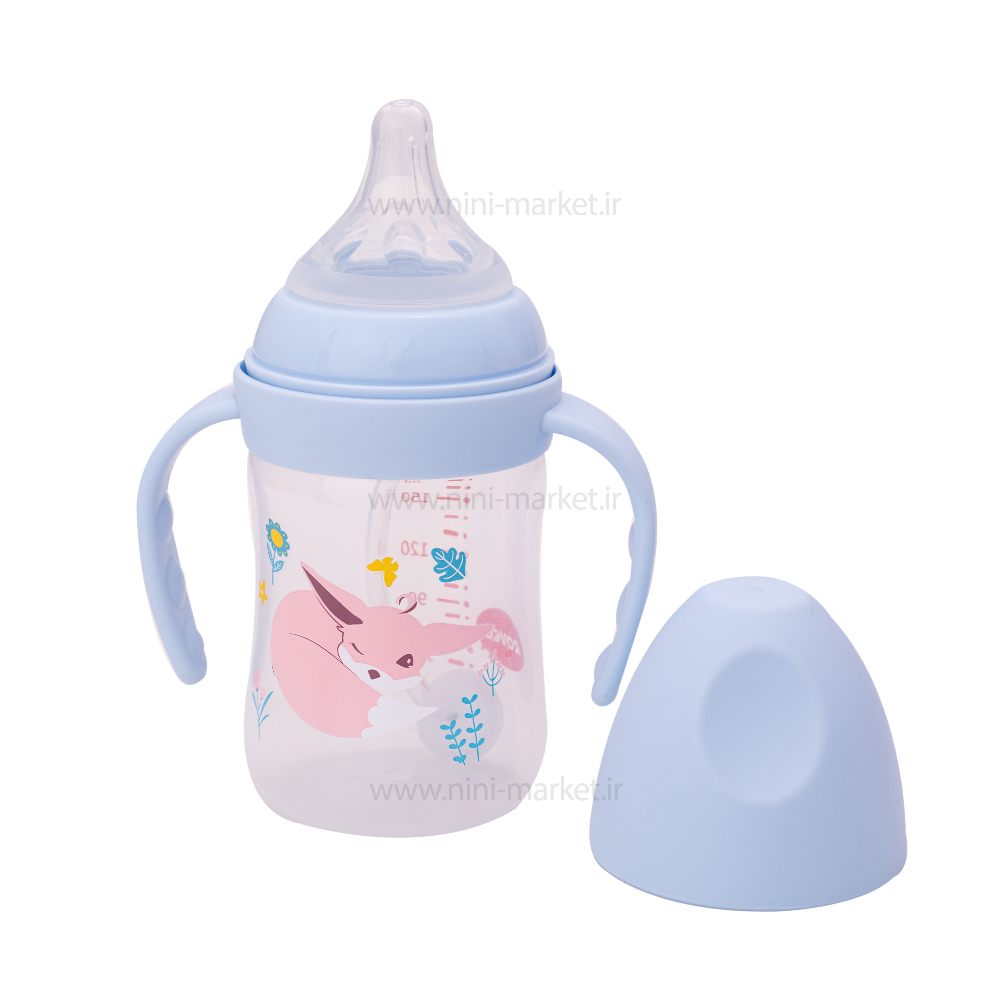 شیشه شیر 180 میل دسته دار طرح روباه رنگ آبی رووکو Rovco