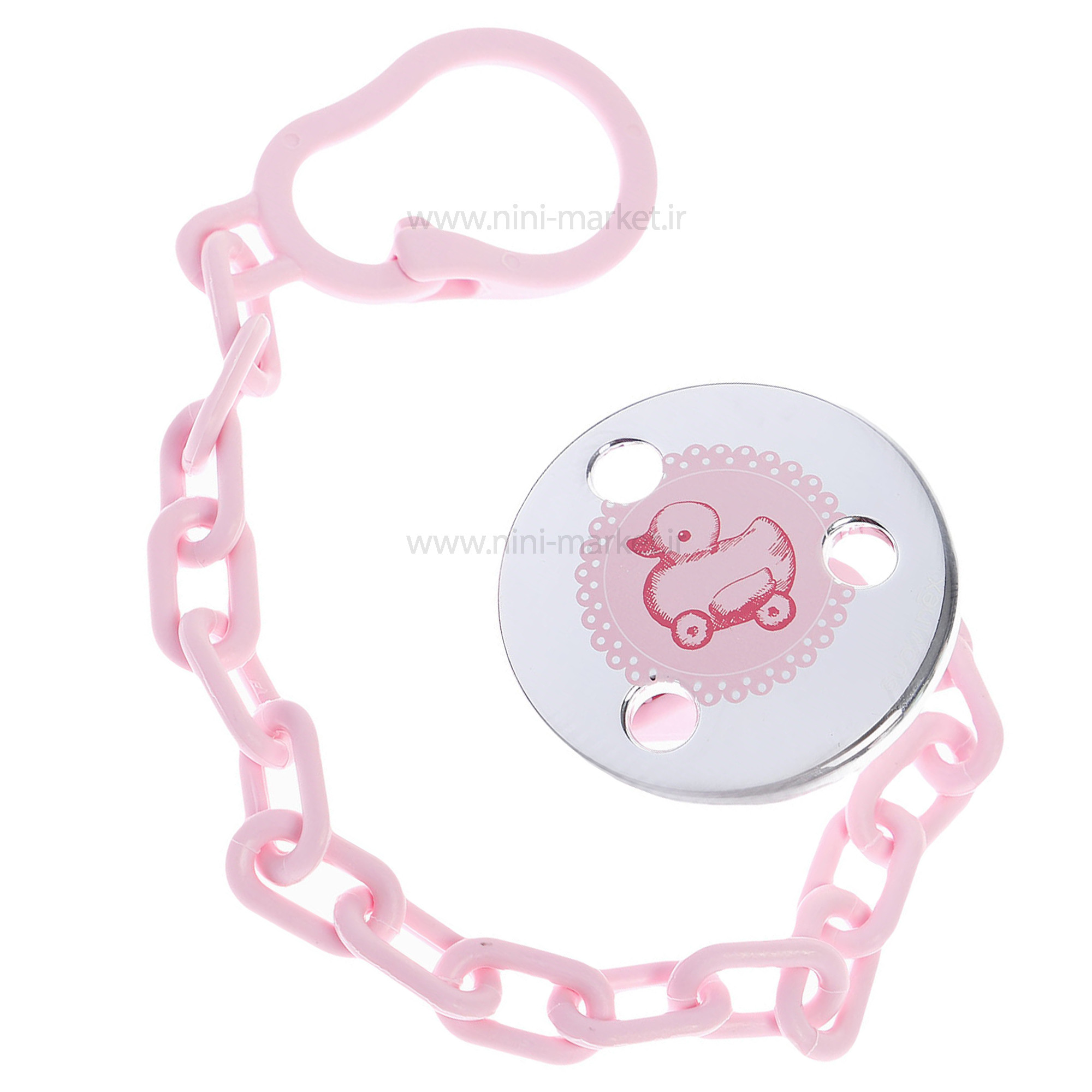 بند پستانک کروم طرح اردک برند Suavinex مناسب برای اتصال به انواع پستانک نوزاد دلبندتان است. این بند از یک سمت به لباس نوزاد و از سمت دیگر به پستانک متصل می شود. با استفاده از این بند پستانک دیگر نگران افتادن و آلودگی پستانک نوزاد خود نباشید. این بند قابل اتصال به پستانک های دسته دار است.سمت دایره ای این بند، گیره ای برای اتصال به لباس نوزاد دارد. سمت دیگر نیز، گیره ای دایره شکل برای اتصال به پستانک دارد. طرح روی آن اردک فانتزی به رنگ صورتی که روی لباس بسیار چشم نواز است.