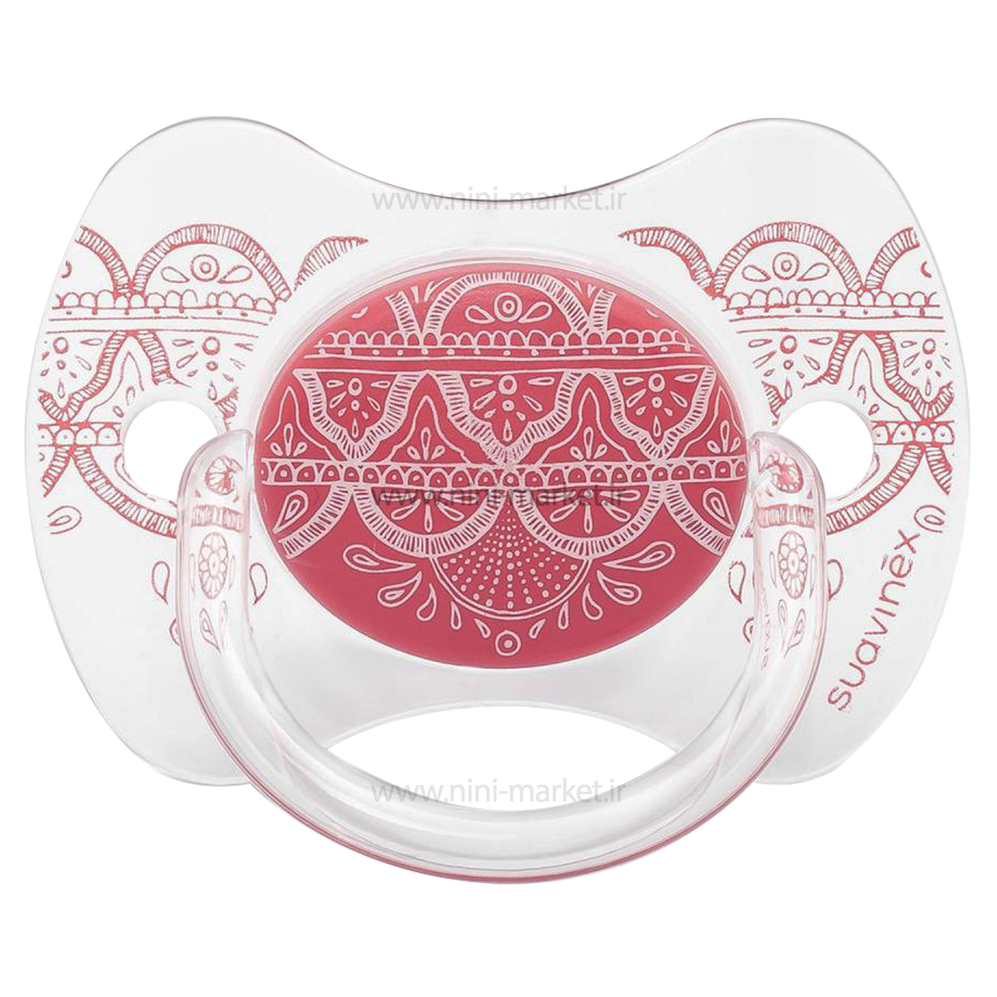 پستانک لوکس با سری بادامی برند Suavinex طرح اسلیمی قرمز یکی از زیباترین و استانداردترین محصولات موجود برای نوزادان می باشد. طراحی ویژه بدنه و سری آن باعث شده توسط نوزاد به راحتی استفاده شود. بدنه آن به شکل شیشه ی شفاف بسیار مقاوم بوده و ضد حساسیت می باشد. همچنین با داشتن طرح های اسلیمی زیبایی آن را چندین برابر کرده است. این محصول به گونه ای طراحی شده که با استفاده مستمر، فرم فک و کام تغییر شکل پیدا نمی کند. سری پستانک به شکل بادام طراحی شده که بسیار راحت روی زبان قرار می گیرد و هنگام مکیده شدن فشار زیادی به کام نمی آورد. بدنه آن به راحتی روی پوست قرار می گیرد همچنین دارای روزنه هایی برای رد شدن هوا است. جنس سری پستانک بسیار نرم و منعطف بوده و با مکیدن زیاد، نوزاد را خسته نمی کند. مواد تشکیل دهنده این محصول فاقد هرگونه مواد مضر شیمیایی که باعث آسیب رسیدن به نوزاد می شود حذف گردیده موادی نظیر BPA بسیار خطرناک بوده که در این محصول به طور کامل حذف شده است. برای شستن و ضد عفونی کردن آن نیاز به اقدام خاصی نیست زیرا به راحتی تمیز و استریل می شود.
