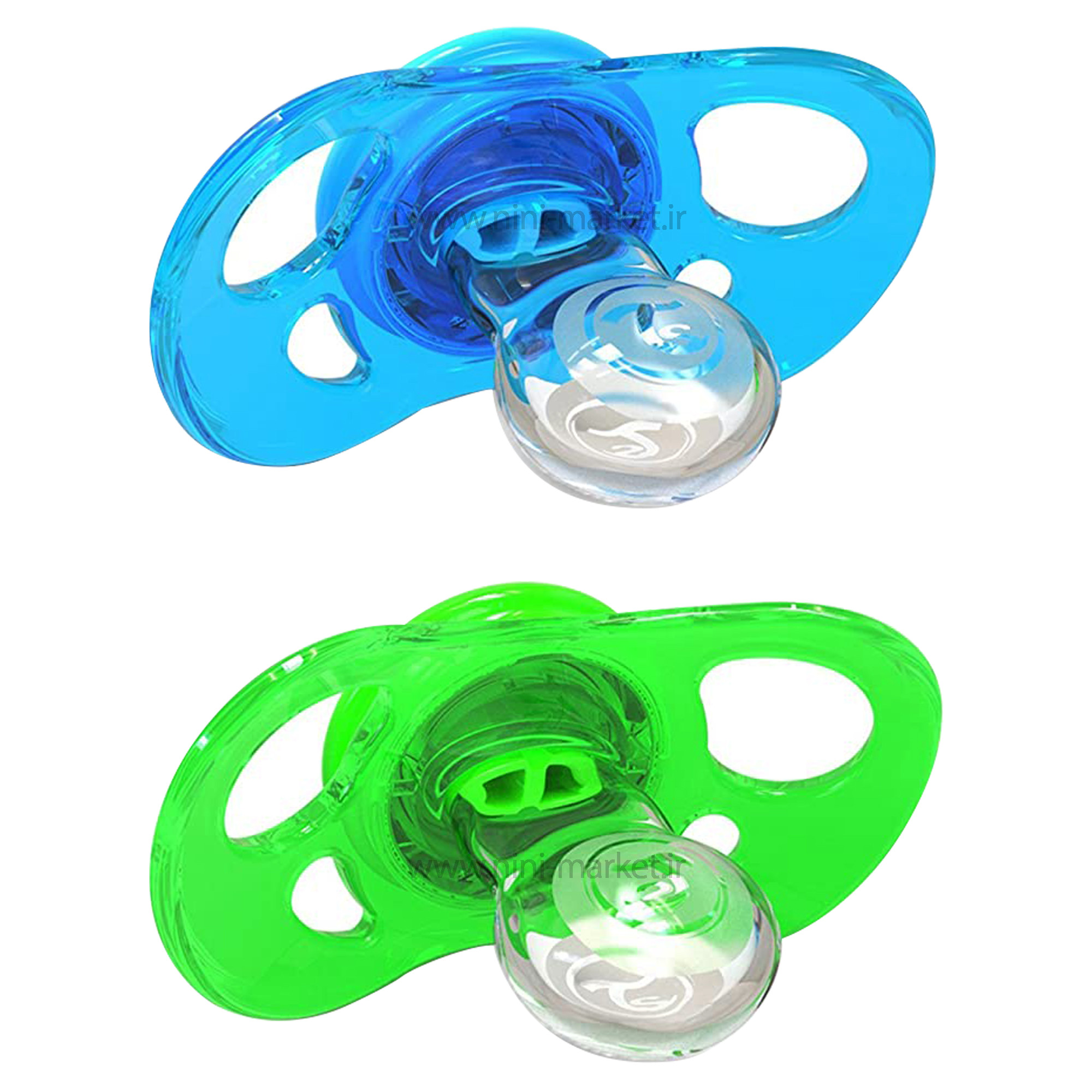 پستانک دو عددی با طراحی جذاب خالخالی به رنگ آبی و سبز یک پستانک برای نوزادان دلبندتان است . سری پستانک به صورت ارتودنسی بادامی طراحی شده است که این پستانک هیچ آسیبی به دندان و یا لثه کودک وارد نمی کند سلامت رشد دندان کودکان را تضمین میکند. جنس پستانک سواوینکس از سیلیکون می باشد و فاقد طعم و بو می باشد. طراحی پروانه ای این پستانک از اطراف دهان کودک محافظت می کند.سوراخ هایی که بر روی این پستانک وجود دارد از تعریق پوست کودک جلو گیری می کند. دسته پستانک طوری طراحی شده است که کودک می تواند آن را به آسانی بگیرد.