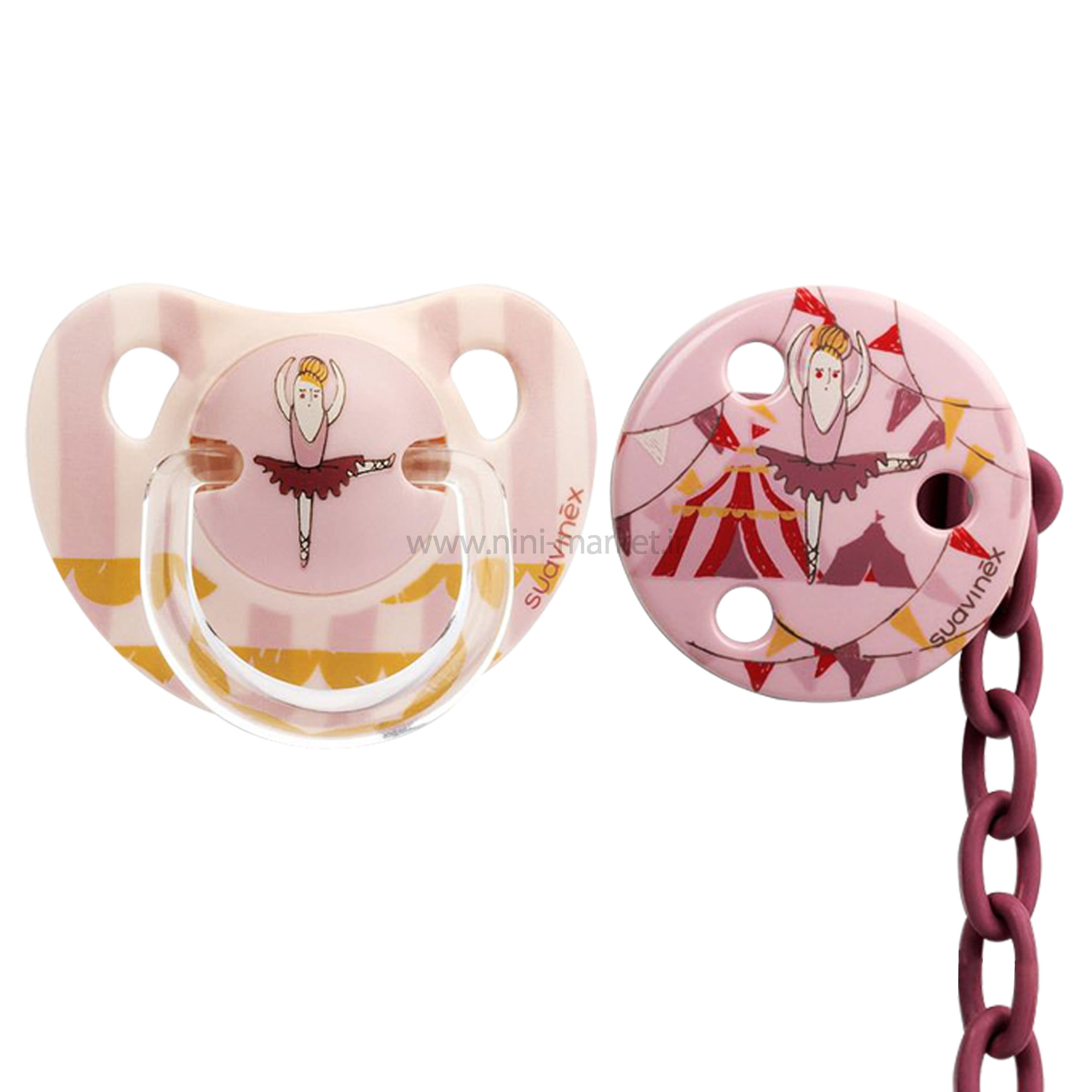 ست زیبای پستانک و بند پستانک طرح سیرک به صورتی برند Suavinex یک ست شیک برای نوزادان دلبندتان است . سری پستانک سواوینکس به صورت ارتودنسی طراحی شده است که این پستانک هیچ آسیبی به دندان و یا لثه کودک وارد نمی کند و از آن محافظت می کند. جنس پستانک سواوینکس از سیلیکون می باشد و فاقد طعم و بو می باشد. طراحی پروانه ای این پستانک از اطراف دهان کودک محافظت می کند.سوراخ هایی که بر روی این پستانک وجود دارد از تعریق پوست کودک جلو گیری می کند. دسته پستانک به صورتی طراحی شده است که کودک می تواند آن را به آسانی بگیرد. این بند از یک سمت به لباس نوزاد و از سمت دیگر به پستانک متصل می شود. با استفاده از این بند پستانک دیگر نگران افتادن و آلودگی پستانک نوزاد خود نباشید. این بند قابل اتصال به پستانک های دسته دار است. طرح روی آن سیرک به رنگ صورتی که روی لباس بسیار جذاب است ..
