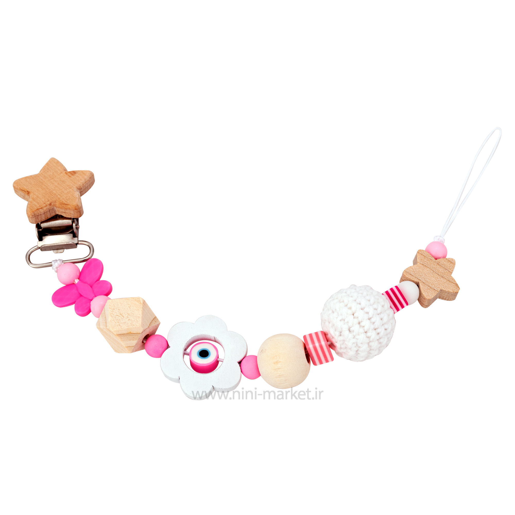• مزیت : مانع گم شدن پستانک و یا افتادن – الیاف بکار برده در آن نرم و ضد حساسیت – دارای ظاهری فانتزی و زیبا- فاقد هرگونه لبه ی تیز و بُرنده - فاقد هرگونه مواد شیمیایی (BPA Free)
