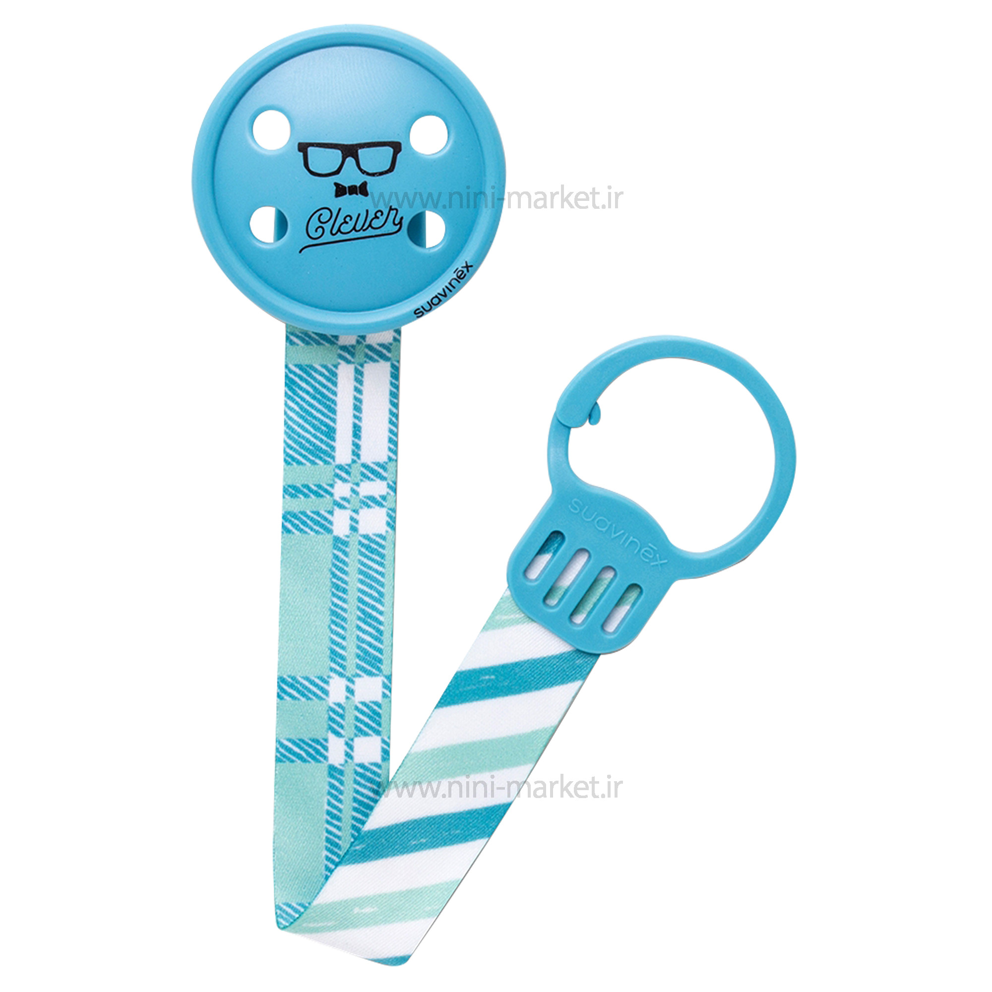 بند پستانک طرح دکمه سواوینکس Suavinex یک بند پستانک شیک برای مادرانی که خوش سلیقه هستند. این بند از یک سمت به لباس نوزاد و از سمت دیگر به پستانک متصل می شود.با استفاده از این بند پستانک دیگر نگران افتادن و آلودگی پستانک نوزاد خود نباشید.این بند قابل اتصال به پستانک های دسته دار است.سمت دایره ای این بند، گیره ای برای اتصال به لباس نوزاد دارد.سمت دیگر نیز، گیره ای دایره شکل برای اتصال به پستانک دارد. مدل این پستانک به شکل دایره سبزآبی ربان آن به طرح راه راه های رنگی که روی لباس بسیار جذاب است .