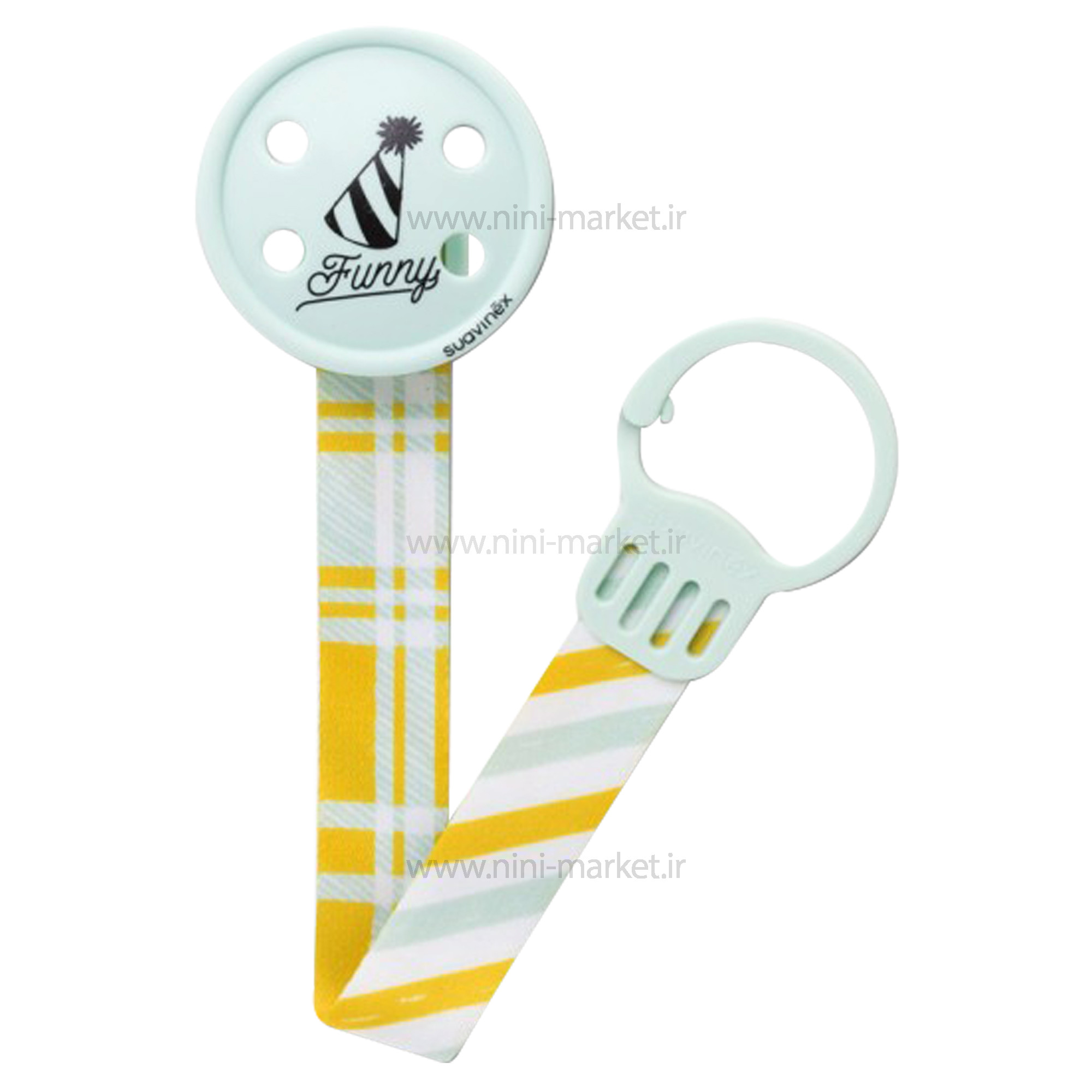 بند پستانک طرح کلاه تولد به رنگ سبز برند Suavinex یک بند پستانک شیک برای مادرانی که خوش سلیقه هستند. این بند از یک سمت به لباس نوزاد و از سمت دیگر به پستانک متصل می شود.با استفاده از این بند پستانک دیگر نگران افتادن و آلودگی پستانک نوزاد خود نباشید.این بند قابل اتصال به پستانک های دسته دار است.سمت دایره ای این بند، گیره ای برای اتصال به لباس نوزاد دارد.سمت دیگر نیز، گیره ای دایره شکل برای اتصال به پستانک دارد. مدل این پستانک به شکل دایره سبز ربان آن به طرح راه راه های سبز و زرد که روی لباس بسیار جذاب است .