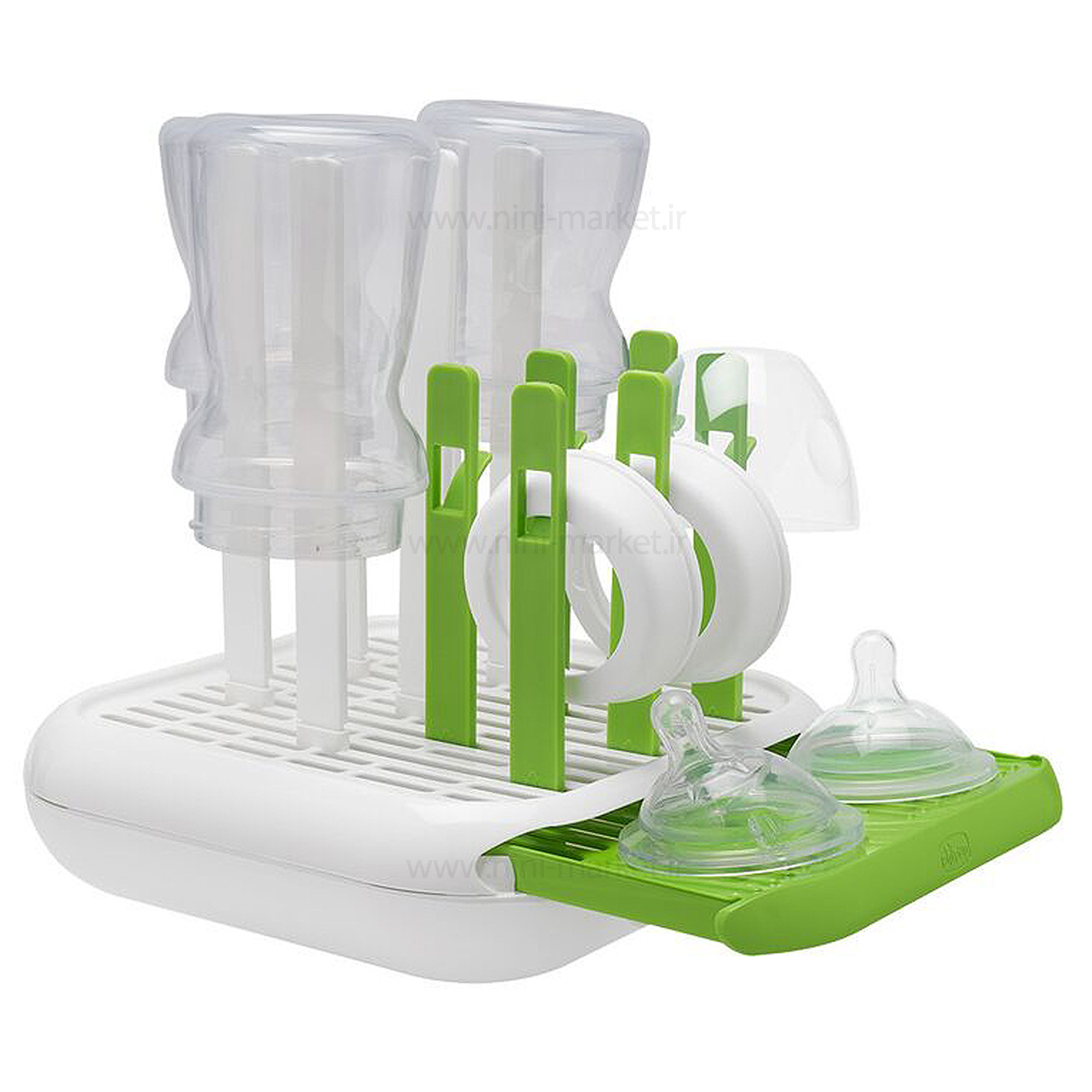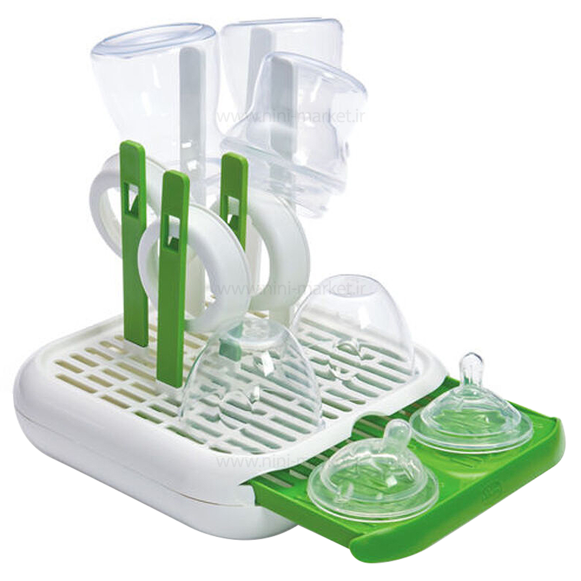 از آنجایی که سیستم ایمنی کودکان در سالها و ماه های اول زندگی ضعیف است، باید به دنبال راه هایی برای استریل کردن و نگهداری لوازم آنها باشیم. سینک و آب چکانهای خانه ممکن است آلودگیها و میکروبهای مختلفی داشته باشند از این رو قرار گرفتن شیشه شیر، شیر دوش و پستانک کودک بر روی آنها احتمال مریض شدن کودکان را افزایش می دهد .این استند مخصوص محصولات شیرخوری نوزاد چیکو دارای یک قسمت برای قرار دادن سرشیشه و پستانک میباشد.سینی این آبچکان قابل قرار دادن در فضاهای مختلف آشپزخانه است و شستشوی آن بسیار ساده میباشد. اندازه سینی متغییر و قابل کوچک و بزرگ شدن است. روی سینی خشک کن شیشه شیر میله هایی در اندازه و رنگ متفاوت قرار داده شده که مناسب قطعات بطری شیر نوزاد است. لوله های بزرگتر برای شیشه شیر و لوله های کوچک برای حلقه سرشیشه و سایر لوازم جانبی محصولات غذا خوری نوزاد می باشد.