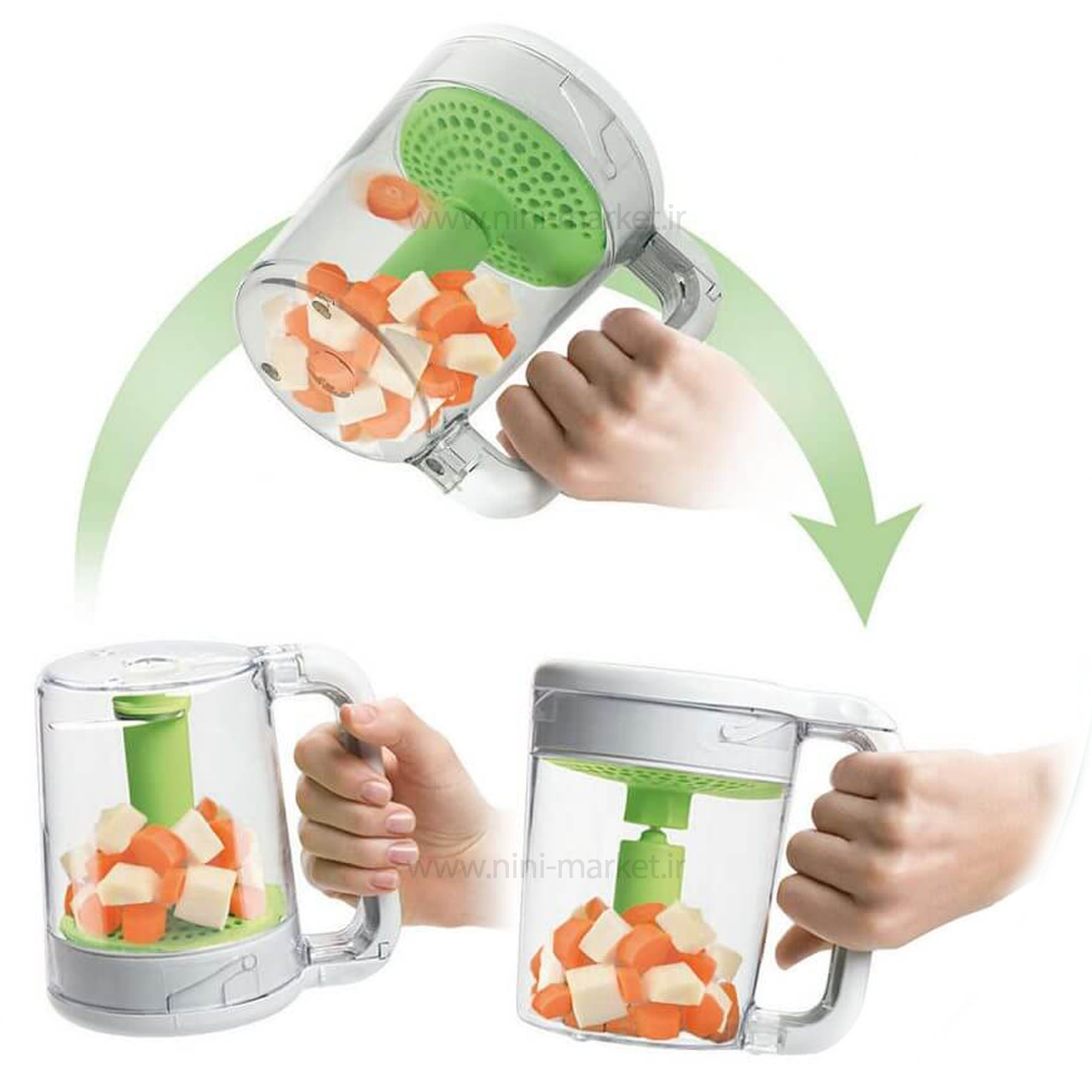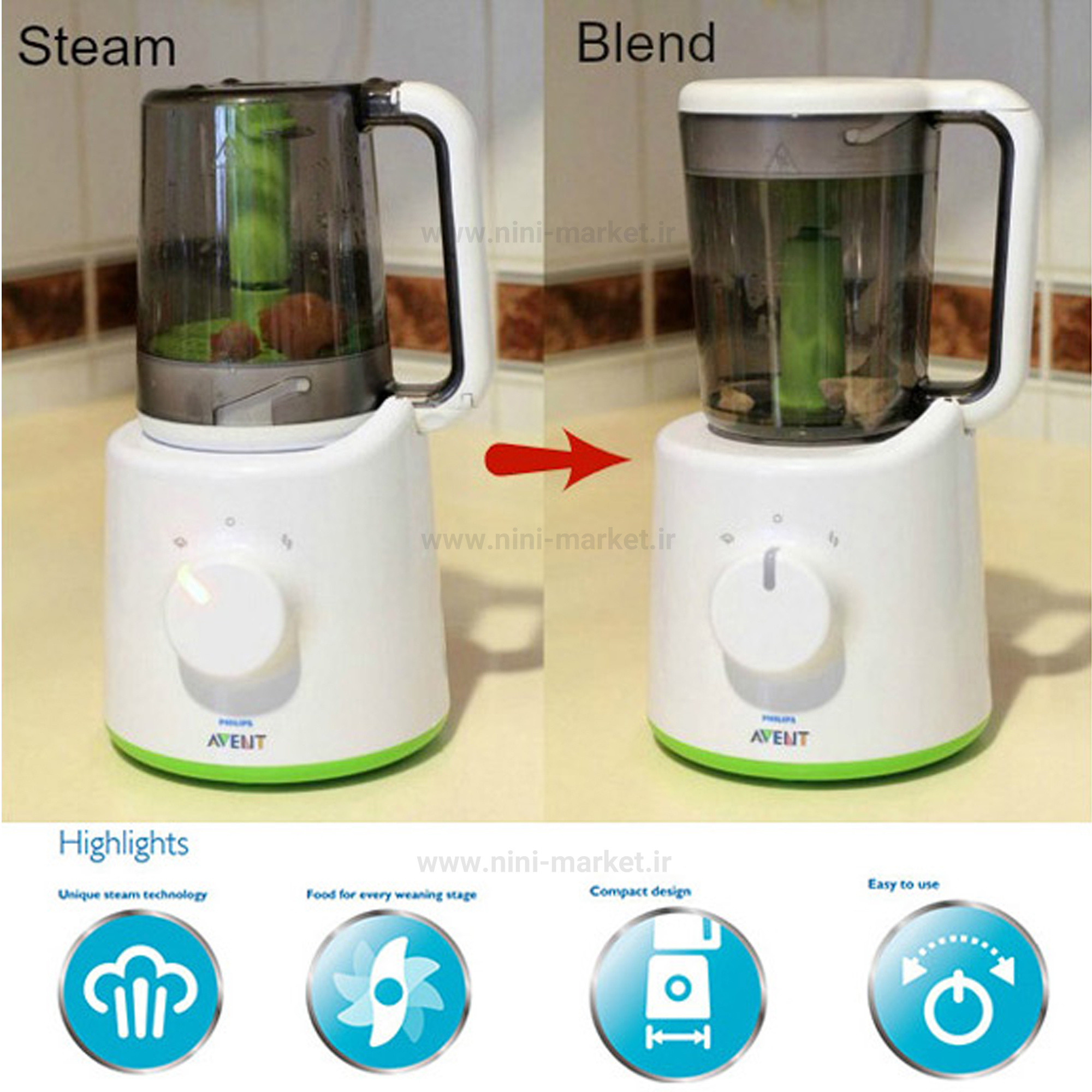 با غذاساز اونت SCF870/21 شما براحتی میتوانید هر غذایی را برای کودک دلبند خود بخارپز کرده و بعد از آن در کمترین زمان لازم مخلوط نمایید. یکی از مناسبترین روشهای پختن و تهیه غذا، بخارپز کردن میباشد که مواد مغذی، ویتامینها و آب خوراکیها را حفظ کرده بطوریکه هیچ ماده مضری (BPA) را در غذا تولید نمیکند. همچنین برای حفظ سلامت و رشد مناسب کودکان بعد از شیر مادران حتما باید از مواد غذایی سالم و مغذی استفاده نمایند بنابراین استفاده از غذاساز اونت SCF870/21 که برپایهی بخارپز کردن طراحی شده است میتواند بهترین جایگزین باشد.با دستگاه بخارپز و مخلوط کن فیلیپس اونت میتوانید براحتی هر نوع مواد غذایی مانند سبزیجات، مرغ و ماهی و هر مواد دیگری را برای کودک خود بخارپز کنید. برای این کار مواد غذایی را به تکههای کوچک تقسیم کنید و داخل محفظه غذاساز بریزید. سپس درب محفظه را بسته و ظرف را برگردانید تا درب به سمت پایین قرار بگیرد. توسط پیمانه مخصوص غذاساز آب را درون مخزن آب دستگاه بریزید و با چرخاندن ولوم جلوی دستگاه به سمت علامت بخارپز، دستگاه شروع به کار میکند و به همین سادگی غذای کودک دلبندتان بخارپز میشود. حالا برای مخلوط کردن و پوره کردن مواد غذایی فقط کافیست مخزن غذاساز را بلند کرده و برگردانید؛ به صورتی که درب آن به سمت بالا قرار بگیرد. تنظیم ولوم دستگاه را به سمت علامت تیغه بچرخانید تا به آسانی و بدون مصرف ظرف اضافهتر غذای کودک ریز و یا پوره شود. شما میتوانید به کمک این غذاساز فیلیپس اونت برای هر مرحله از دوره از شیر گرفتن کودک و یا هنگام سفر، برای کودک خود غذای مناسب او را تهیه کنید. غذا ساز کودک دو کاره فیلیپس اونت شامل یک دستگاه بخارپز و مخلوط کن، یک پیمانه مدرج، یک کاردک مخصوص و یک کتابچه دستور غذایی است. این کتابچه شامل 12 دستورالعمل مناسب برای دوره های از شیر گرفتن کودک می باشد تا در شروع به غذا خوردن کودک، مناسب ترین و سالم ترین غذا ها را برای کودک خود آماده کنید. هنگام بخارپز کردن مواد غذایی به هیچ وجه نیاز به مراقبت یا سر زدن نیست؛ زمانی که مواد به خوبی پخته شوند خود دستگاه هشدار می دهد و شما را آگاه می کند و کافیست فقط ظرف را برگردانید تا مواد مخلوط شوند. تنظیمات و شستشوی این دستگاه بسیار راحت بوده و فضای بسیار کمی را در آشپزخانه می گیرد.