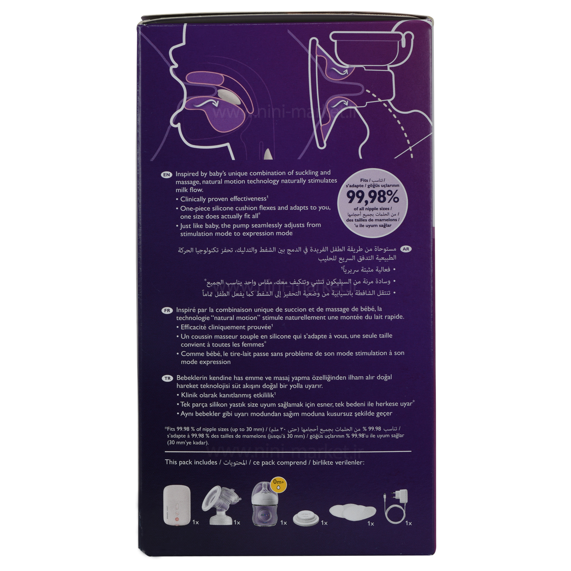 • مزیت : موتور کم صدا نسبت به مدل های دیگر - بالشتک منحصر بفرد جدید - مکش عالی با شبیه سازی مکیدن طبیعی نوزاد از سینه مادر – دارای 8 مدل تحریک سینه و 16 سطح قدرت مکش – دارای دکمه استارت یا مکث در حین