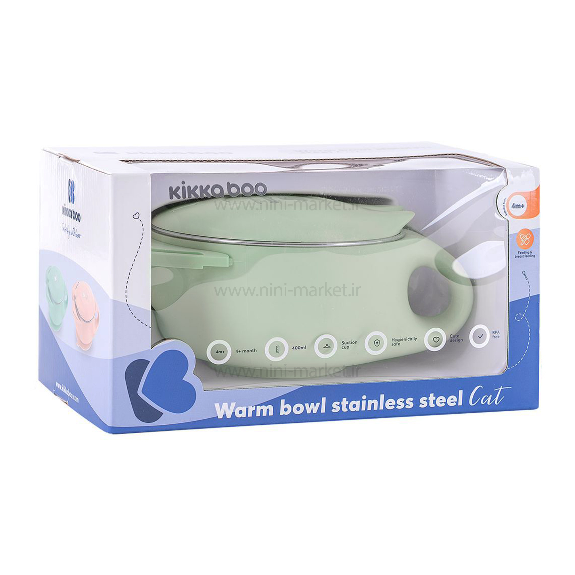 ظرف غذاي گرم نگهدارنده 400 ميل رنگ سبز کد 318775 برند Kikkaboo  با ویژگی ها و کیفیت بالایی که دارد یک ظرف غذای مناسب برای نوزادان بالاتر از 4 ماه است. کاسه غذای کودک از جنس استیل ضد زنگ که برای رفع نیازهای والدین طراحی شده است. محافظت مضاعف که غذا را برای مدت طولانی تری گرم نگه می دارد. کاسه چسبان درب دار می باشد. جنس داخل استیل ضد زنگ است.دو جداره است که به گرم نگه داشتن غذا کمک میکند. دارای یک دسته جهت نگه داری اسان طراحی شده است. یکی از زیبایی این ظرف غذا کیکابو آن است که از طراحی زیبایی به شکل گربه فانتزی شده که هر کودکی را به خود جذب میکند. این ظرف غذا فاقد هرگونه مواد مضر و حساسیت زا برای کودک می باشد.با توجه به دربی که دارد مناسب نگهداری غذا درون یخچال است. درب این ظرف غذا قفل ندارد و ضد چکه نیست.