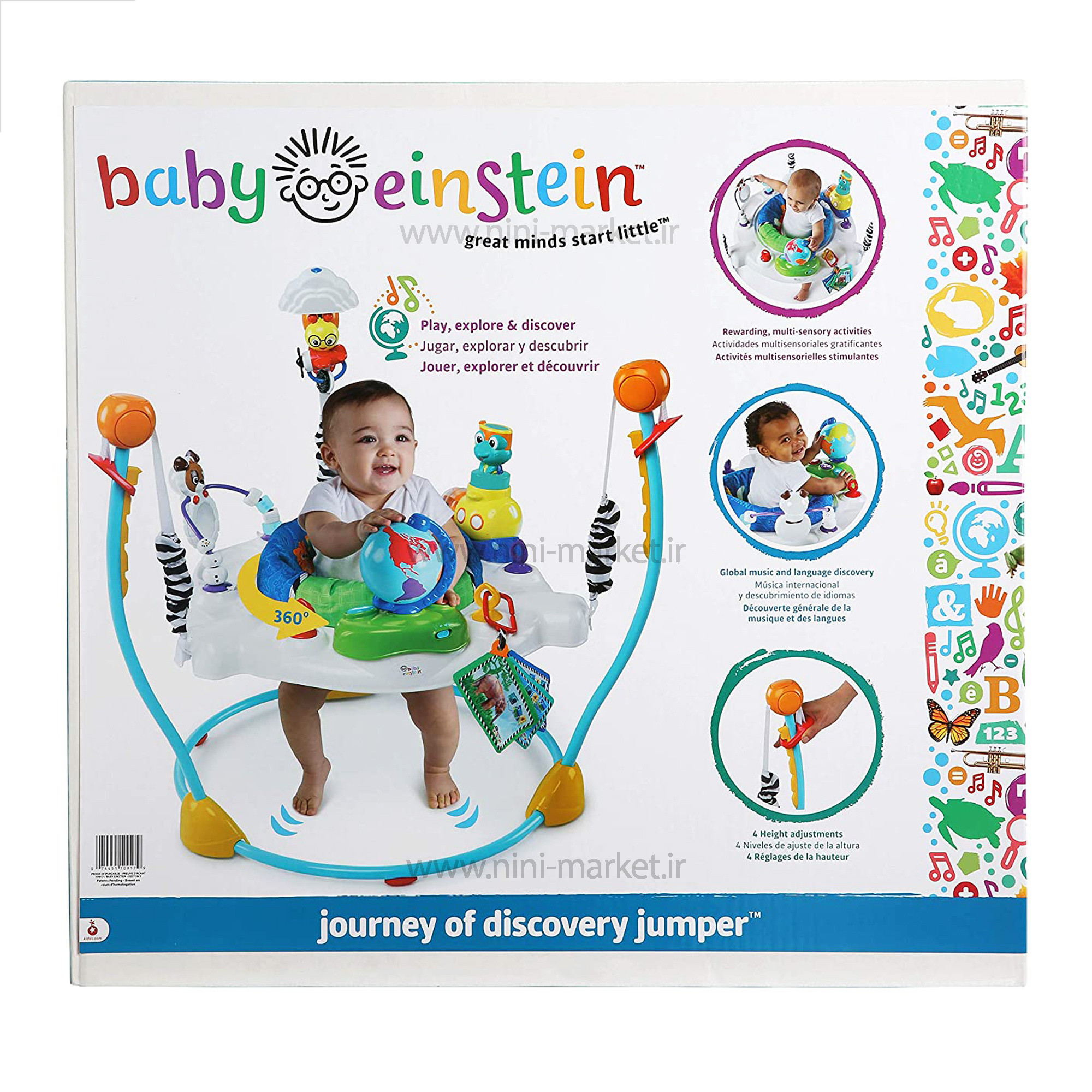 با این جامپینگ بی بی انیشتین سفر مرکز فعالیت اکتشاف توسط این جامپر با نور و ملودی های خوش نوا ، تمام دنیا را در یک لحظه تجربه کنید . هر یک از 12 فعالیت کودک شما را به یک سفر جهانی می برد. با آدم برفی و شکارچی مهره های یخی دوست قطب شمال بازی کنید یا با Baby Neptune و زیردریایی اش دریاهای عمیق را کشف کنید. با هر چرخش جهان چند رنگ، که موسیقی الهام گرفته شده بین المللی پخش می کند و صداها و عبارات ساز را به سه زبان معرفی می کند، بیشتر دنیا را ببینید. کودک شما عاشق کاوش در تمام حس های لمسی کارت پستال های چندحسی - یک یادگاری نرم از "سفر" ماجراجویی او خواهد بود. این جامپینگ ایستاده Baby Einstein برای نوزادان در حال رشد ساخته شده است، بنابراین چهار موقعیت ارتفاع به راحتی قابل تنظیم است. صندلی فنری آن 360 درجه می چرخد، در حالی که از کودک با یک پد صندلی راحت و قابل شستشو با ماشین لباسشویی و پشتی صندلی بلند حمایت می کند. حرکت دادن این مرکز فعالیت از اتاقی به اتاق دیگر آسان است، زیرا کودک شما در سفر اکتشاف خود به پرواز در می آید. این جامپینگ بی بی انیشتن توسط سه باتری قلمی انرژی خود را تامین میکند. حداکثر تحمل وزن این جامپینگ بی بی انیشتن 12.76 کیلوگرم است.
