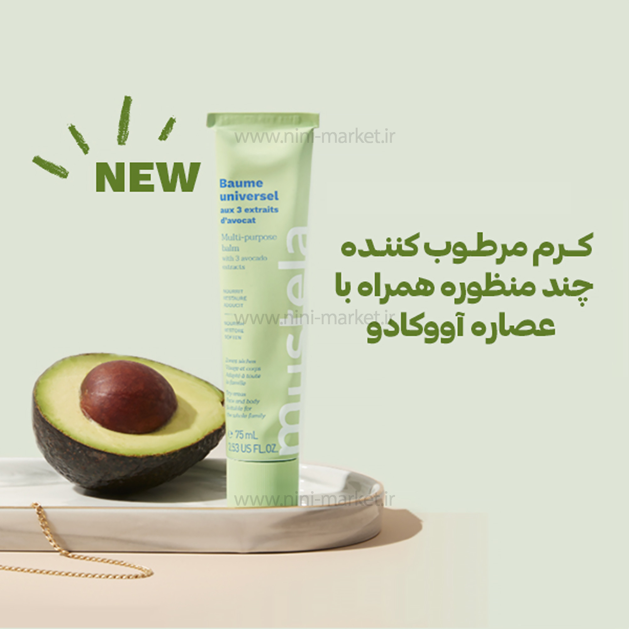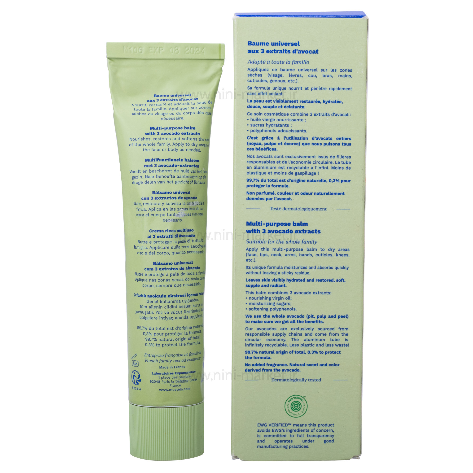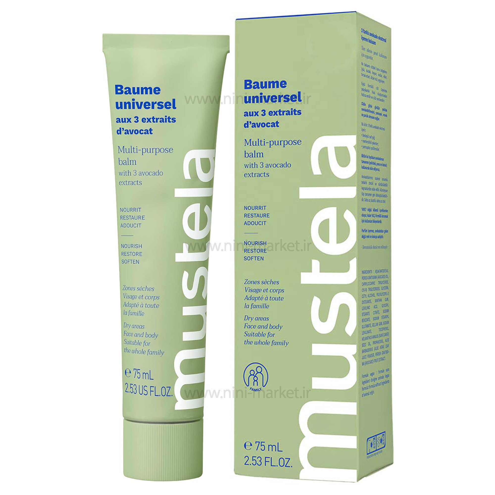 کرم مرطوب کننده چند منظوره موستلا برای تغذیه، ترمیم و محافظت از پوست طراحی شده و آن را نرم و لطیف می کند.دارای بافت کرمی که به راحتی در تماس ذوب می شود و برای نوزادان، کودکان و بزرگسالان مناسب است. ساخته شده با 99.7٪ مواد منشاء طبیعی. ترکیبات شامل روغن آفتابگردان، گلیسیرین، آلوئه ورا و روغن آووکادو است.آووکادو به طور مسئولانه و پایدار از کوه های آند در پرو تهیه می شود. فرمولاسیون پایدار با 3 عصاره آووکادو با استفاده از کل آووکادو - پالپ، پوست و حتی حفره - بنابراین هیچ ضایعاتی وجود ندارد. به طور هدفمند در یک بسته بندی تویوپی که سازگار با محیط زیست تا به راحتی بازیافت شود، زیرا ما ضایعات کمتر و زیبایی بیشتری می خواهیم. کرم مرطوب کننده چند منظوره Mustela با 3 عصاره آووکادو برای تغذیه، ترمیم و محافظت از پوست سر تا پا طراحی شده است. این فرمول تایید شده EWG بی خطر است و راه حل یکپارچه کامل برای پوست های خشک صورت، گردن، لب ها، آرنج ها، دست ها، کوتیکول ها، زانوها، پاها و همه جای شماست. ترکیبات محصول : آب، روغن Persea Gratissima (آووکادو)، تری گلیسیرید کاپریلیک/کاپریک، تری گلیسیرید C10-18، گلیسیرین، ستیل الکل، پلی گلیسریل-3 دی استئارات، صمغ زانتان، اسید لوولینیک، گلیسریل استئارات سیترات، سدیم بنزوات سدیم ژل آلان گوتیم، سدیم بنزوات گلیسرین، لوولینات، توکوفرول، روغن دانه هلیانتوس (آفتابگردان)، پروپاندیول، پودر آب برگ آلوئه باربادنسیس (آلوئه ورا)، عصاره میوه Persea Gratissima (آووکادو) - با گواهی ارگانیک و 99.7٪ مواد منشاء طبیعی، از بدو تولد ایمن است. رنگ و بوی منحصر به فرد آووکادوی مشتق شده طبیعی دارد. ظاهری درخشان ترمیم شده، نرم، لطیف و سالم را فراهم می کند. به لطف مرهم آووکادو با اثر سه گانه، پوست خشک تمام اعضای خانواده به طور فوری و دائمی ترمیم و محافظت می شود. کرم چندمنظوره موستلا بافت فوق العاده نرمی دارد که بدون ایجاد حس چسبندگی پوست را تغذیه می کند. با متخصصان مراقبت های بهداشتی، با 450 اندازه گیری و آزمایش توسعه یافته است. اثربخشی بالینی اثبات شده محافظت از پوست به مدت 24 ساعت پس از استفاده ** پوست 80 درصد انعطاف پذیرتر می شود. تاریخ انقضا: 08/2024