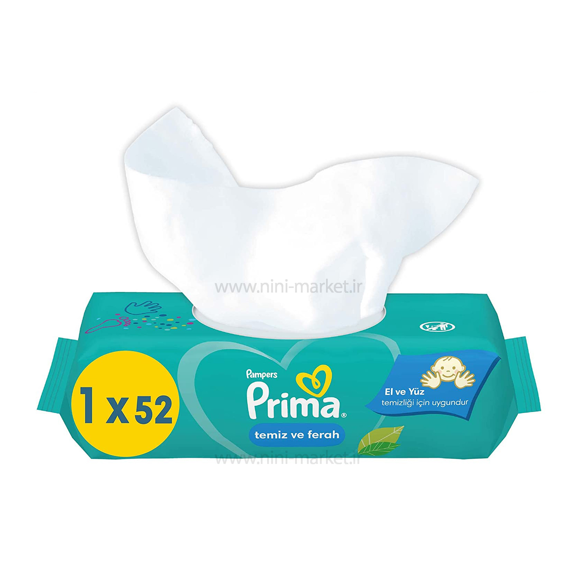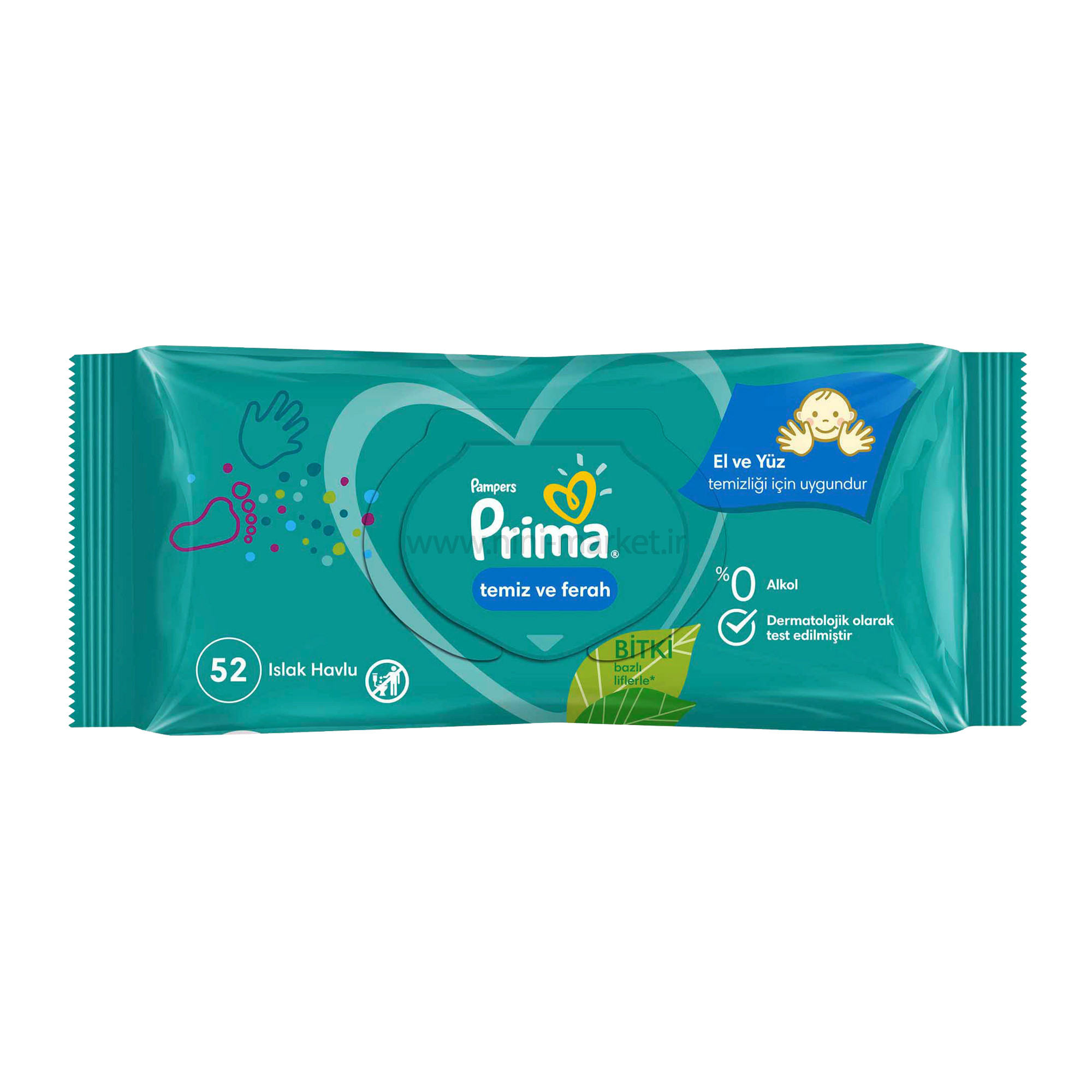 دستمال مرطوب مرطوب Pampers از پنبه ارگانیک و 99% آب خالص ساخته شده است تا پوست حساس کودک شما را به آرامی تمیز کند. دستمال مرطوب تمیز و تازه Prima با تعادل pH طبیعی خود، به پوست حساس کودک شما آسیبی نمی رساند. این یک تمیز کردن موثر با سطح رطوبت متعادل را فراهم می کند. رایحه ای با طراوت دارد. کوچولوهای نازنین ما سزاوار یک نظافت ظریف و دوست داشتنی هستند. به همین دلیل است که دستمال مرطوب Prima Clean و Fresh رطوبت متعادلی را که پوست را تمیزتر نگه می‌دارد و توانایی حفظ سطح pH طبیعی را ترکیب می‌کنند. دستمال مرطوب Prima Clean و Fresh نیز رایحه‌ای با طراوت دارند که زمان تعویض پوشک را لذت‌بخش‌تر می‌کند.