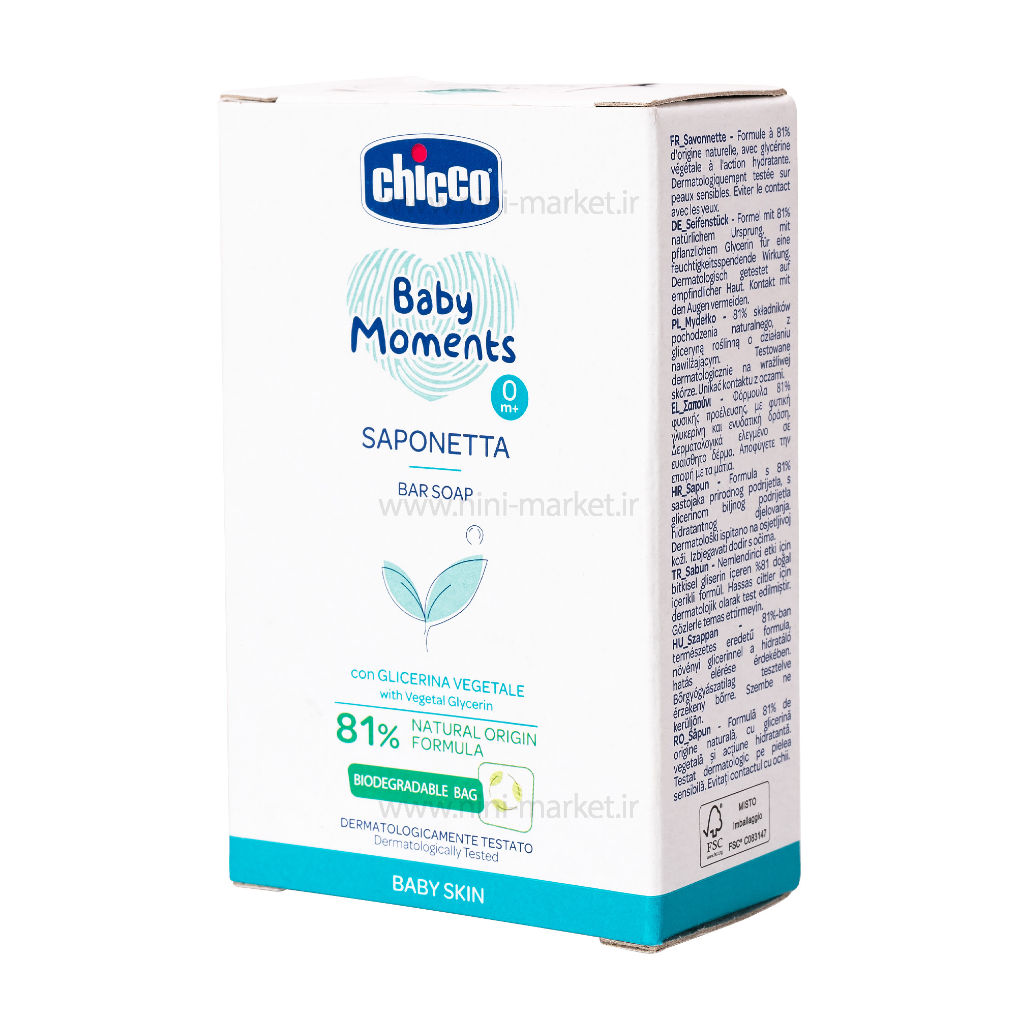 صابون Chicco Baby Moments - صابون "بدون اشک" برای مراقبت از پوست و موی کودک ایده آل است. یک ماده طبیعی خاص در هر محصول. به لطف فرمول حاوی گلیسیرین پوست کودک را به آرامی تمیز و مرطوب می کند. بر اساس عصاره های گیاهی فاقد پارابن، سدیم لوریل سولفات است. فاقد رنگ و الکل است. تست بالینی روی پوست های حساس. ضد حساسیت (فرمولی برای به حداقل رساندن خطر آلرژی پوستی). ویژگی ها: فرمول 81 درصد با منشا طبیعی. از نظر پوست تست شده است. با فرمول مبتنی بر گلیسیرین، پوست کودک را به آرامی تمیز و مرطوب می کند. طیف وسیعی از محصولات آرایشی و بهداشتی که به طور خاص برای بهداشت روزانه و برای پوست لطیف کودکان طراحی شده است . طیف کاملی از محصولات آرایشی که به طور خاص برای مراقبت روزانه از پوست نوزادان طراحی شده است. تمام فرمول حاوی گلیسیرین گیاهی و عصاره های طبیعی، دارای رایحه ای لطیف و بی نظیر بوده و از نظر پوست و چشم تست شده است. با فرمول مبتنی بر گلیسیرین، پوست کودک را به آرامی تمیز و مرطوب می کند. صابون گیاهی چیکو، با 81 درصد مواد طبیعی مشتق شده است . ساخته شده از 100٪ بطری های پلاستیکی بازیافتی، 50٪ لوله های پلاستیکی بازیافتی، بسته بندی کمتر، جعبه های کارتن FSC بازیافت شده می باشد .