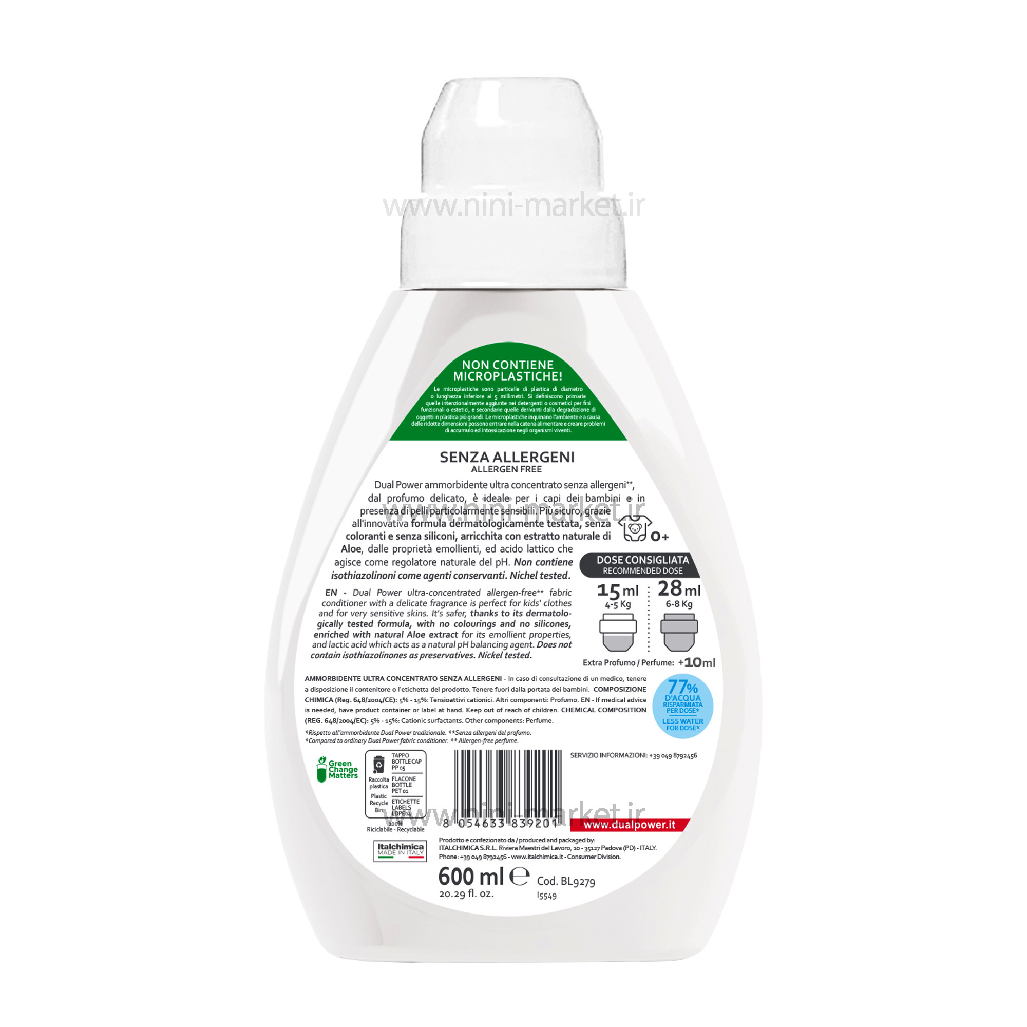نرم کننده لباس دوال پاور Dual Power مدل senza Allergen مناسب لباس کودکان و بدون آلرژی می باشد. این محصول فوق العاده غلیظ و بدون حساسیت،بوده و عطردار برای لباس های بچه گانه و برای پوست های بسیار حساس مناسب است. نرم کننده دوال پاور مناسب لباس کودکان، و بدون آلرژی می باشد فوق العاده غلیظ و بدون حساسیت، است. این محصول با عطر ملایم برای لباس های بچه گانه و برای پوست های بسیار حساس مناسب است. این نرم کننده با حجم 600 میلی محصولی بسیار حرفه ای ، ساخت ایتالیا می باشد. فرمول نوآورانه اجازه عملکرد استثنایی را می دهد، 600 میلی لیتر برای 40 بار شستشو کافی است، به پارچه اثر نرمی می بخشد و عطر ملایمی می دهد. به لطف فرمول آزمایش شده از نظر پوست، ایمن تر است، حاوی رنگ و سیلیکون نیست، غنی شده با عصاره طبیعی آلوئه، که به عنوان متعادل کننده pH طبیعی عمل می کند. تاریخ انقضا : 8/10/2025