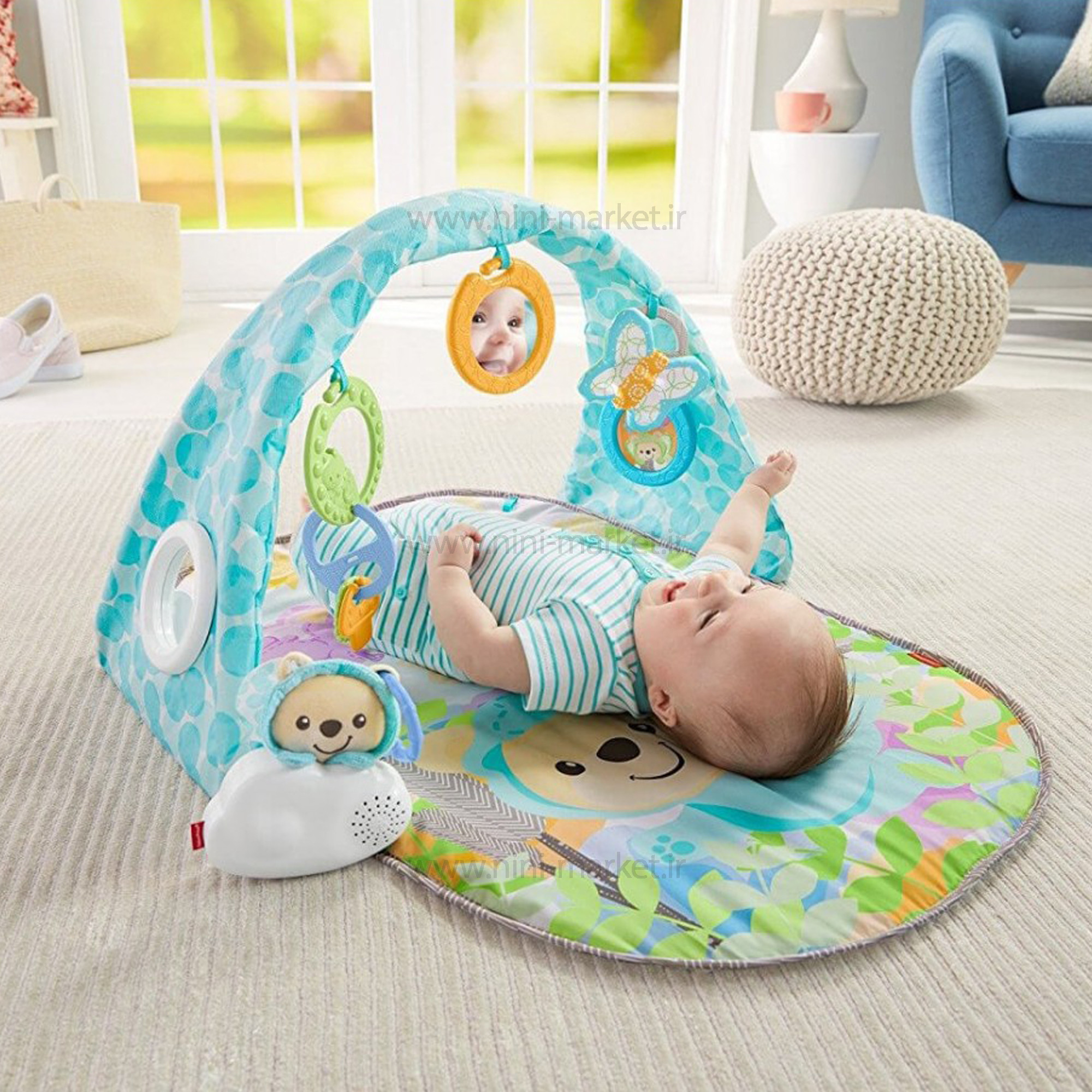 تشک بازی فیشر پرایس محصولی از کمپانی صاحب نام فیشر پرایس و محصول کشور کاناداست.که از بهترین متریال موجود تهیه شده است و شما می توانید این محصول را از فروشگاه نی نی مارکت به صورت اینترنتی این محصول را خریداری کنید.تشک بازی فیشر پرایس دارای پارچه ضد حساسیت می باشد ، چرا که بدن نوزاد مستقیما با این تشک برخورد دارد و می بایست این محصول بسیار لطیف و ضد حساسیت می باشد. تشک بازی فیشر پرایس به 3 صورت قابل استفاده می باشد حالت اول به صورت آویز دار ، که در این حالت آویزها و عروسک ها نصب شده و کودک می تواند بسیار دراز کش از آن استفاده کند.این حالت مناسب برای استفاده از بدو تولد تا ۶ ماهگی و قبل از چهار دست و پا راه افتادن کودک است. حالت دوم بصورت بدون آویز و عروسک است که این حالت مناسب برای بعد از ۶ ماهگی و به محض چهار دست و پا راه افتادن کودک است.حالت سوم بدون آویز ولی به همراه عروسک است که در این حالت کودک روی تشک بازی نشسته و با عروسک ها بازی می کند ، این حالت برای زمانی به کار می رود که کودک راه رفتن را یاد گرفته است. تمامی عروسک ها از تشک بازی جدا شده و به صورت تکی قابل استفاده است.همچنین یکی از عروسک ها موزیکال می باشد . پارچه ضد تعریق و همچنین ضد نفوذ آب تشک بازی فیشر باعث محبوبیت این کالا در میان مصرف کنندکان شده است که می توان از این محصول به عنوان زیر انداز تعویض نیز استفاده کرد و برای تعویض پوشک نوزاد نیازی به جابجایی کودک و یا پهن کردن زیر انداز برای تعویض نیست. تشک بازی نرم و راحت دارای یک صحنه شیرین Butterfly DreamsTM و یک طاق نما رنگارنگ با پنج اسباب بازی آویزان برای فعالیت کودک شما برای خفاش کردن، جرنگ جرنگ زدن یا دندان درآوردن است. و با ابر موزیکال همراه با دو تنظیم موسیقی برای پخش طولانی یا کوتاه، میتوانید هر کجا که خود و کودکتان میروید، سرگرمی را به همراه داشته باشید. جایی که رشد وارد می شود: حسی: انواع رنگ ها، بافت ها و صداها حواس در حال رشد کودک شما را تحریک کرده و درگیر می کنند. موتور ناخالص: همانطور که اسباببازیهای کوچک زیر طاقدار قرار میگیرند، میتوانند به اسباببازیها دست یابند و با خفاش به آنها ضربه بزنند. و آنها عضلات گردن و هسته خود را در طول بازی با شکم تقویت می کنند! موتور خوب: گرفتن اسباب بازی های آویزان و آوردن آنها به دهان به ایجاد هماهنگی و مهارت چشم و دست کمک می کند.