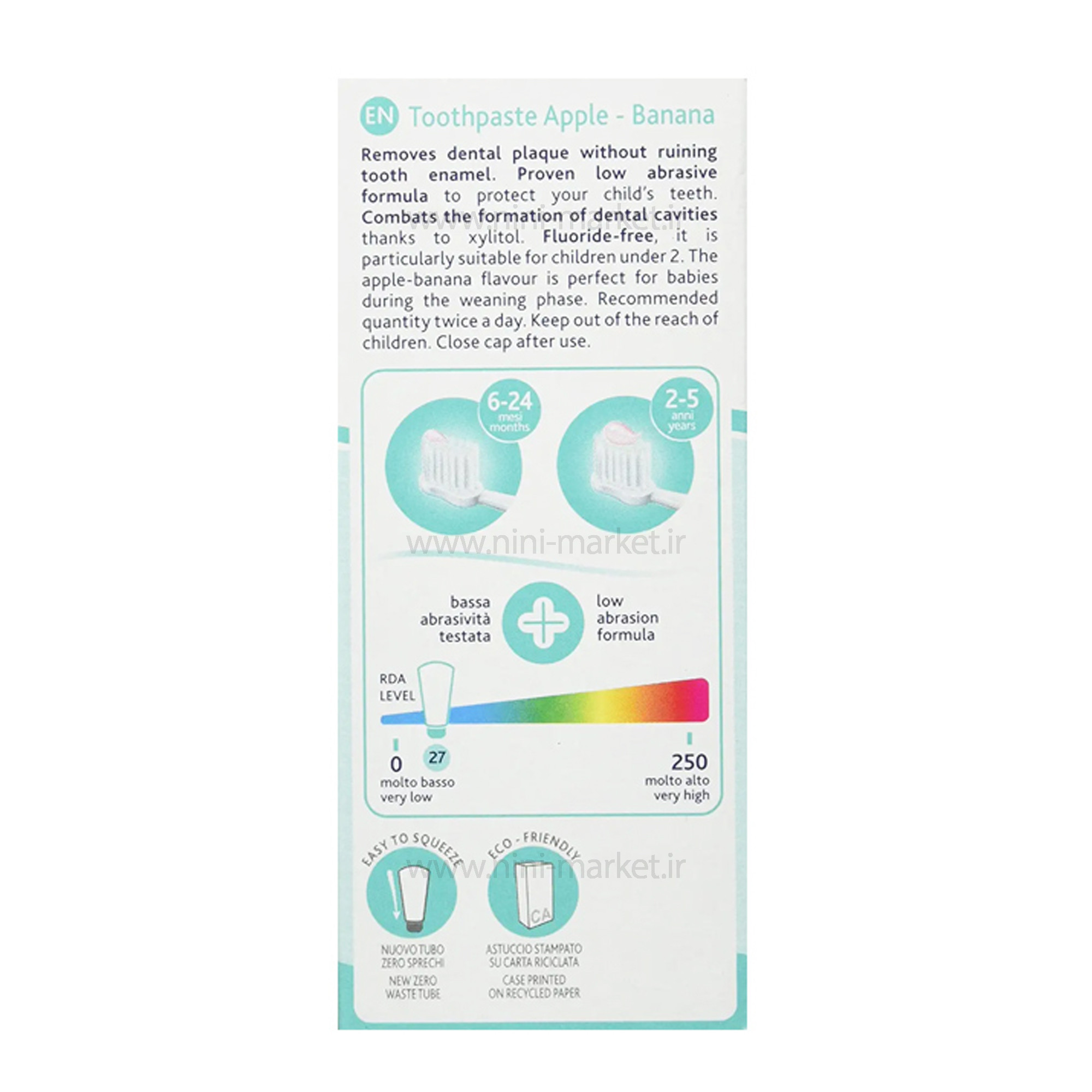 خمیردندان موز و سیب کودک چیکو با یک طعم ایده آل برای کودکان با سنین پایین از برند Chicco می باشد. مسواک زدن کودکان با رویش اولین دندانهای کودک بایستی شروع شود. معمولا بایستی از خمیردندانی استفاده شود که علاوه بر طعم خوب فاقد فلوراید باشد. طعم خوب خمیردندان و شکل ظاهری تیوب کودکان را بیشتر تشویق به مسواک زدن می کند. خمیر دندانهای قبل از دو سالگی بایستی بدون فلوراید باشند چرا که کودک ناخواسته مقداری از آن را قورت می دهد. در صورت داشتن فلوراید جذب بدن شده و مسمومیت به همراه دارد. بنابراین در خرید خمیر دندان بایستی دقت کافی داشته باشید. این محصول کاملا فاقد فلوراید بوده و هیچ ضرری برای کودک ندارد. خمیردندان سیب و موز CHICCO دارای طعمی لذت بخش برای کودکان است که آنها را برای زدن مسواک به طور مداوم ترغیب می کند. از سویی دیگر فاقد فلوراید و مواد مضر است که به مینای دندان آسیب می رسانند. این خمیر دندان ِآنتی باکتریال، برای کودکان خردسال از سن 6 ماهگی ساخته شده است. خمیردندان سیب و موز CHICCO بدون ایجاد آسیب روی مینای دندان، از تشکیل پلاک روی دندان های کودکان بالای 6 ماه، جلوگیری به عمل می آورد. علاوه بر این، فرمولاسیون به کار رفته در این خمیر دندان برای محافظت از دندانهای شیری کودک بسیار عالی است. دندانهای کودک در این سن بسیار حساس هستند و اگر به درستی مورد توجه قرار نگیرند، میتوانند تا بزرگسالی او را درگیر مشکلات سلامت دهان و دندان کنند. خمیردندان سیب و موز CHICCO عاری از فلوراید و مواد نگهدارنده است. کلسیم و زایلیتول موجود در این خمیر دندان به تقویت و جلوگیری از کرمخوردگی دندان های کودکان کمک میکنند. همچنین از مینای دندان ها محافظت میکند. عدم وجود مواد نگهدارنده و SLS در این خمیردندان، آن را برای نوزادان نیز مناسب میسازد. این خمیر دندان به واسطه داشتن طعم سیب و موز حس خوب و دلنشینی را به کودکان خردسال موقع مسواک زدن می دهد. علاوه بر این، این طعم آنها را برای مسواک زدن در روز و شب بیشتر ترغیب خواهد کرد. تاریخ انقضا خمیردندان سیب موز چیکو 12 ماه پس از شروع مصرف آن می باشد .