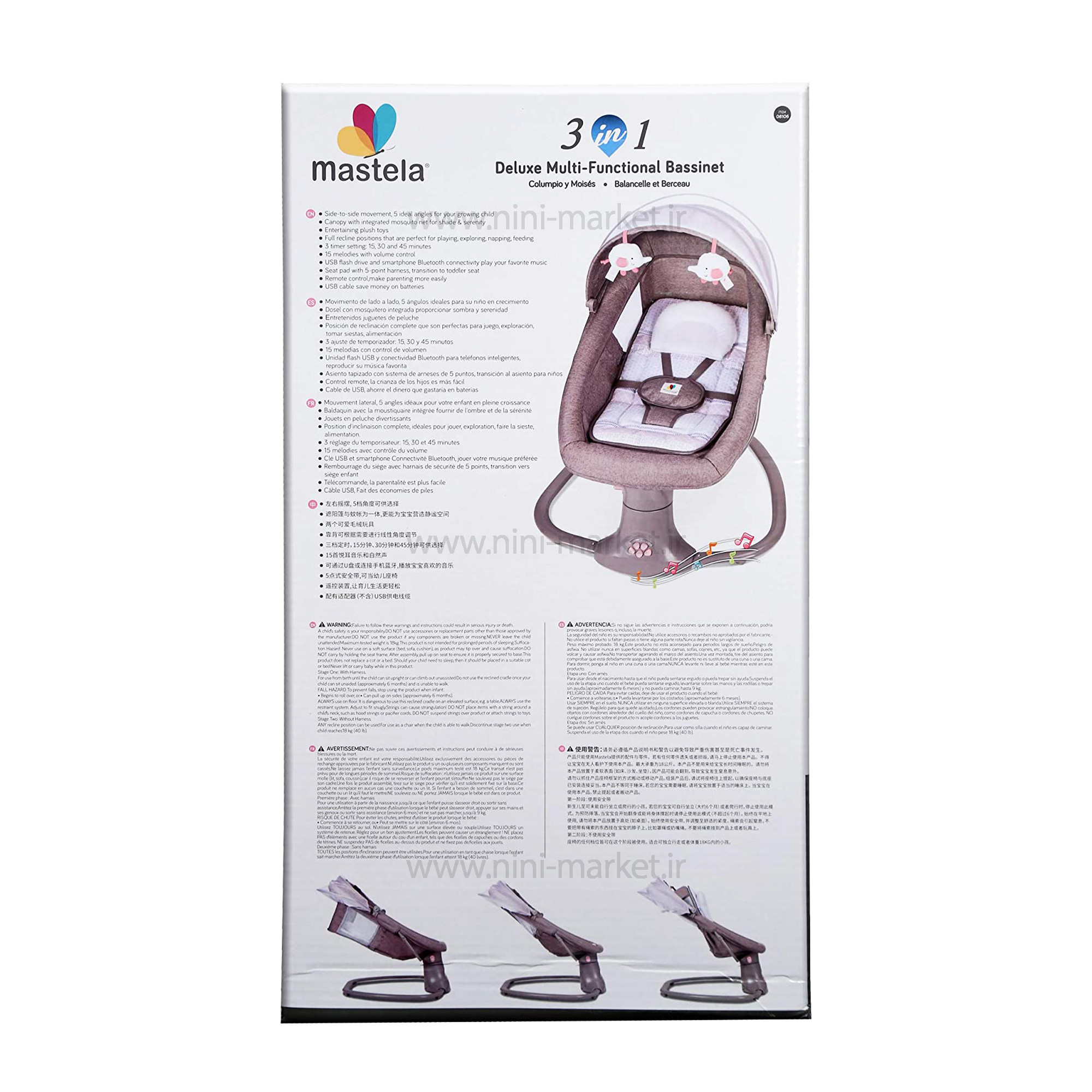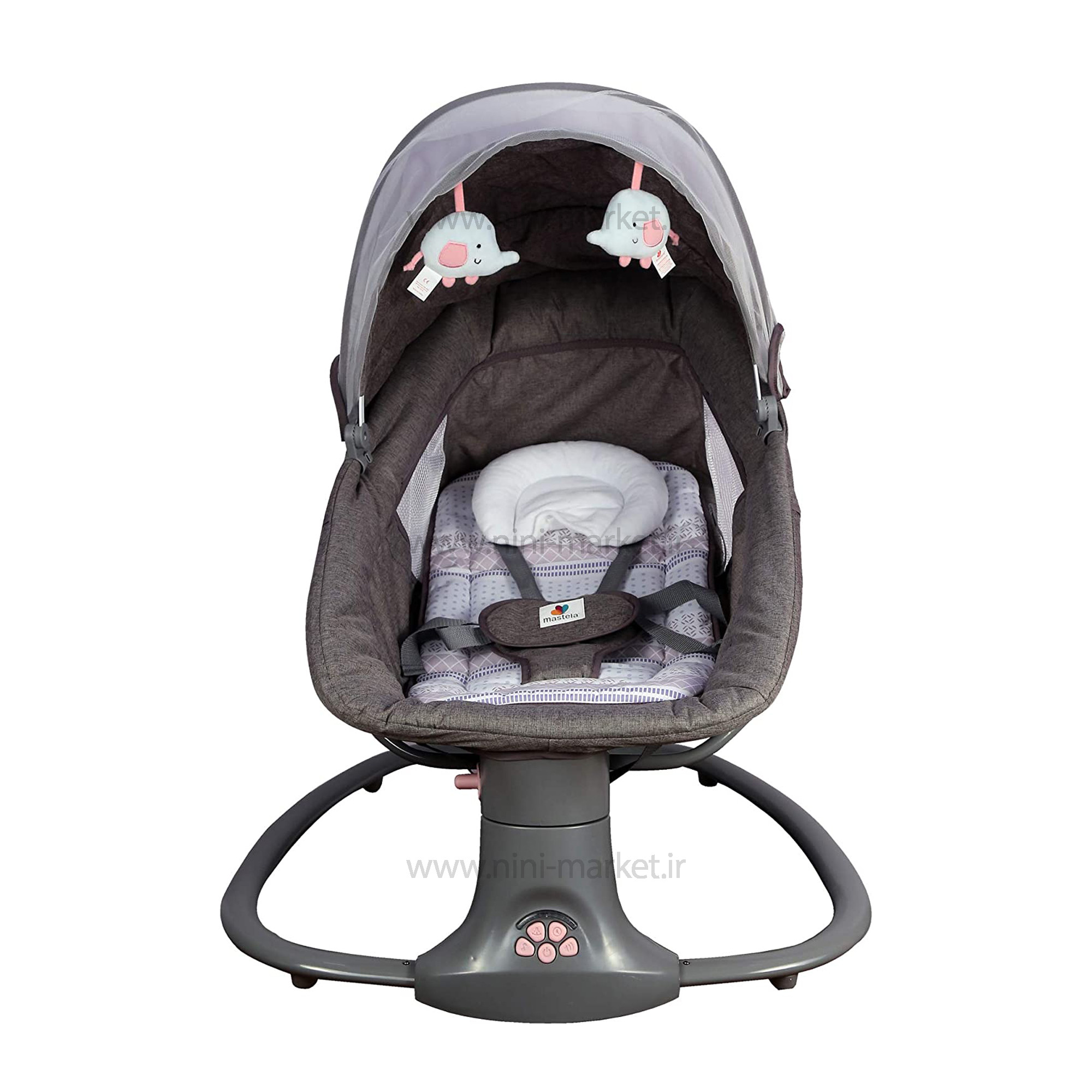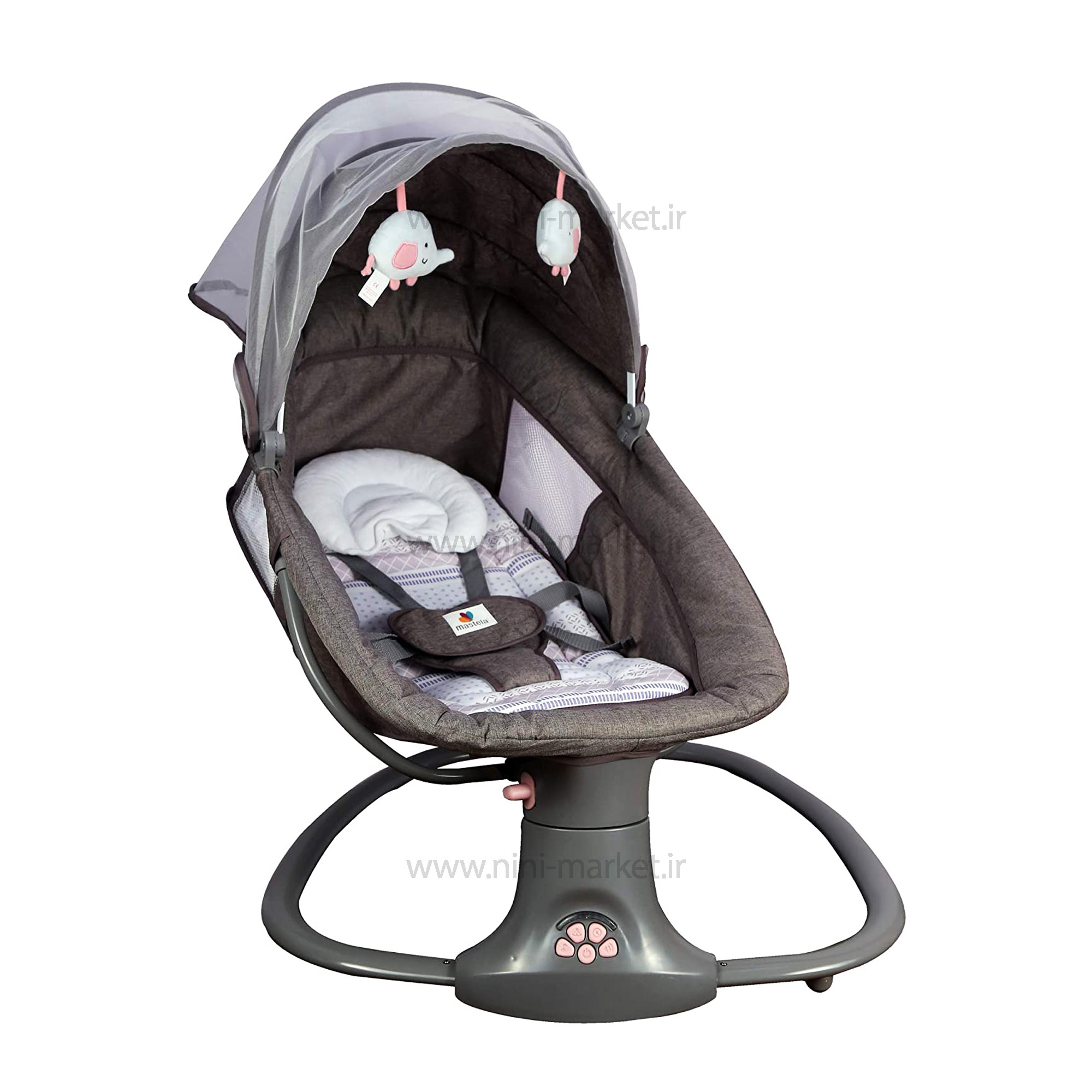 ني ني لاي لاي سه کاره برقي طوسی صورتی ماستلا Mastela از محصولات خواب نوزاد می باشد. این محصول را در واقع می توان یکی از محصولات بسیار جذاب برای استفاده نوزادان اشاره کرد. در واقع استفاده از نی نی و تاب برقی ها برای آرام کردن و خواب نوزادان کاربردهای زیادی دارند. بیشتر نوزادان با حرکت های متوازنی که گهواره ها به وجود می آورند بر سیستم اعصاب نوزادان اثر می گذارند گهواره های قدیمی و چوبی با دست حرکت می کردند ولی این محصول برقی بوده و استفاده از آن را برای والدین آسان و برای نوزاد شما لذت بخش می باشد. نوزدان جهت رشد جسمی و ذهنی بهتر نیازمند خواب و استراحت مناسب هستند .نوزدان در ماه های اولیه‌ی بدو تولد، بیشترین اوقات خود را در حال خواب و استراحت هستند. مکان خواب نوزاد باید ایمن و راحت باشد تا نوزاد بتواند به خوبی استراحت کند. گهواره برقی ماستلا بهترین گزینه برای خوابی راحت و ایمن کودک دلبندتان است .  اولین مورد در مورد این محصول به سبکی آن می توان اشاره کرد که در واقع وزنی در حدود 4 تا 5 کیلوگرم دارد . این ویژگی جابه جایی این محصول را برای والدین بسیار ساده و آساده می کند. حرکت های چپ و راست این محصول را می توان در ازدیگر ویژگی های آن که بسیار منحصر به فرد بود و برای اولین بار برند نونا امریکا در تولید نی نی لای لای و گهواره خود استفاده کرده این نوع حرکت ها می باشد. استفاده از این گهواره برای کودکانی که حداقل وزن 3 کیلویی را داشته می شوند توصیه می شود و در حالت گهواره حداکثر تا یک سالگی و در حالت صندلی راحتی کودک تا وزن 18 کیلوگرم که حدود 3 سالگی می شود به راحتی قابلیت استفاده دارد . گهواره 3 کاره ماستلا قابل اتصال به برق بوده و همچنین می توانید با ریموت کنترل از راه دور آن را کنترل کرد. توجه داشته باشید ، جهت اتصال دستگاه به برق باید از آداپتور موبایل استفاده کرد . دکمه های زیر نی نی لای لای برقی ماستلا mastella توسط یک کنترل کوچکی که در داخل جعبه محصول می باشد از راه دور کنترل می شود. 15 موزیک مخصوص نوزادان نیز به عنوان موزیک های اولیه قابلیت پخش دارد که بصدای پخش نیز به راحتی کم و زیاد می شود. آویز های عروسکی پولیشی محصول در سنین نوزادی توجه کودک را به خود جلب کرده و استفاده از این محصثول را بسیار ساده و آسان می کند. برای ایمنی نوزاد شما یک کمربند ایمنی برای استفاده کودکان تا یکسالی در نظر گرفته شده است. ابعاد این محصول نیز 20*30*60 سانتی متر می باشد که برای استفاده به عنوان صندلی برای کودکان تا 3 سالگی کاملا مناسب می باشد. تایمر این دستگاه 15/30/45 دقیقه می باشد. کارکرد این گهواره با برق و باطری می باشد. لوازم جانبی این دستگاه پشه بند و تشک های نرم و کنترل از راه دور آن می باشد. 5 سطح سرعت چرخش قابل تنظیم، شما می توانید آزادانه یک سرعت چرخش راحت را برای راحتی کودک خود انتخاب کنید