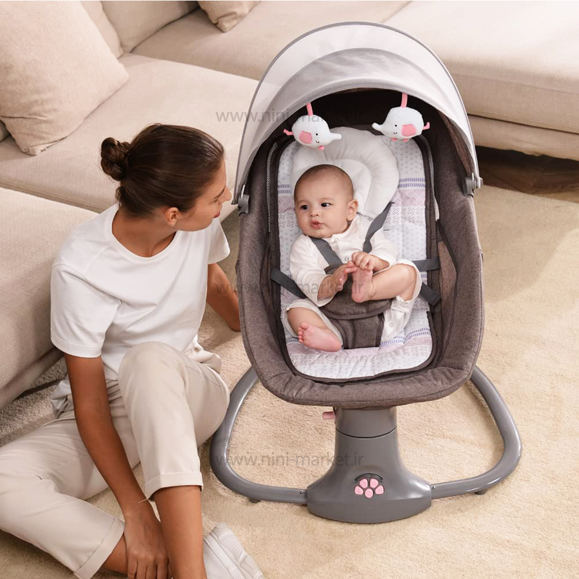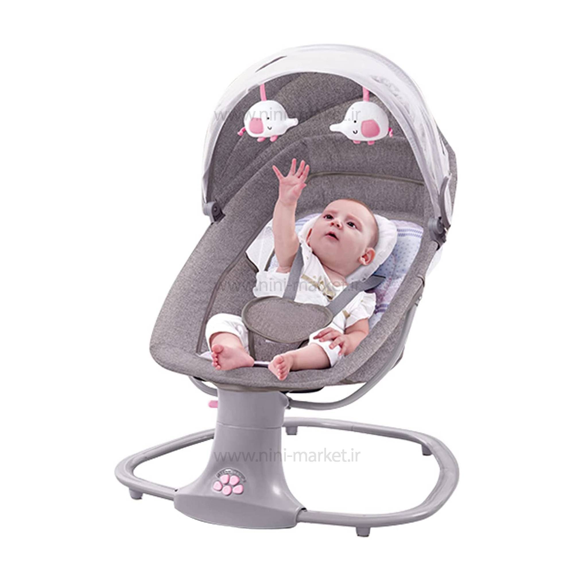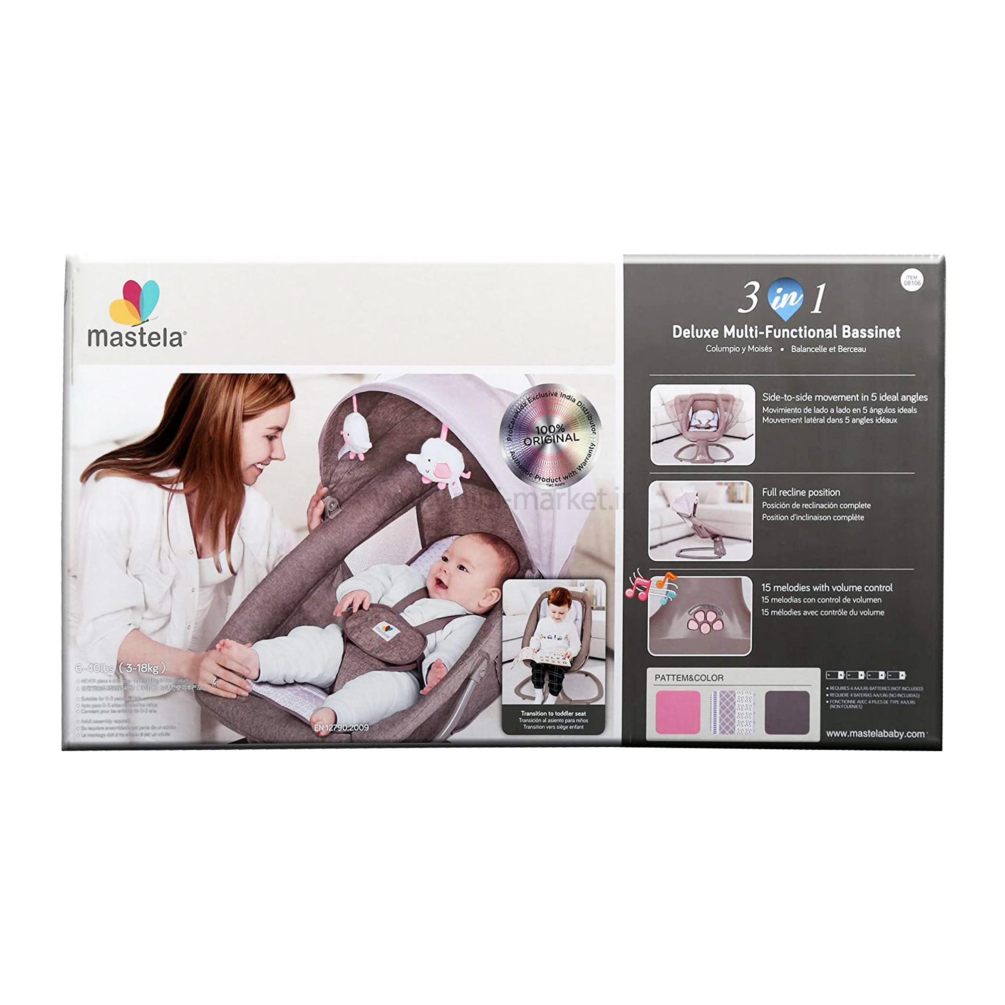 ني ني لاي لاي سه کاره برقي طوسی صورتی ماستلا Mastela از محصولات خواب نوزاد می باشد. این محصول را در واقع می توان یکی از محصولات بسیار جذاب برای استفاده نوزادان اشاره کرد. در واقع استفاده از نی نی و تاب برقی ها برای آرام کردن و خواب نوزادان کاربردهای زیادی دارند. بیشتر نوزادان با حرکت های متوازنی که گهواره ها به وجود می آورند بر سیستم اعصاب نوزادان اثر می گذارند گهواره های قدیمی و چوبی با دست حرکت می کردند ولی این محصول برقی بوده و استفاده از آن را برای والدین آسان و برای نوزاد شما لذت بخش می باشد. نوزدان جهت رشد جسمی و ذهنی بهتر نیازمند خواب و استراحت مناسب هستند .نوزدان در ماه های اولیه‌ی بدو تولد، بیشترین اوقات خود را در حال خواب و استراحت هستند. مکان خواب نوزاد باید ایمن و راحت باشد تا نوزاد بتواند به خوبی استراحت کند. گهواره برقی ماستلا بهترین گزینه برای خوابی راحت و ایمن کودک دلبندتان است .  اولین مورد در مورد این محصول به سبکی آن می توان اشاره کرد که در واقع وزنی در حدود 4 تا 5 کیلوگرم دارد . این ویژگی جابه جایی این محصول را برای والدین بسیار ساده و آساده می کند. حرکت های چپ و راست این محصول را می توان در ازدیگر ویژگی های آن که بسیار منحصر به فرد بود و برای اولین بار برند نونا امریکا در تولید نی نی لای لای و گهواره خود استفاده کرده این نوع حرکت ها می باشد. استفاده از این گهواره برای کودکانی که حداقل وزن 3 کیلویی را داشته می شوند توصیه می شود و در حالت گهواره حداکثر تا یک سالگی و در حالت صندلی راحتی کودک تا وزن 18 کیلوگرم که حدود 3 سالگی می شود به راحتی قابلیت استفاده دارد . گهواره 3 کاره ماستلا قابل اتصال به برق بوده و همچنین می توانید با ریموت کنترل از راه دور آن را کنترل کرد. توجه داشته باشید ، جهت اتصال دستگاه به برق باید از آداپتور موبایل استفاده کرد . دکمه های زیر نی نی لای لای برقی ماستلا mastella توسط یک کنترل کوچکی که در داخل جعبه محصول می باشد از راه دور کنترل می شود. 15 موزیک مخصوص نوزادان نیز به عنوان موزیک های اولیه قابلیت پخش دارد که بصدای پخش نیز به راحتی کم و زیاد می شود. آویز های عروسکی پولیشی محصول در سنین نوزادی توجه کودک را به خود جلب کرده و استفاده از این محصثول را بسیار ساده و آسان می کند. برای ایمنی نوزاد شما یک کمربند ایمنی برای استفاده کودکان تا یکسالی در نظر گرفته شده است. ابعاد این محصول نیز 20*30*60 سانتی متر می باشد که برای استفاده به عنوان صندلی برای کودکان تا 3 سالگی کاملا مناسب می باشد. تایمر این دستگاه 15/30/45 دقیقه می باشد. کارکرد این گهواره با برق و باطری می باشد. لوازم جانبی این دستگاه پشه بند و تشک های نرم و کنترل از راه دور آن می باشد. 5 سطح سرعت چرخش قابل تنظیم، شما می توانید آزادانه یک سرعت چرخش راحت را برای راحتی کودک خود انتخاب کنید