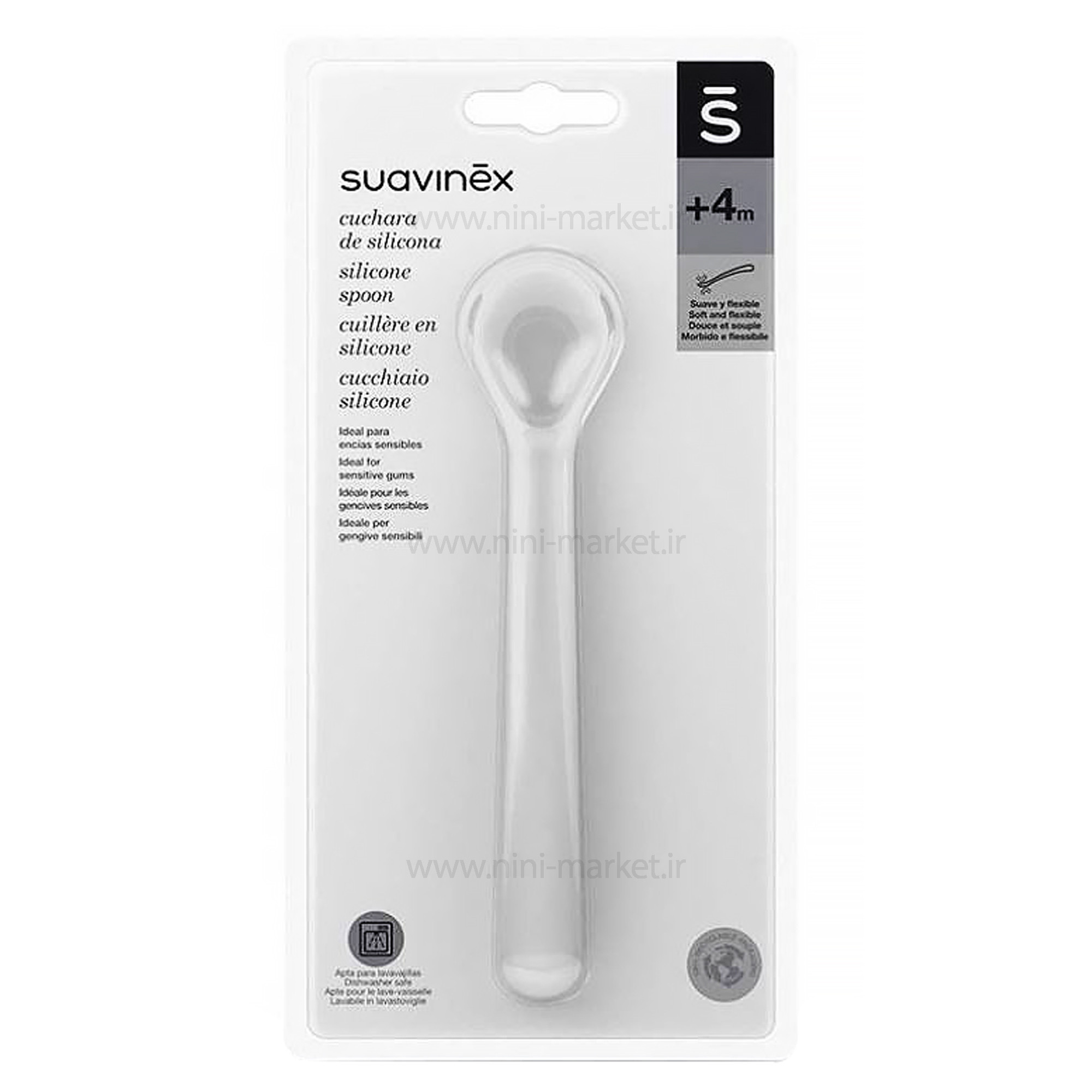 قاشق سیلیکونی رنگ طوسی +4 ماه سواوینکس Suvainex محصول کشور اسپانیا می باشد. قاشق جنس ۱۰۰ درصد سیلیکونی و نرمی دارد و سری آن منعطف و دارای لبه‌های نرم است که به دهان و دندان کودک آسیبی نمی رساند. همچنین به خاطر نرم بودن جنس آن می توان به کودک اجازه داد با استفاده از این قاشق به تنهایی غذا بخورد.قاشق کودک طراحی زیبا و مقاومی دارد و دسته آن ارگونومیک و مناسب برای به دست گرفتن نوزاد است.  قاشق سیلیکونی دسته بلند سواوینکس از کیفیت ساخت بالایی برخوردار است و فاقد مواد مضر مانند بیسفنول آ می باشد. این قاشق مناسب برای کودکان بالای ۴ ماه است. قاشق قابل شستشو به صورت دستی و یا با ماشین ظرف شویی می باشد.
