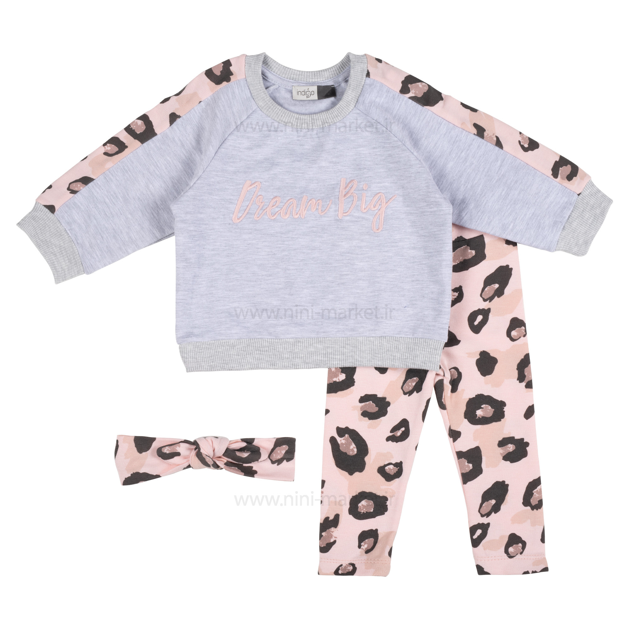 بلوز شلوار دخترانه طرح پلنگی رنگ طوسی صورتی ایندیگو Indigo