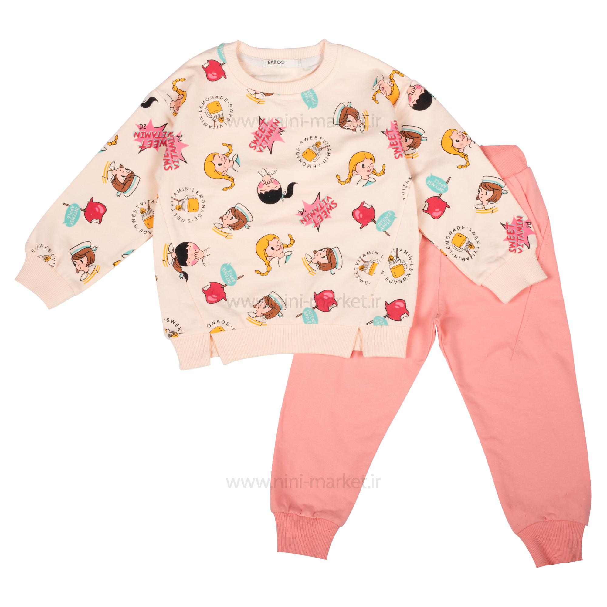ست دوتکه بلوز و شلوار طرح دختر و آبمیوه رنگ سفید و گلبهی رابو Raboo