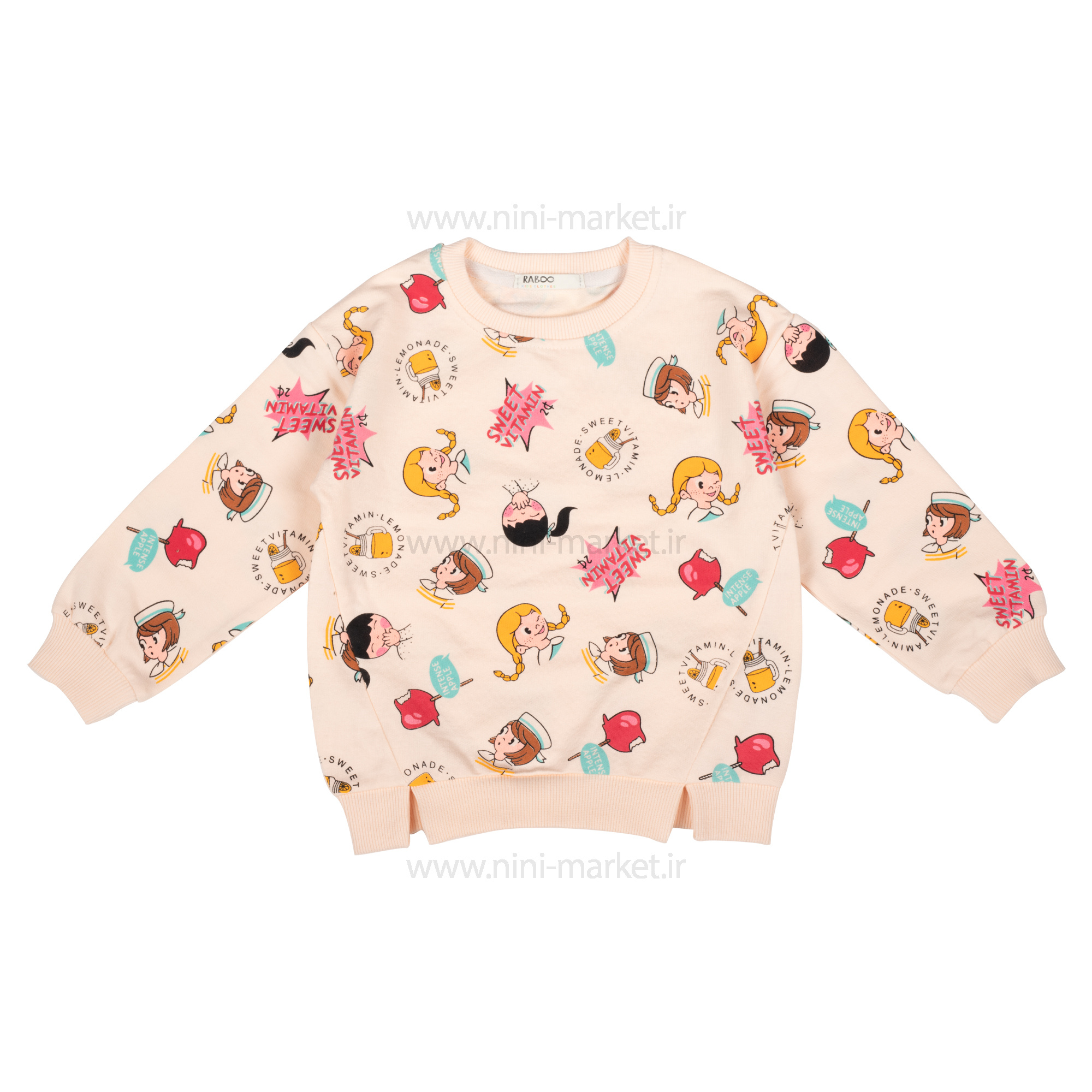 ویژگی ست دوتکه بلوز و شلوار طرح دختر و آبمیوه رنگ سفید و گلبهی رابو Raboo