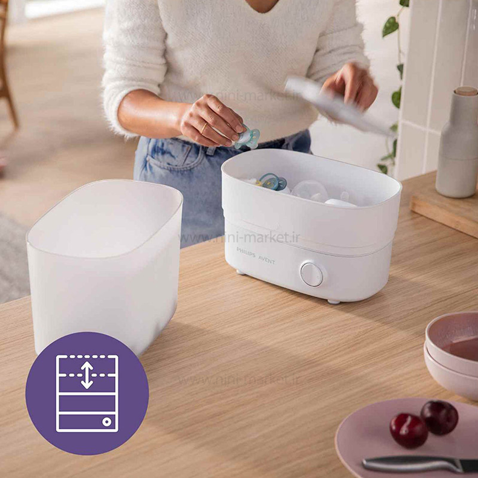 دستگاه ضدعفونی کننده باریک است و هنوز هم تا شش شیشه شیر Philips Avent را در خود جای می دهد. همچنین با تمام لوازم ضروری دیگر، از سرپستانک و پستانک گرفته تا شیردوش سینه دستی ، مناسب است.