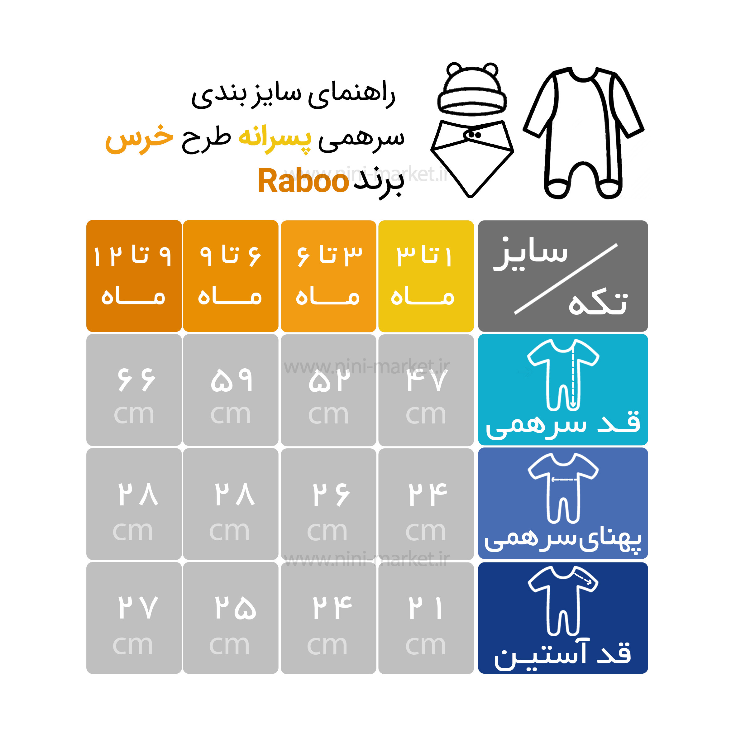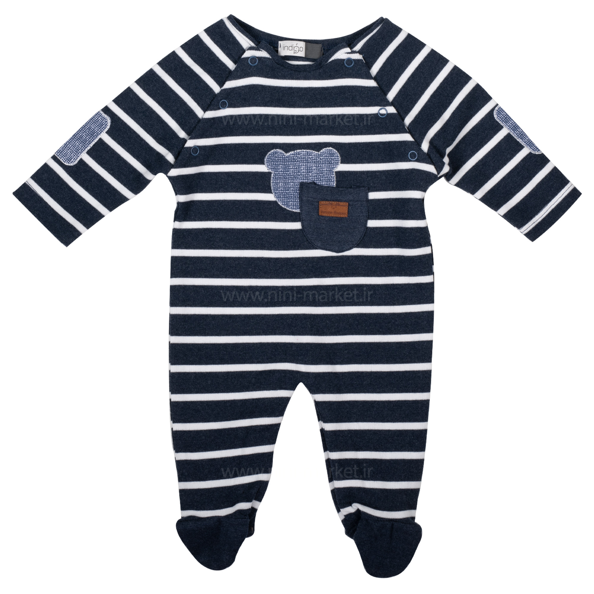 سرهمی پسرانه طرح خرس با کلاه و پیشبند جورابدار بوده تا از ورود سرما به بدن کودک دلبندتان جلوگیری کند. رنگ زمینه آن سرمه ای با راه راه های سفید و روی لباس طرح خرس به صورت تکه دوزی و گل دوزی در آمده است . این سرهمی از جنس نخ پنبه پشمی مناسب برای فصل های پاییز و زمستان می باشد. لطافت محصول و کیفیت دوخت عالی یکی از صفات مهم این سرهمی است. پس از مشاهده سرهمی جوراب دار راه راه نزدیک به کیفیت بالای دوخت و پارچه آن پی خواهید برد. جلوی لباس از یقه تا به حلقه آستین آن از هر سمت 3 عدد دکمه تعبیه شده تا راحت آن را به کودک دلبندتان بپوشانید . جوراب دار بودن این لباس از سرد شدن و کثیف شدن پاهای نوزاد جلوگیری می کند. همچنین همراه با این سرهمی پسرانه یک کلاه و پیشبند وجود دارد که از سر و گوش های در برابر سرما مافظت می کند .