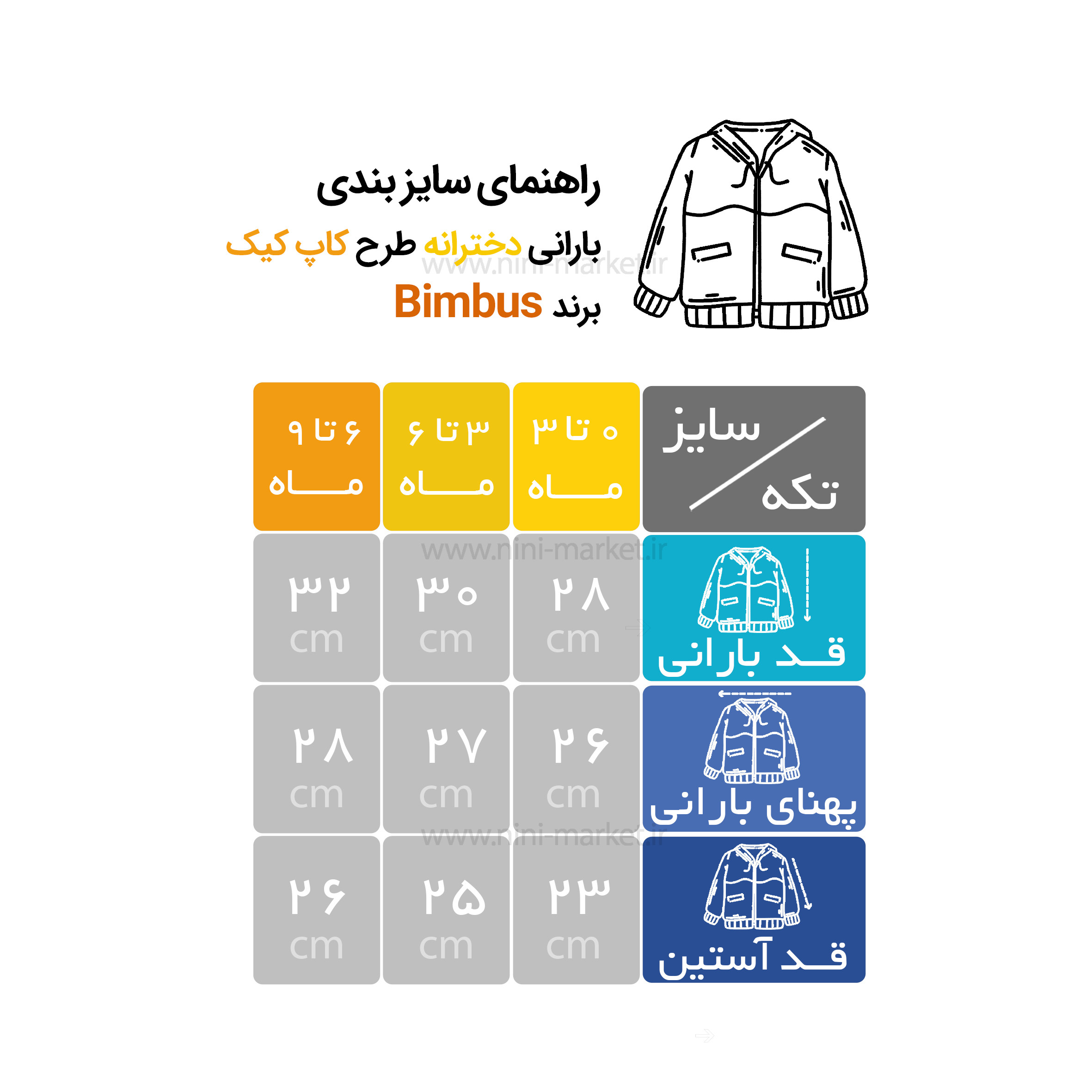 بارانی دخترانه طرح کاپ کیک Bimbus پوشاکی است ضد آب و مقاوم در برابر نفوذ آب که مناسب فصل پاییز که در هنگام باراش باران میتوان آن را به کودکانتان بپوشانید . بارانی بیمباس بسیار سبک و راحت ، فرزند دلبندتان را در برابر باد محافظت کرده و همچنین پوشاندن این محصول با داشتن زیپ بسیار روان در جلوی آن بسیار راحت می باشد.برای شست و شوی این محصول میتوان هم به صورت دستی و هم از ماشین لباسشویی بدون هیچ رنگ دهی استفاده نمود. این بارانی ضد آب از کودکان شما در برابر باران محافظت میکند و آنها را در پیادهروی شما همراهی میکند. این محصول در جیب خود جمع میشود و فضای کمی را اشغال میکند و میتوان آن را در یک کولهپشتی حمل کرد.