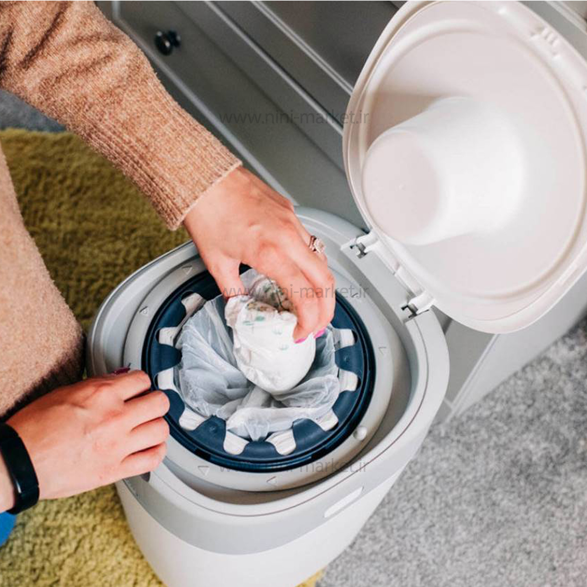 به سادگی درب آن را باز کرده و پوشک استفاده شده را داخل آن قرار دهید تا چنگ بزند. دسته را بچرخانید تا کلیک کند. درب را ببندید، تمام شد! فشار دهنده یکپارچه پوشک را به داخل سطل فشار می دهد - دستان شما تمیز می مانند.