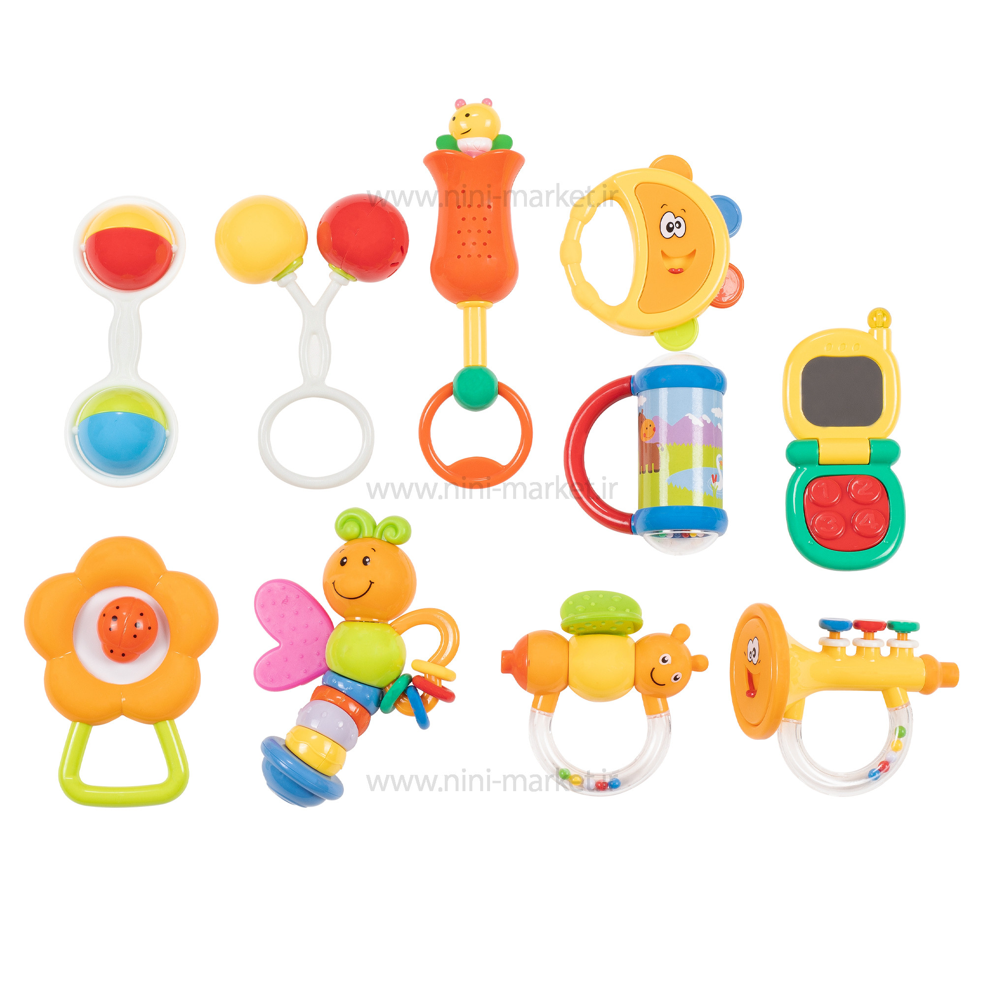 پک جغجغه طرح خرس کلاه کج مجموعه ای از انواع جغجغه های مختلف رنگارنگ کوچک و جذاب برای نوزاد دلبندتان است . این پک جغجغه دارای 10 جغجغه جذاب با شکل های متنوع رنگی است . شامل 2 دندانگیر به شکل زنبور و پروانه که بال های آن ها سیلیکونی میباشد که وهیچ آسیبی به لثه و دندان های کودک نمی زند . این بازی موجب تقویت مهارت های حرکتی ، تقویت حس شنوایی و بینایی میشود . به دلیل فرم و سایز آن ها کودک میتواند به راحتی در دست بگیرد و مشغول بازی شود . ترکیبی از رنگ های مختلف که باعث میشود کودک سریع تر روی شناخت رنگ ها گام بردارد.