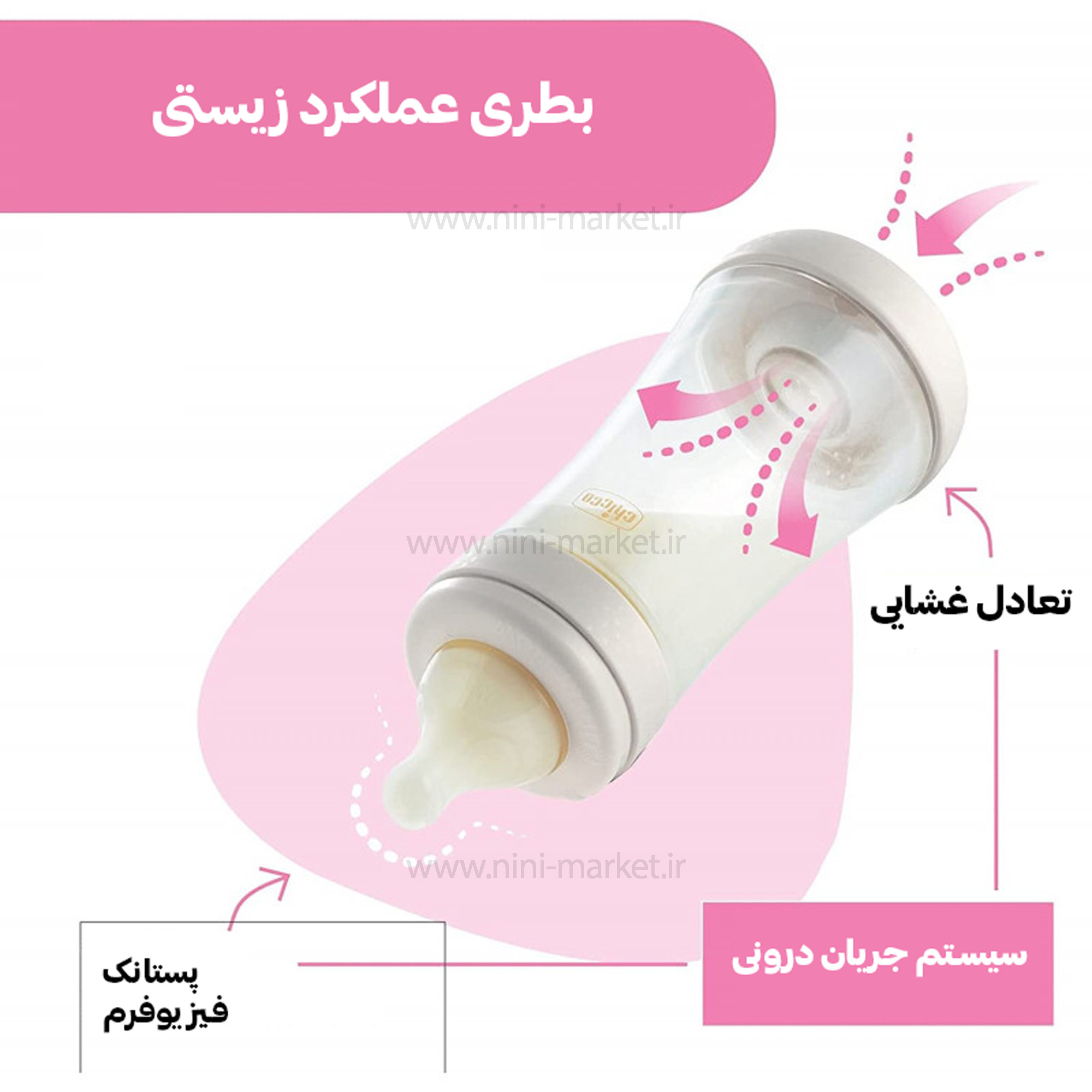 شیشه شیر پرفکت 0+ ماه چیکو که 150 میل است که سری آن دارای جریان شیر 1 قطره ای می باشد. شیشه شیر چیکو تهیه شده از پلاستیک مرغوب که فاقد هرگونه مواد مضر است مامان ها می توانند با خیال راحت این شیشه شیر را به صورت آنلاین از سایت ما یعنی Nini Market سفارش بدهند تا در اسرع وقت ما این محصول را بدستان برسانیم. شیشه شیر یکی از اقلام ضروری سیسمونی نوزاد است که باید در انتخاب آن بسیار دقت کنید. محصول فوق از مواد معدنی شیر در بطری حفاظت می کند و هیچ گونه تغییری در طعم رنگ و بو شیر ایجاد نمی کند. جنس بدنه آن طلق و نشکن و بسیار سبک است که به راحتی می توانید در ساک لوازم کودک بگذارید و با خود حمل کنید. یکی از ویژگی های منصر به فرد شیشه شیر پرفکت چیکو آنتی کولیک و ضد نفخ بودن آن می باشد که اجازه نمیده نوزاد دلبندتان دل درد بگیرد و یک گزینه ی ایده آل برای استفاده روزمره نوزادتان می باشد. شیشه شیر ضد قولنج Chicco Perfect5 با ریتم بیولوژیکی کودک سازگار است. Perfect5 تنها شیشه شیر با سیستم نوآورانه intuy-flow است که توسط Chicco ثبت شده است، عملکرد ترکیبی انحصاری نوک پستان فیزیولوژیکی با غشای تعادلی که مصرف بصری و فیزیولوژیکی را تسهیل میکند و به طور طبیعی میزان مکش و شدت مکش هر نوزاد را در هر شات افزایش میدهد. غشای تعادلی، در پایه بطری، باعث میشود که هوا بدون مخلوط شدن با شیر وارد بطری شود، از ایجاد خلاء در داخل بطری جلوگیری میکند و باعث میشود که بدون وقفه یا غرق شدن، بدون وقفه یا غرق شدن، وارد بطری شود. این یک دریچه ضد برخورد انعطاف پذیر است که به لطف حرکات ریز خود به طور مداوم با میزان مکش سازگار می شود و دائماً با مقدار هوای موجود در بطری تطبیق می یابد که ناشی از میزان مکش کودک در آن شات است. یک نوک پستان نرم و انعطاف پذیر با روکش Soft Sense تجربه مکیدن لذت بخش و طبیعی را به کودک شما می دهد. انعطاف پذیری دریچه ضد کولیک پویا به شما این امکان را می دهد که با حرکات میکرو به نیازهای کودک پاسخ دهید - بسته به شدت مکش، جریان هوا به طور مداوم تنظیم می شود و تغذیه صاف و منظم، بدون وقفه و تنگی نفس را تضمین می کند. شکل متقارن، مسطح و کشیده: تقلید از نوک پستان مادر، که هنگام مکیدن نوزاد کمی تغییر شکل می دهد - پستانک دراز و پهن می شود تا حرکات طبیعی زبان را در حین مکیدن سینه تقویت کند. مکیدن آسان: پستانک از روش فیزیولوژیکی مکیدن کودک پیروی می کند. دریچه ضد کولینگ: در پایه سرپستانک قرار دارد، از فرو ریختن پستانک جلوگیری می کند و از بلعیدن هوا توسط کودک جلوگیری می کند، در نتیجه دوره های قولنج را کاهش می دهد و اجازه می دهد تا غذای آرام و آرامی بخورد.